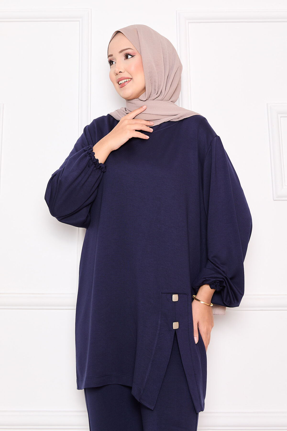 - Ürün mevsimliktir. Tunik pantolon ikili kombinimiz.Tunil önden mini yırtmaçlı ve düğme detaylı. Pantolon belden lastikli paçaları düğme aksesuar detaylıdır.