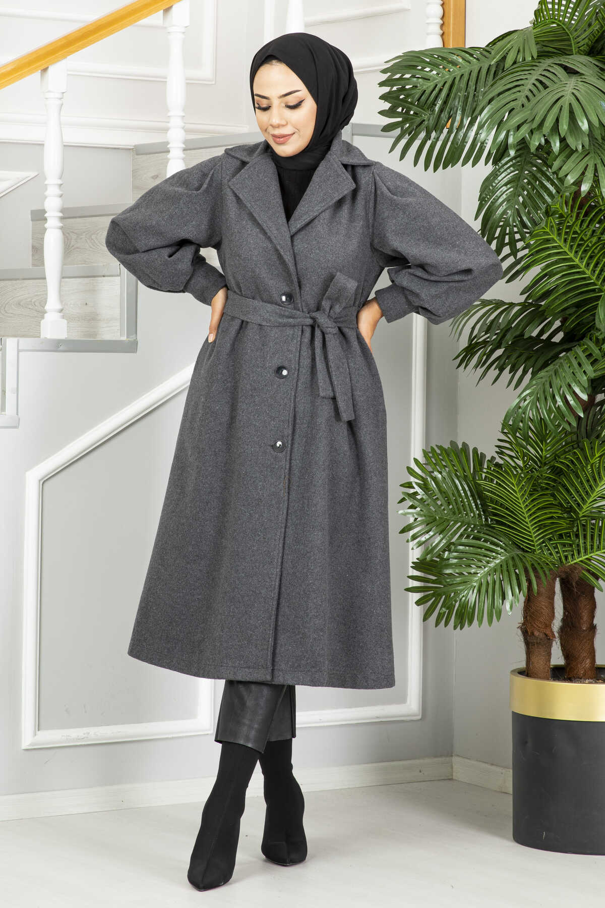 Düğmeli Beli Kuşaklı Tesettür Kaşe Kaban Füme