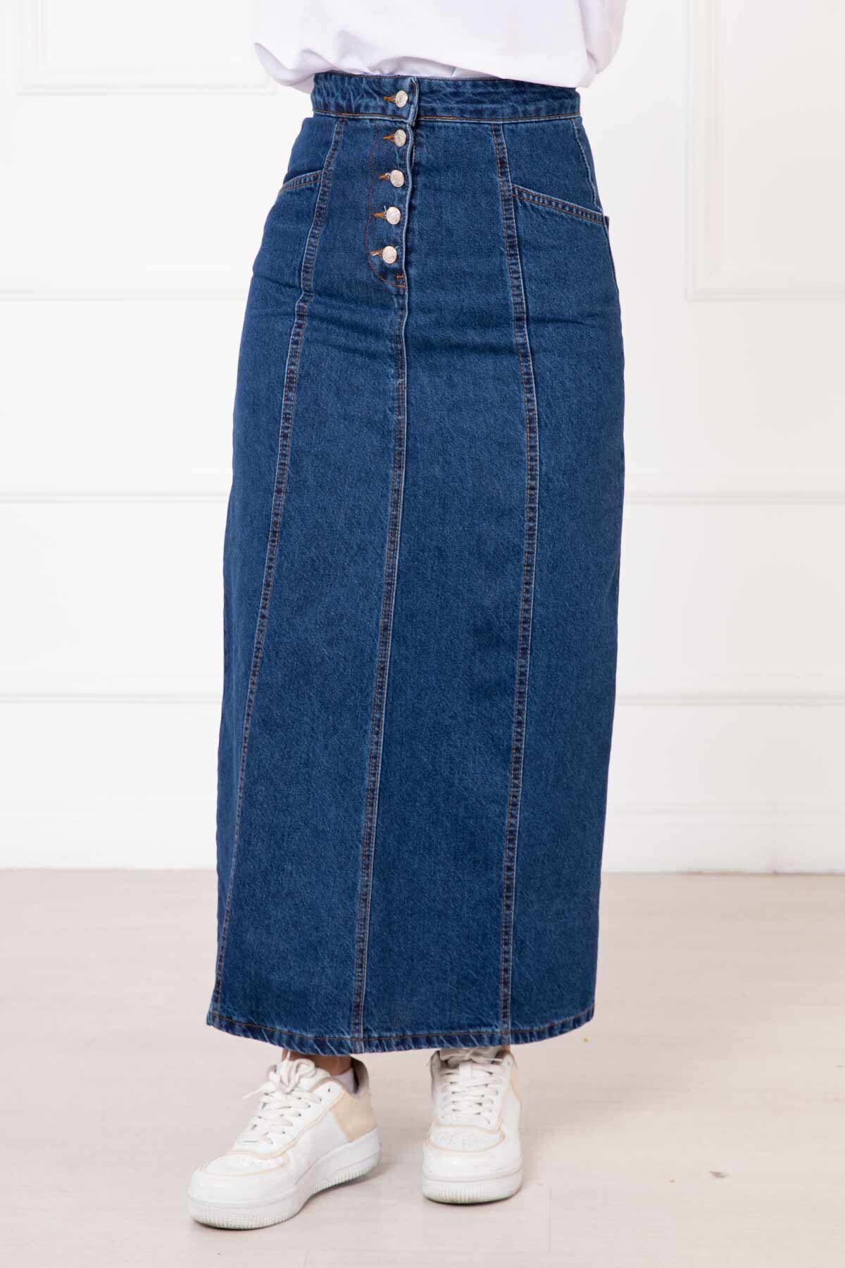 Düğmeli Cepli Kot Etek Koyu Mavi