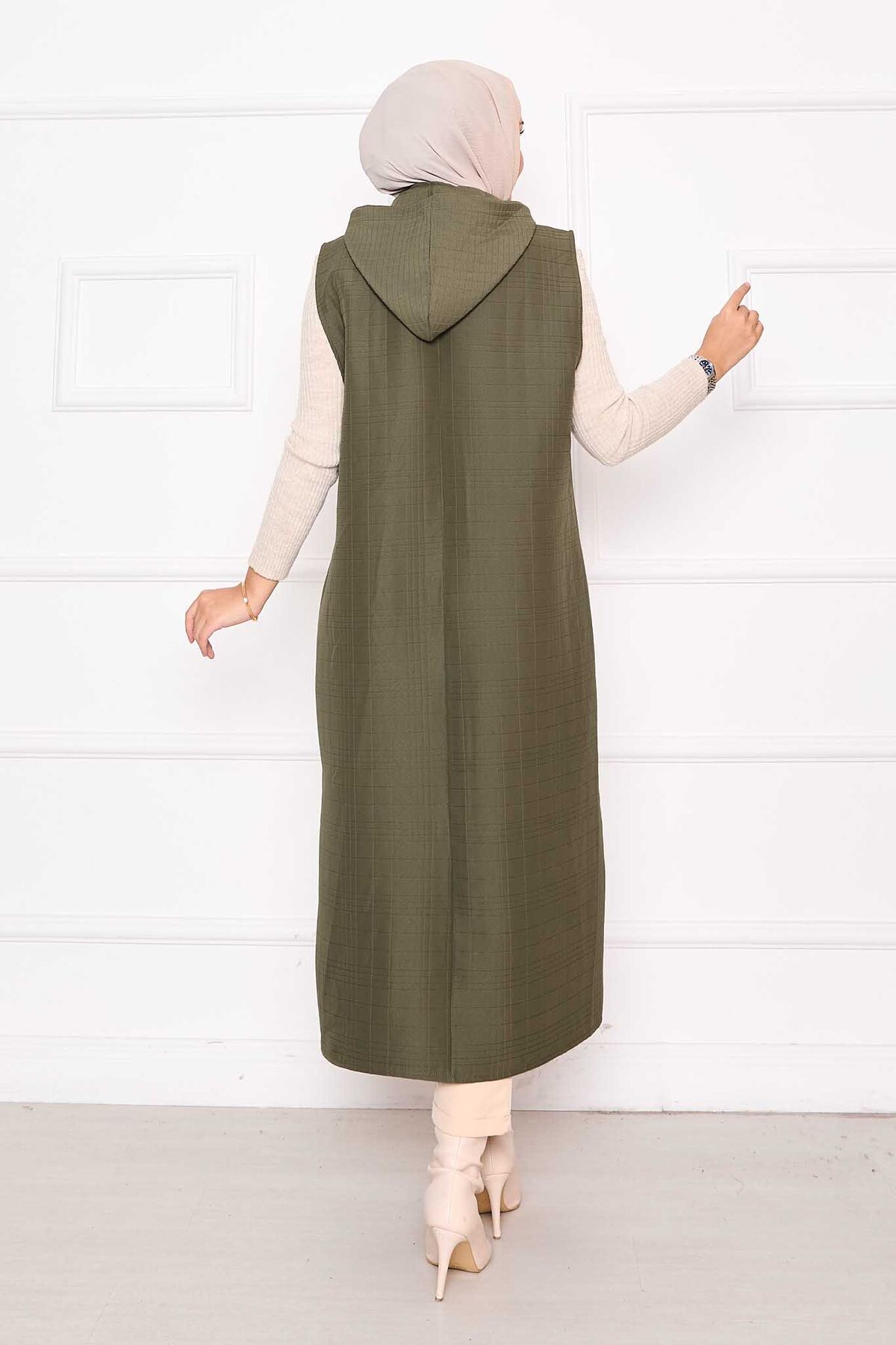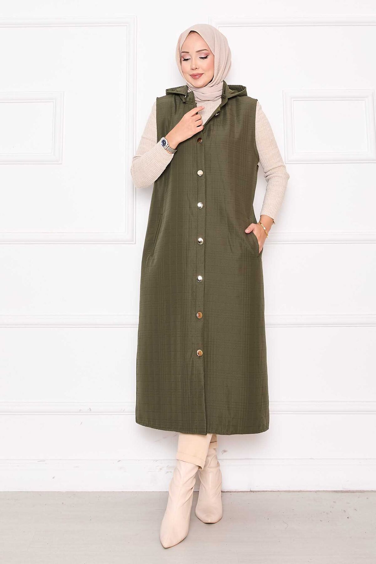 Düğmeli & Kapüşonlu Uzun Kapitone Yelek Haki