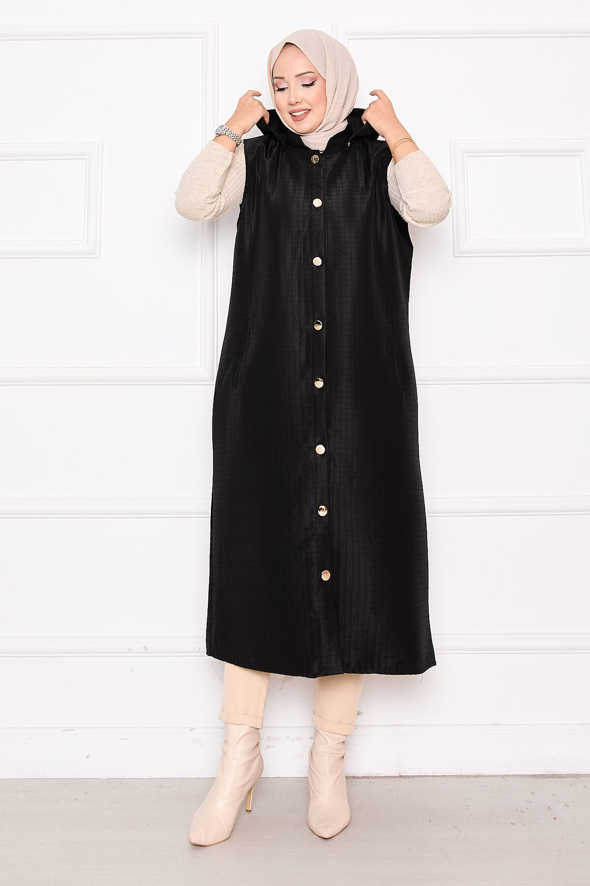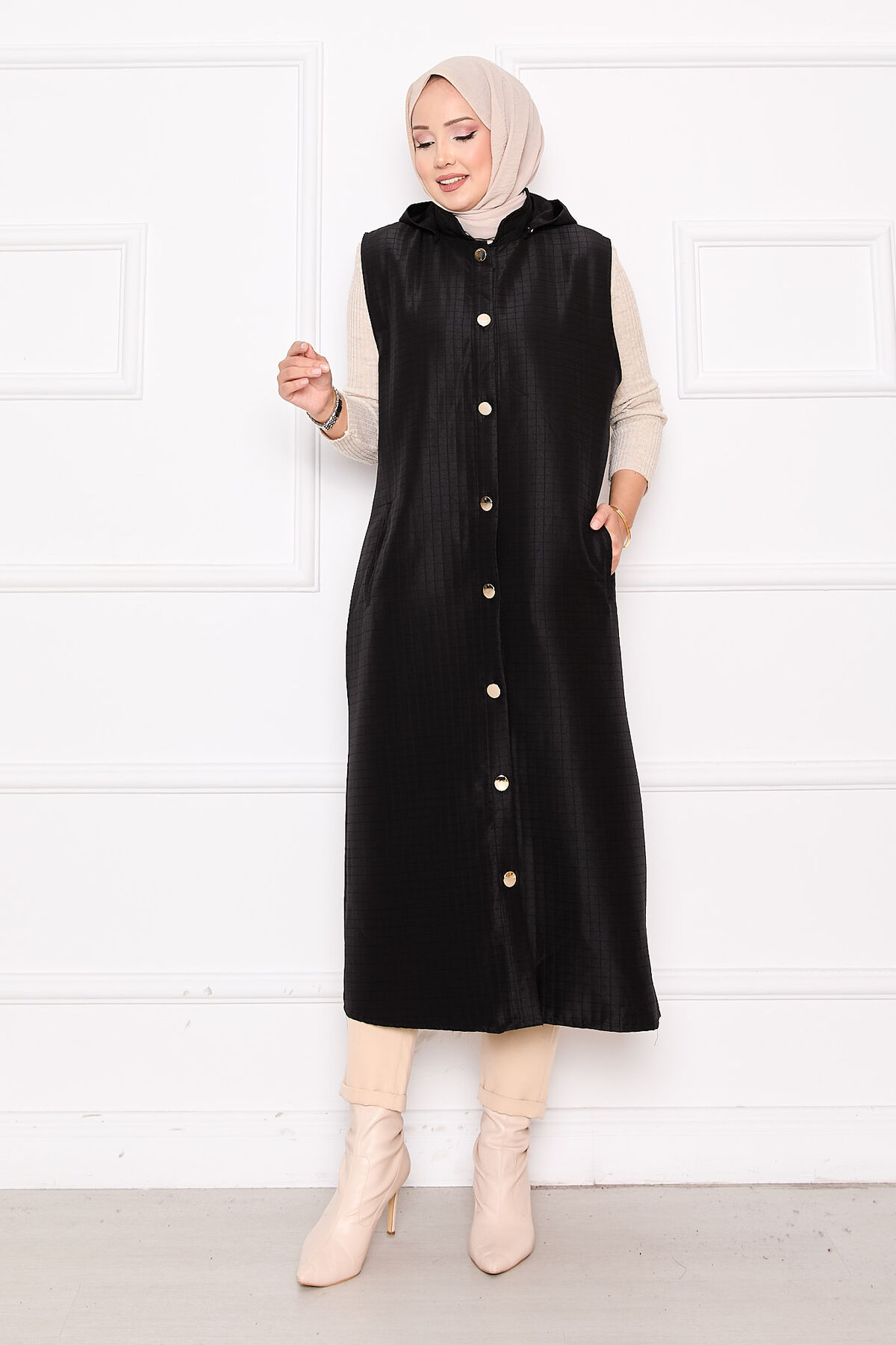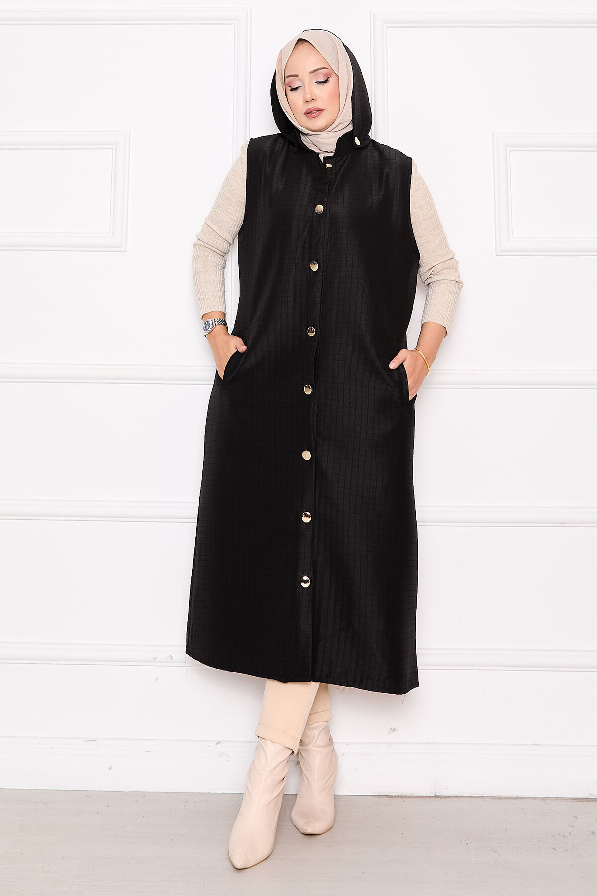 Düğmeli & Kapüşonlu Uzun Kapitone Yelek Siyah