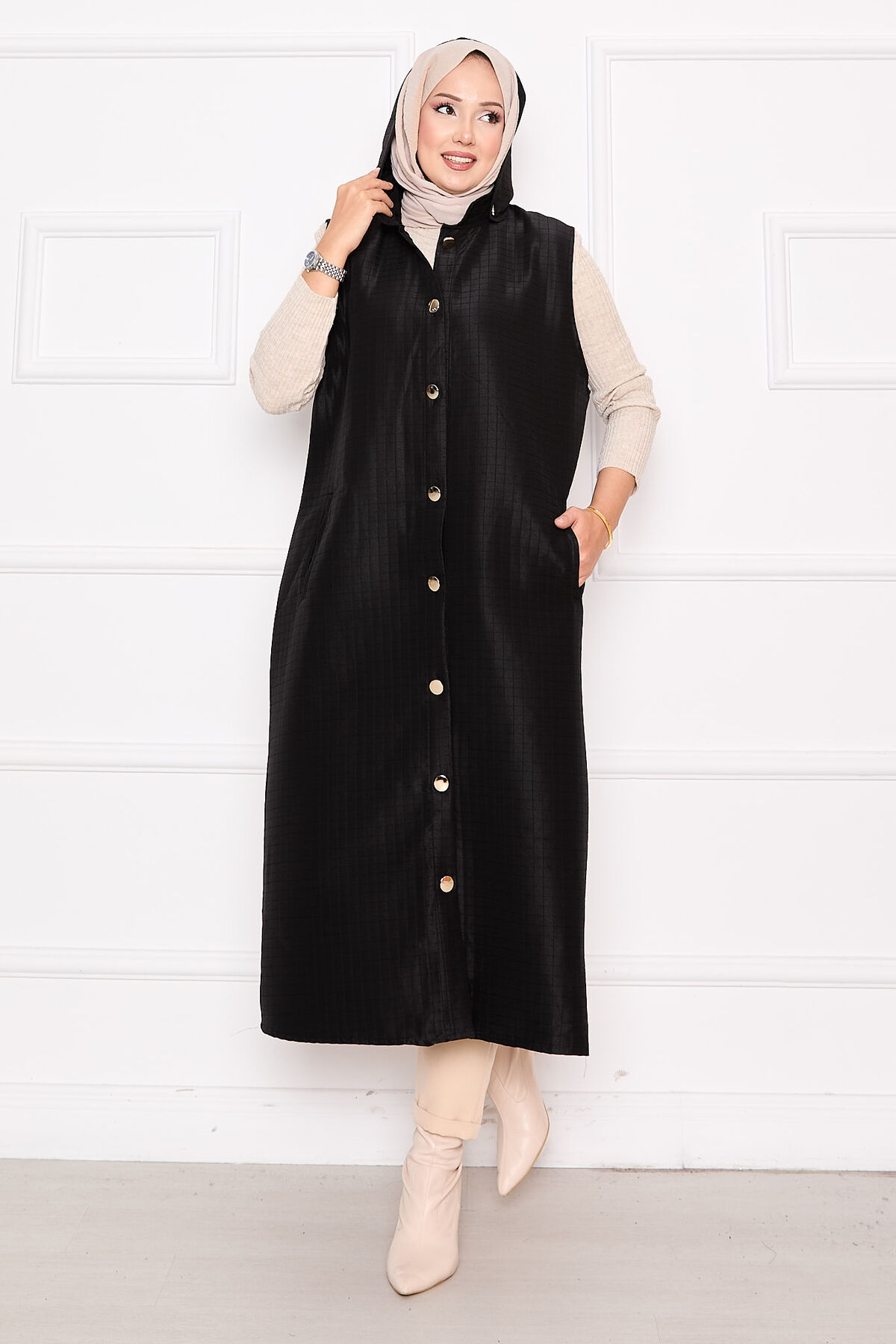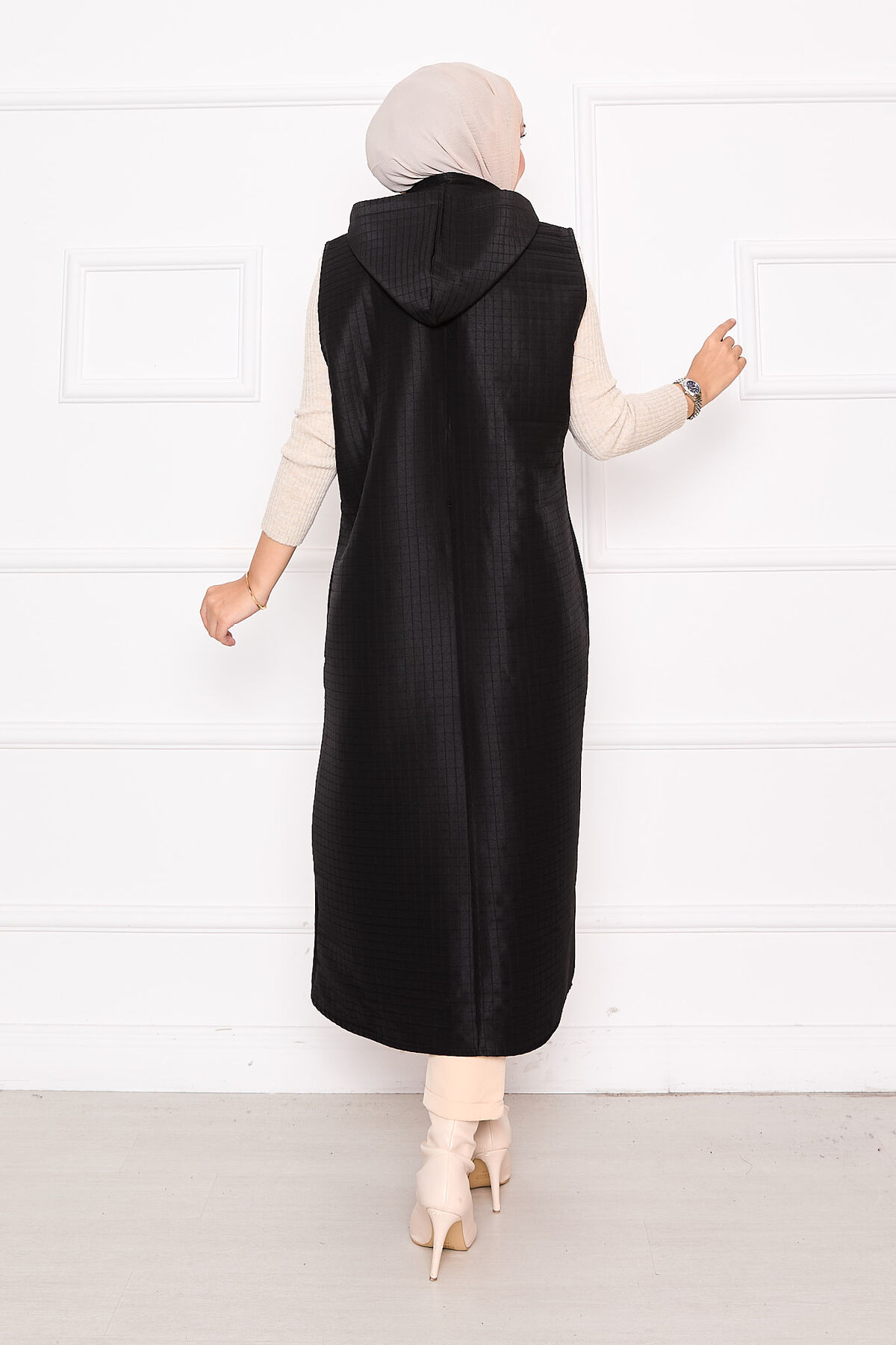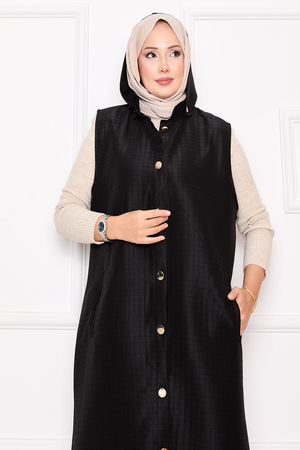 Düğmeli & Kapüşonlu Uzun Kapitone Yelek Siyah