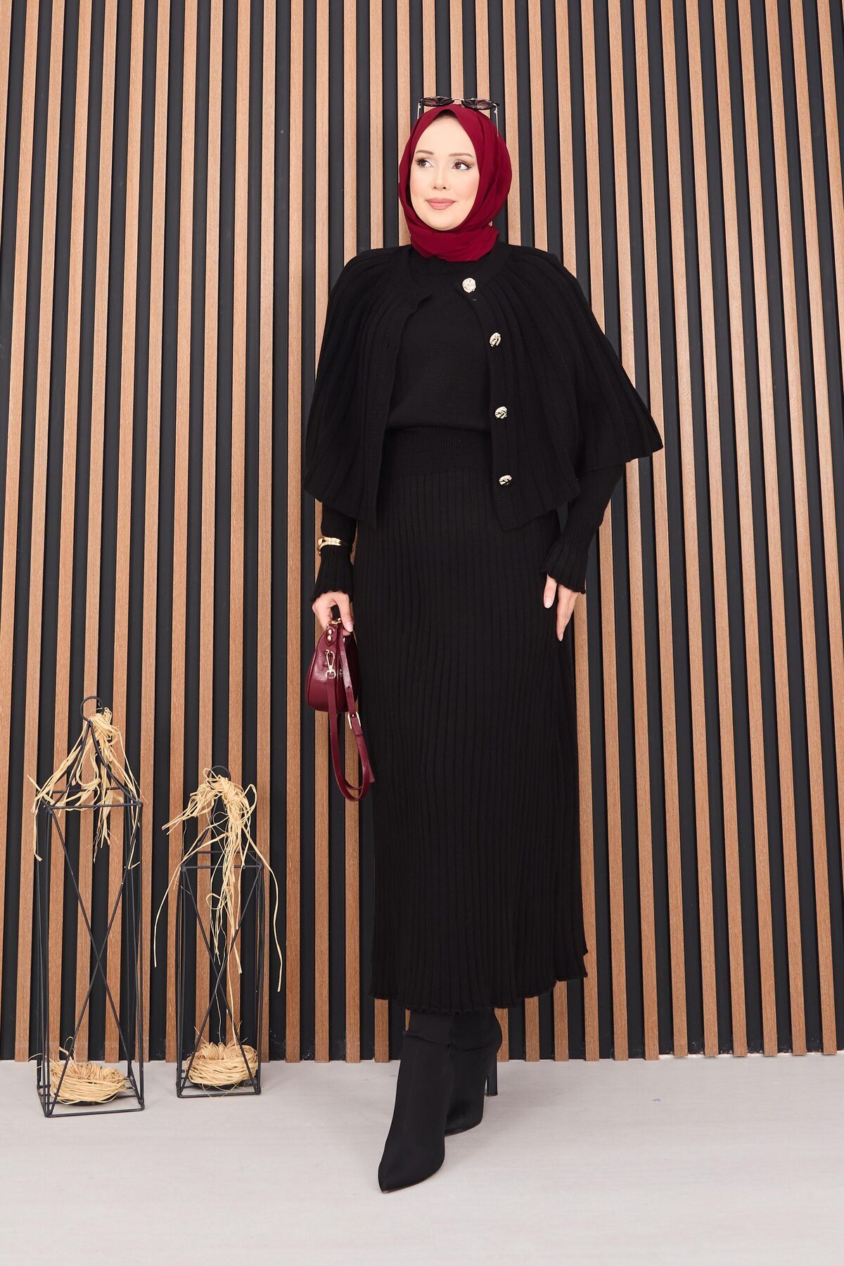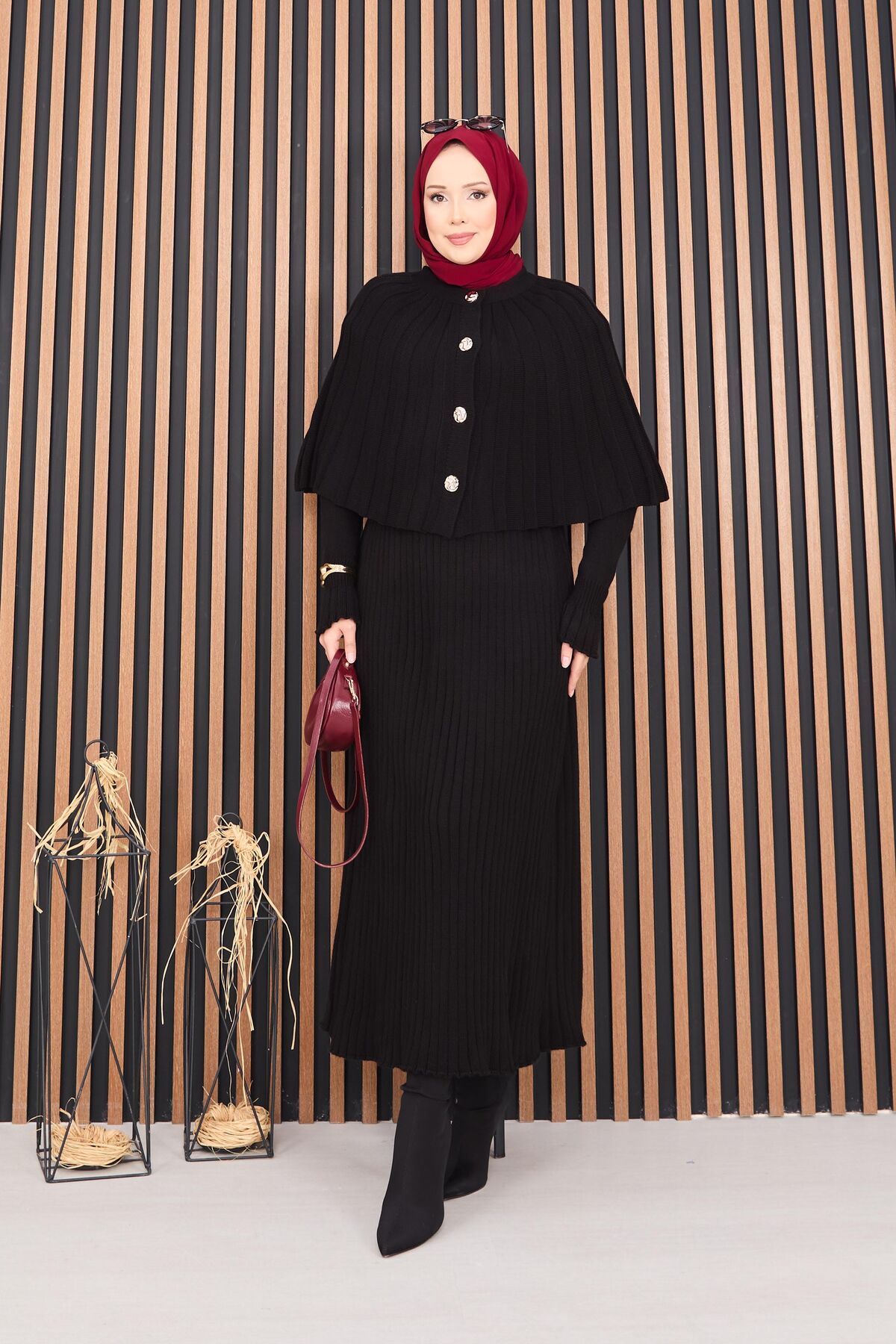 Düğmeli Pelerin & Triko Elbise Tesettür İkili Takım Siyah