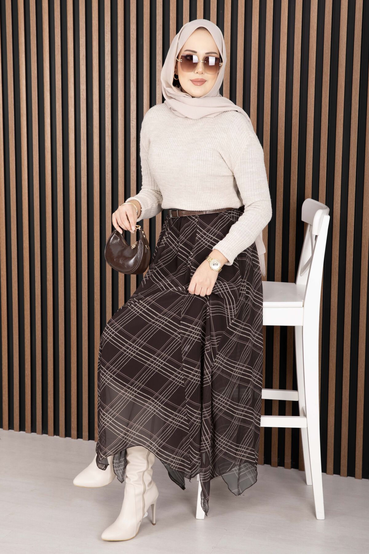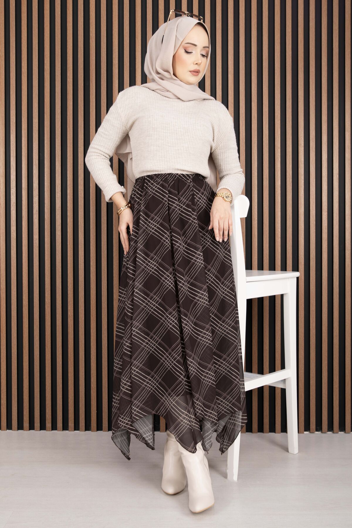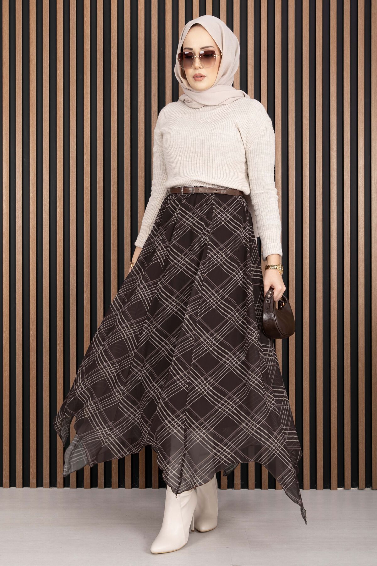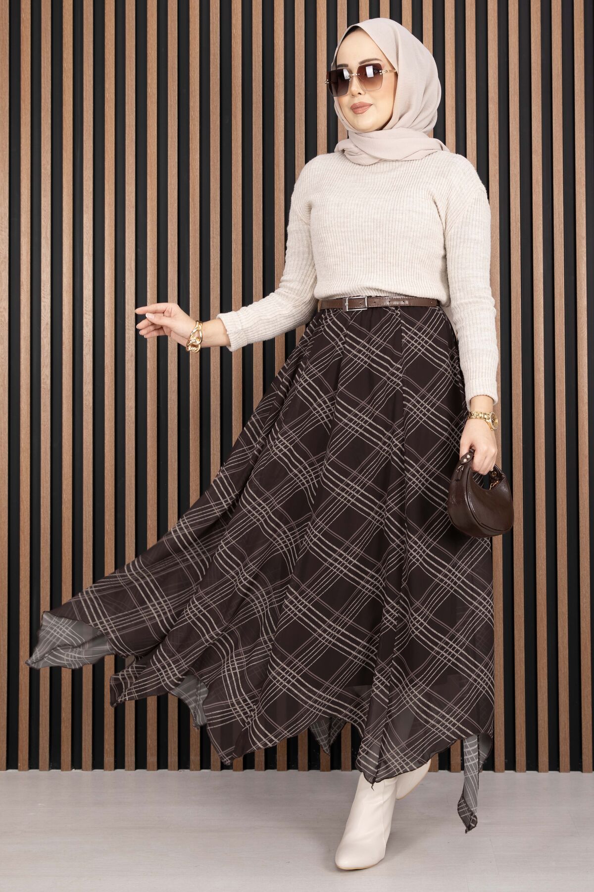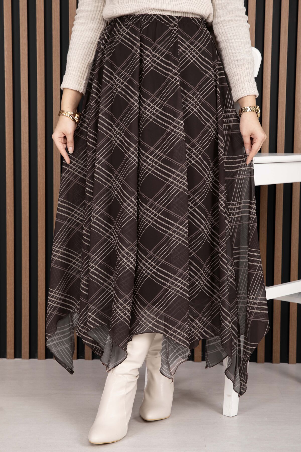 Asimetrik Kesim Ekose Şifon Etek Kahve