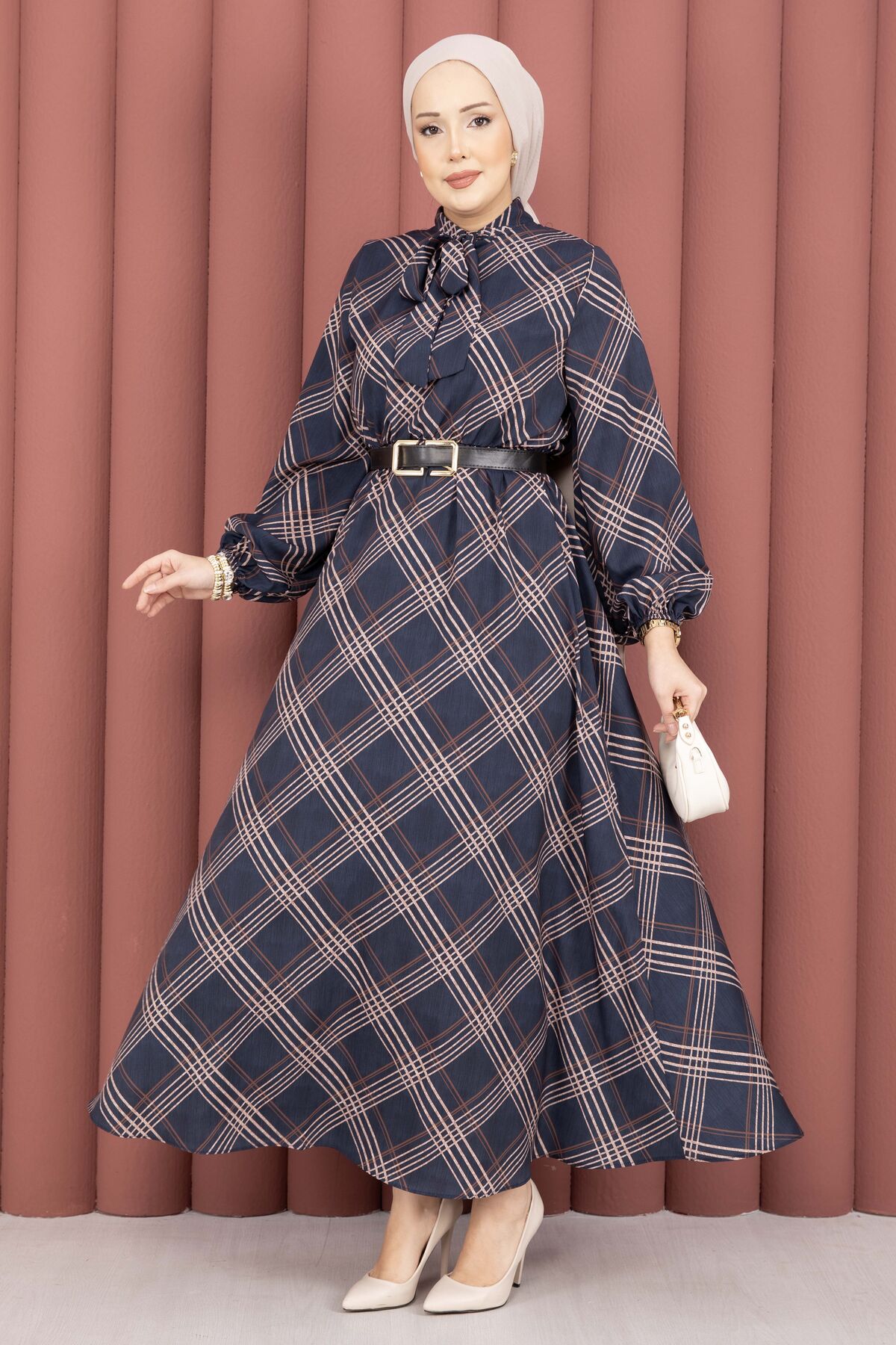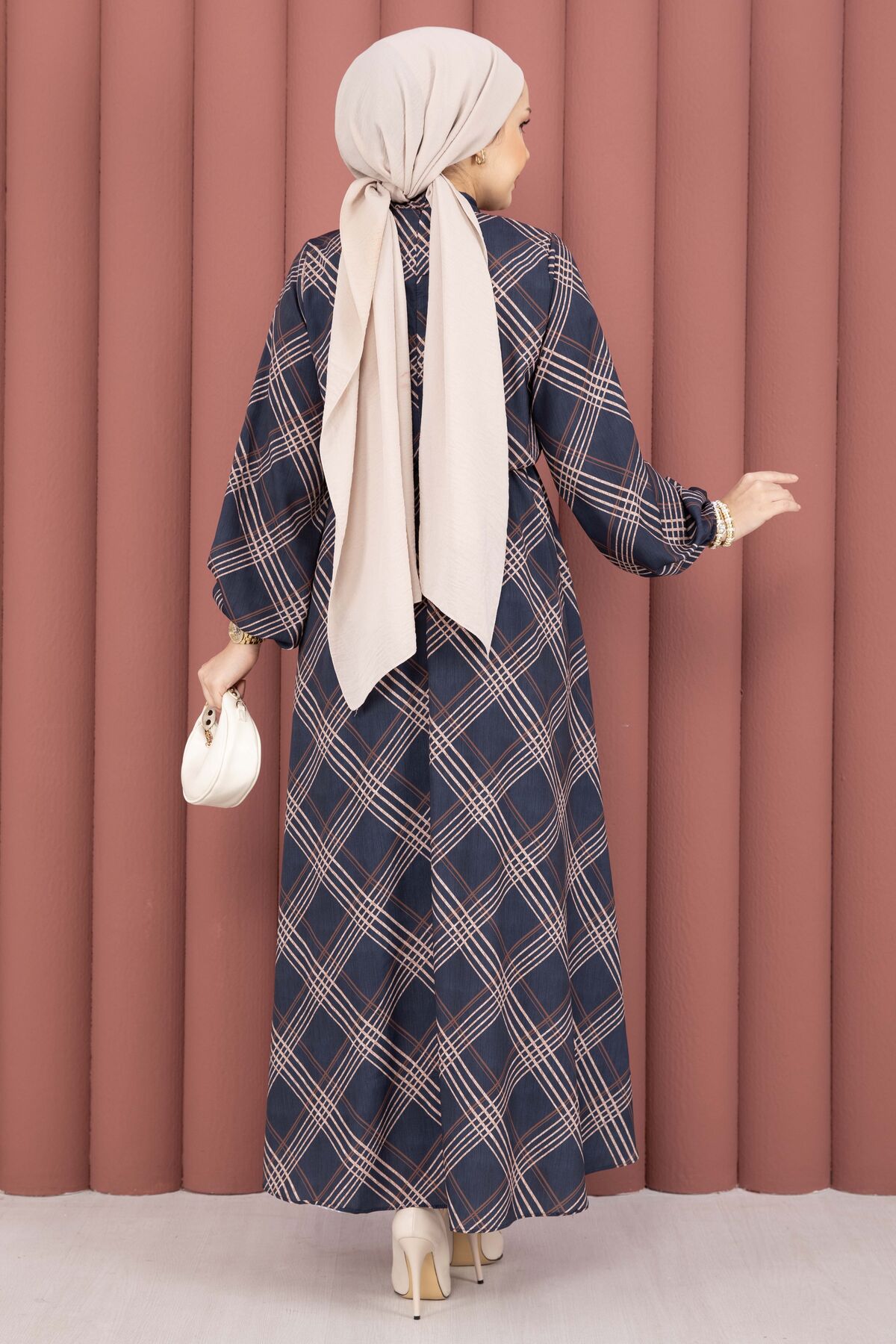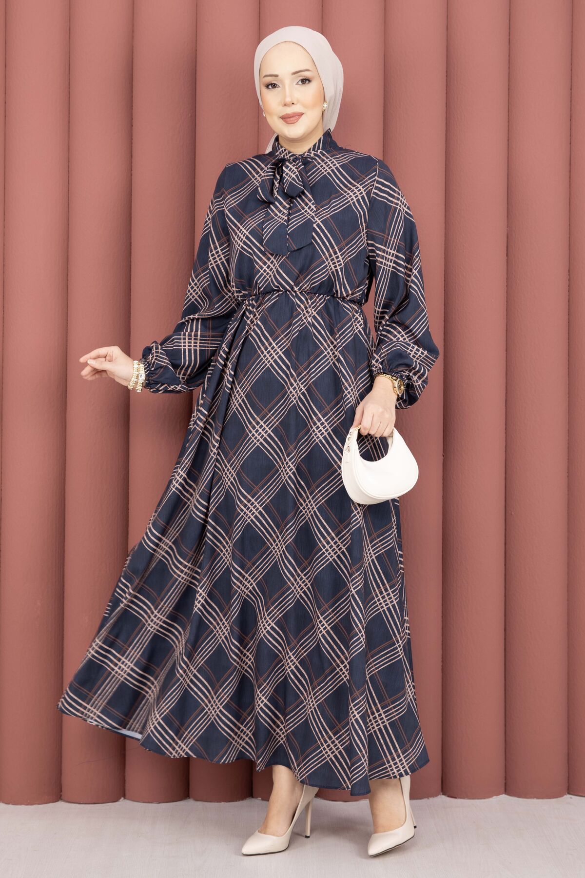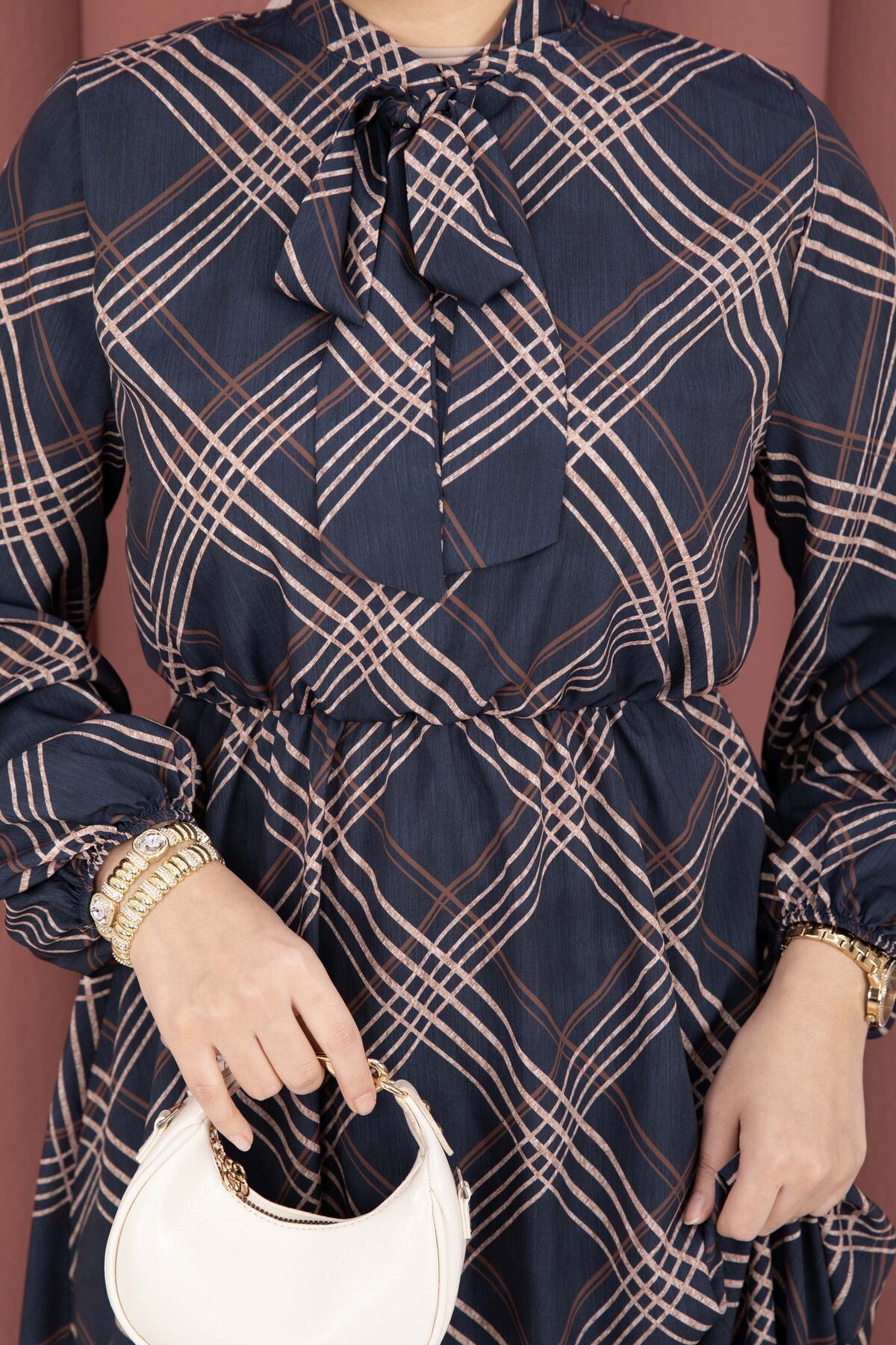 Ekose Desen Beli Büzgülü Tesettür Elbise Lacivert