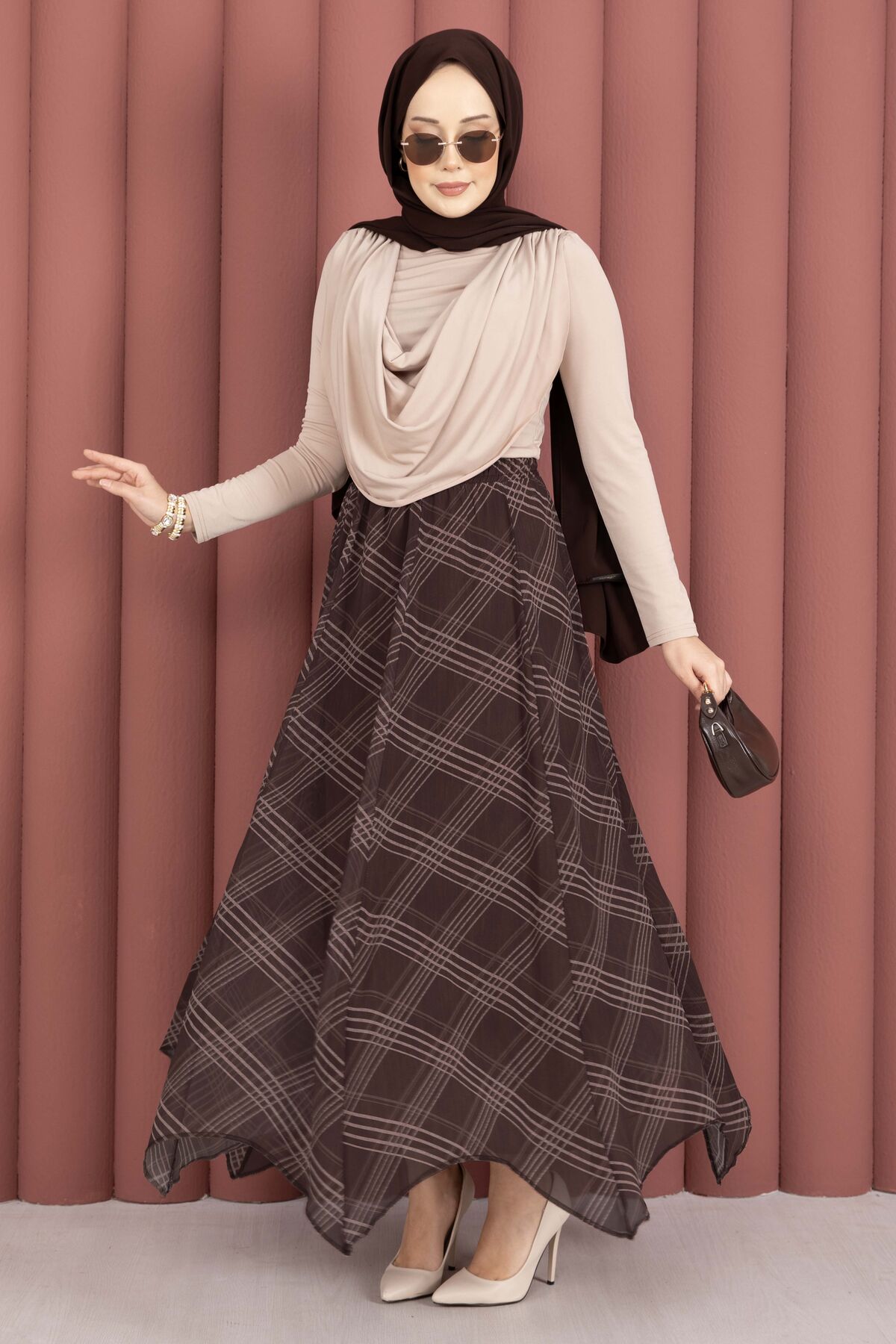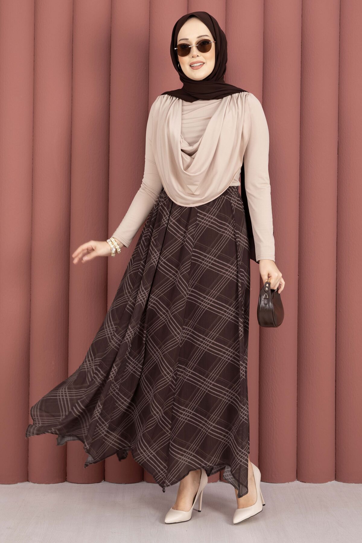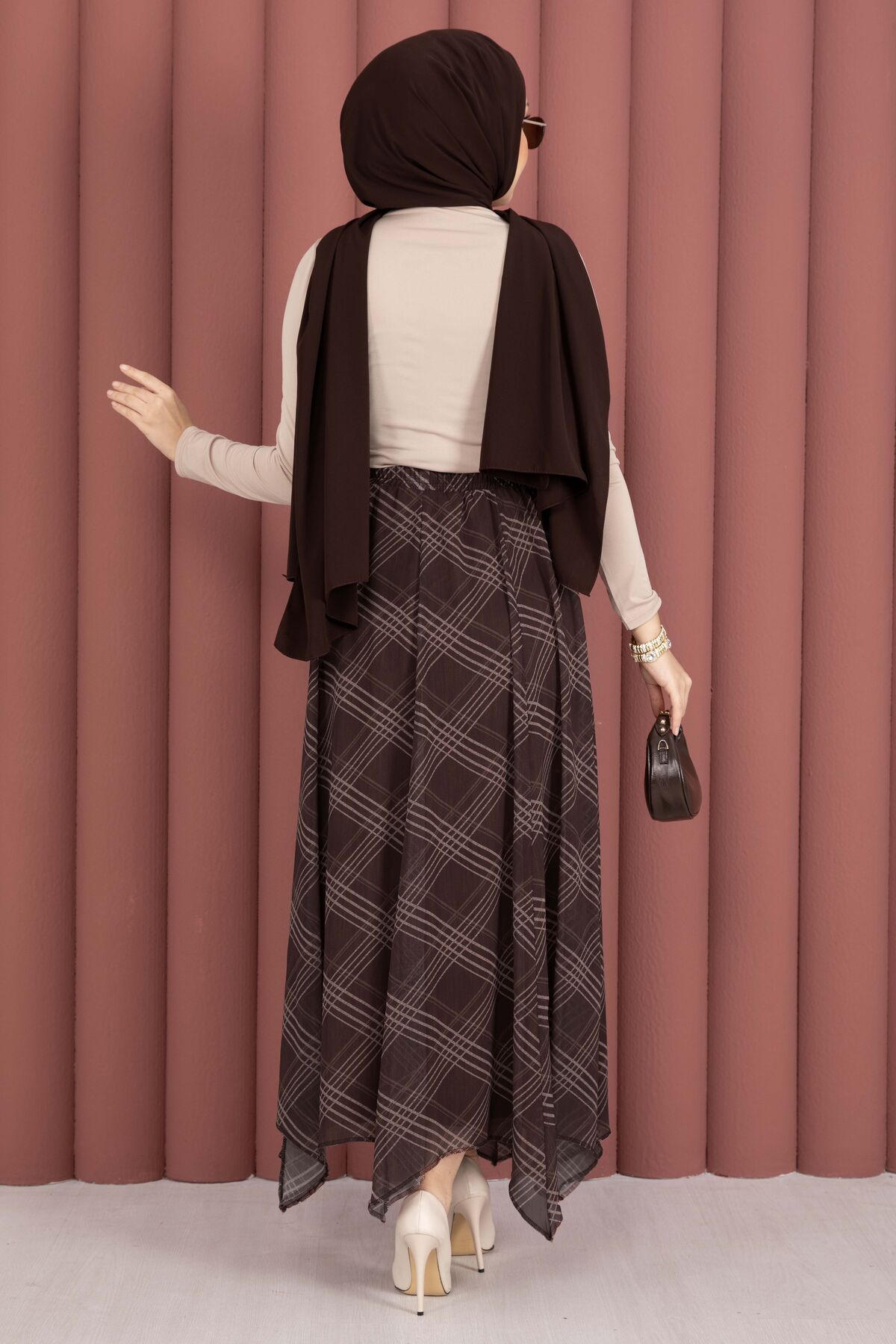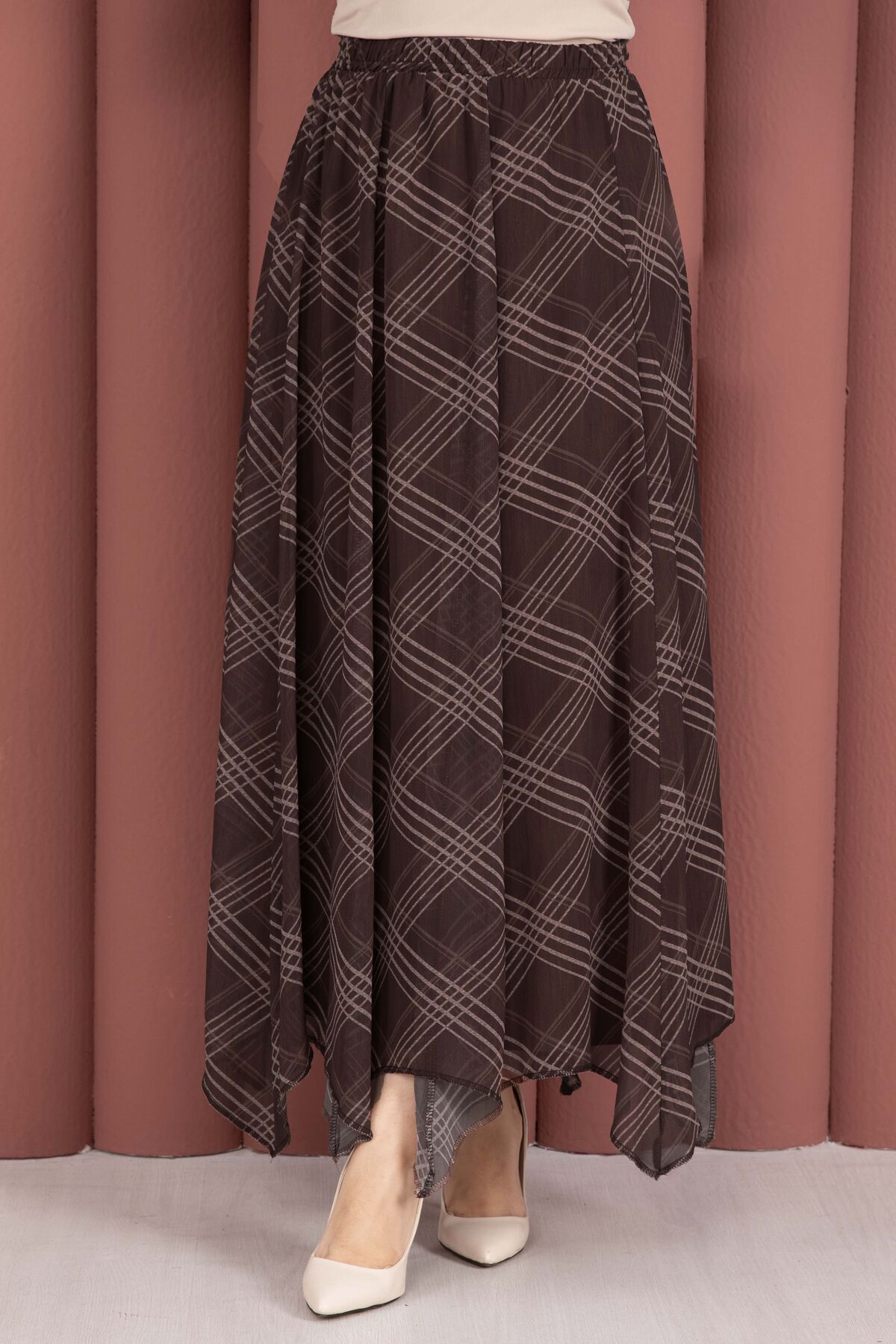 Ekose Desenli Asimetrik Kesim Şifon Etek Kahve