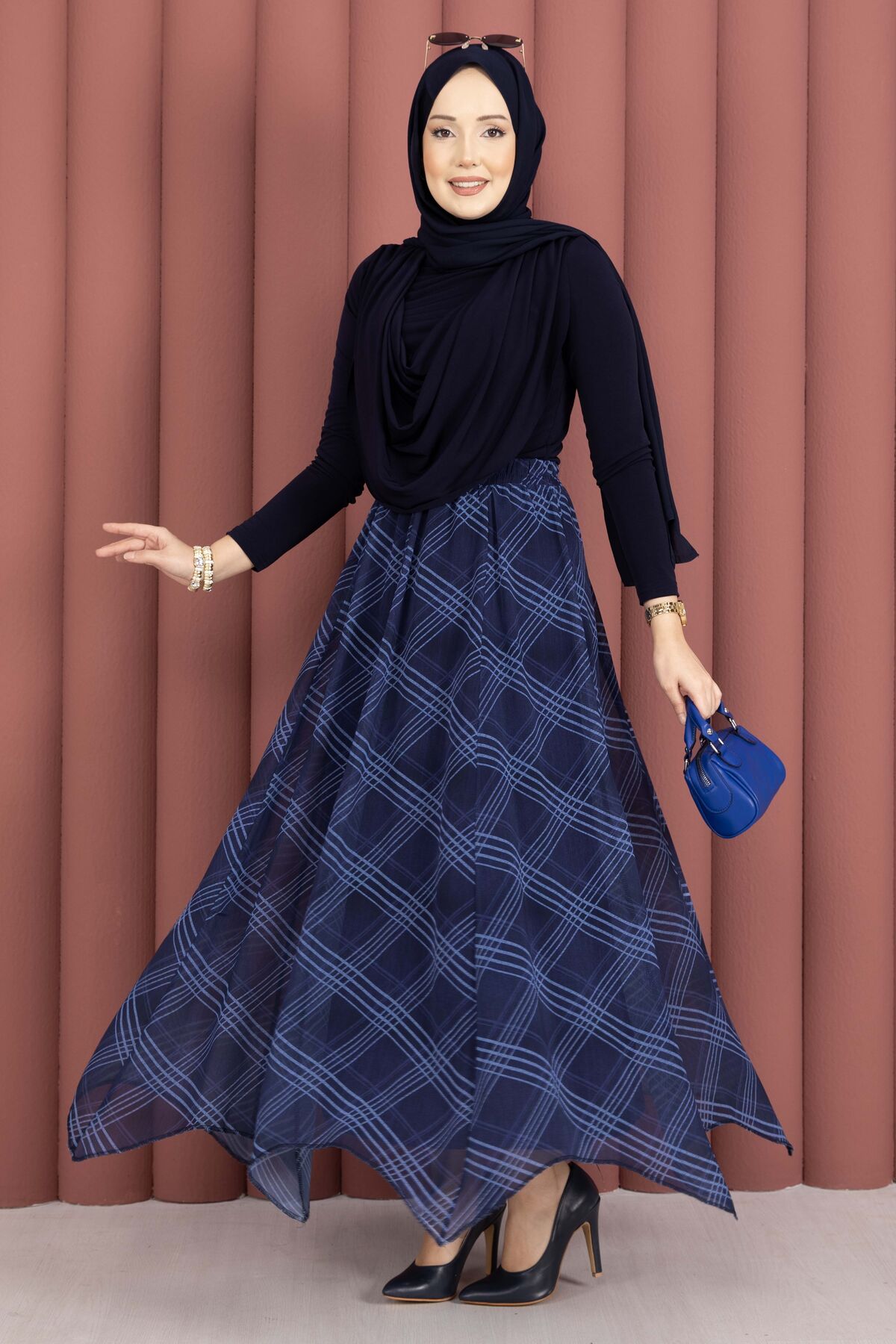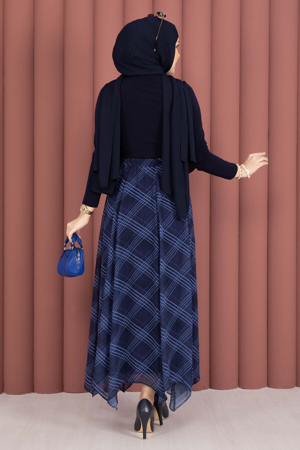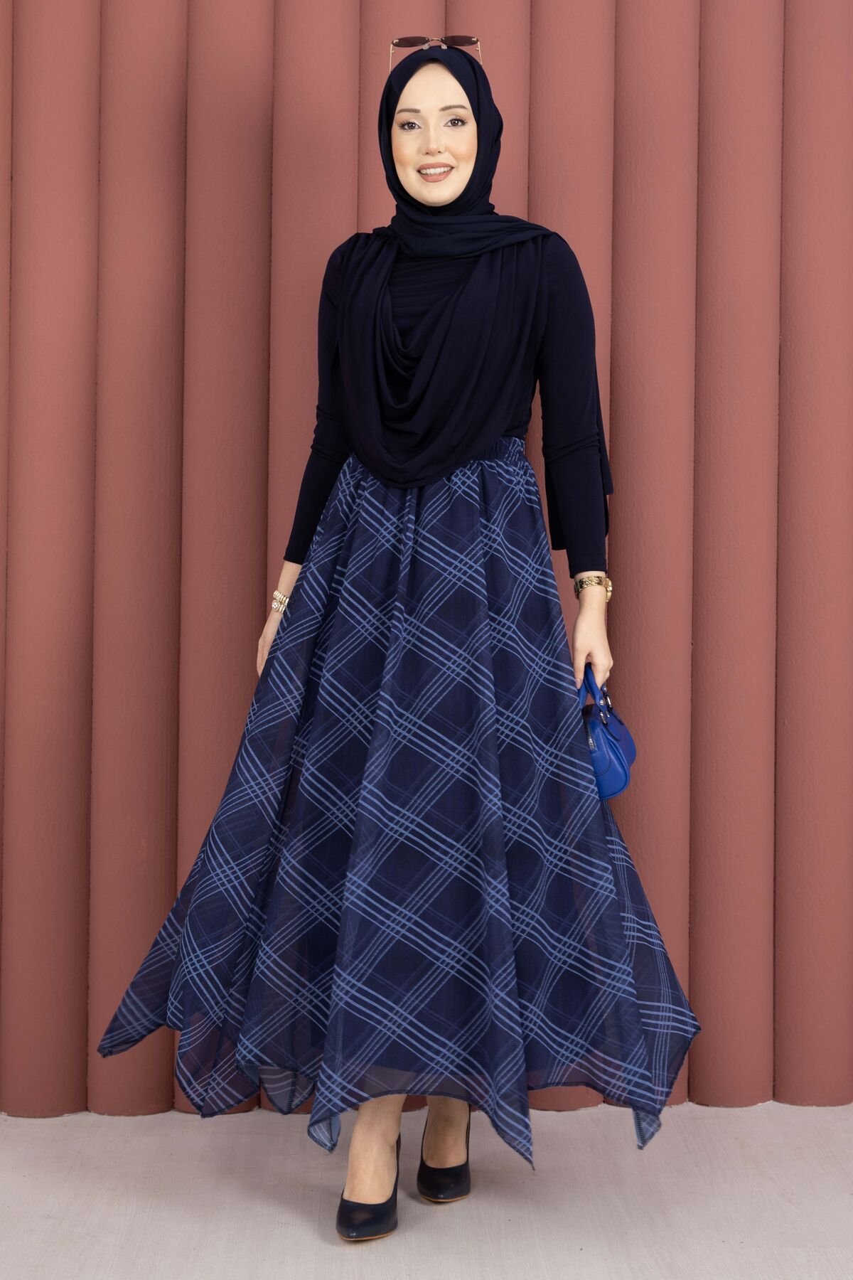 Ekose Desenli Asimetrik Kesim Şifon Etek Lacivert
