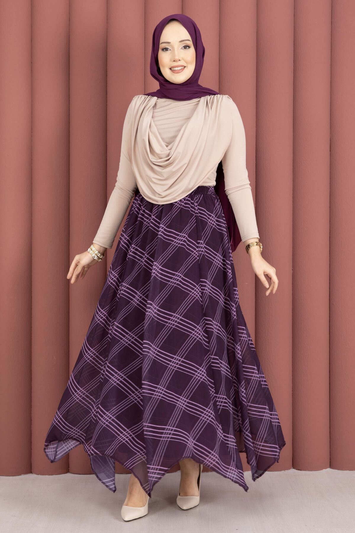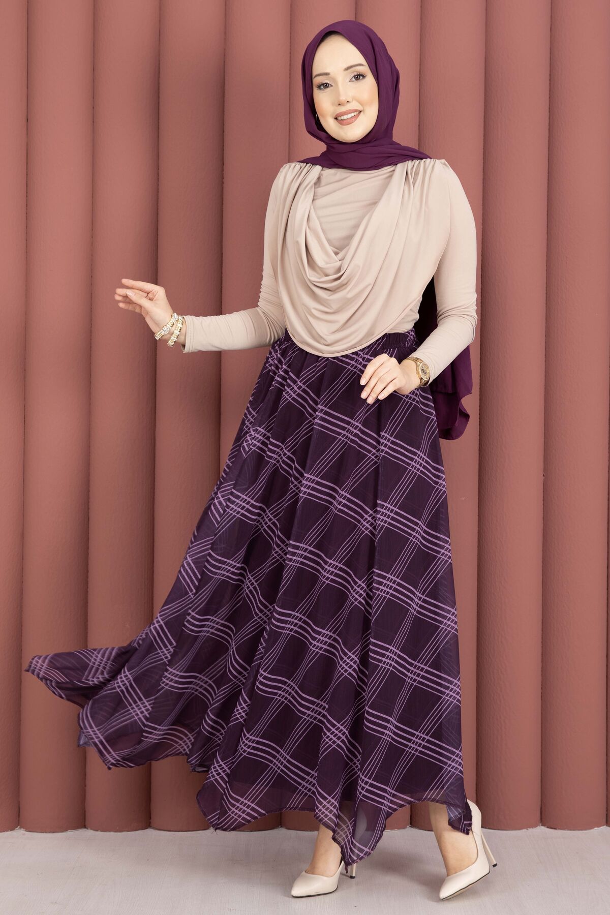 Ekose Desenli Asimetrik Kesim Şifon Etek Mor