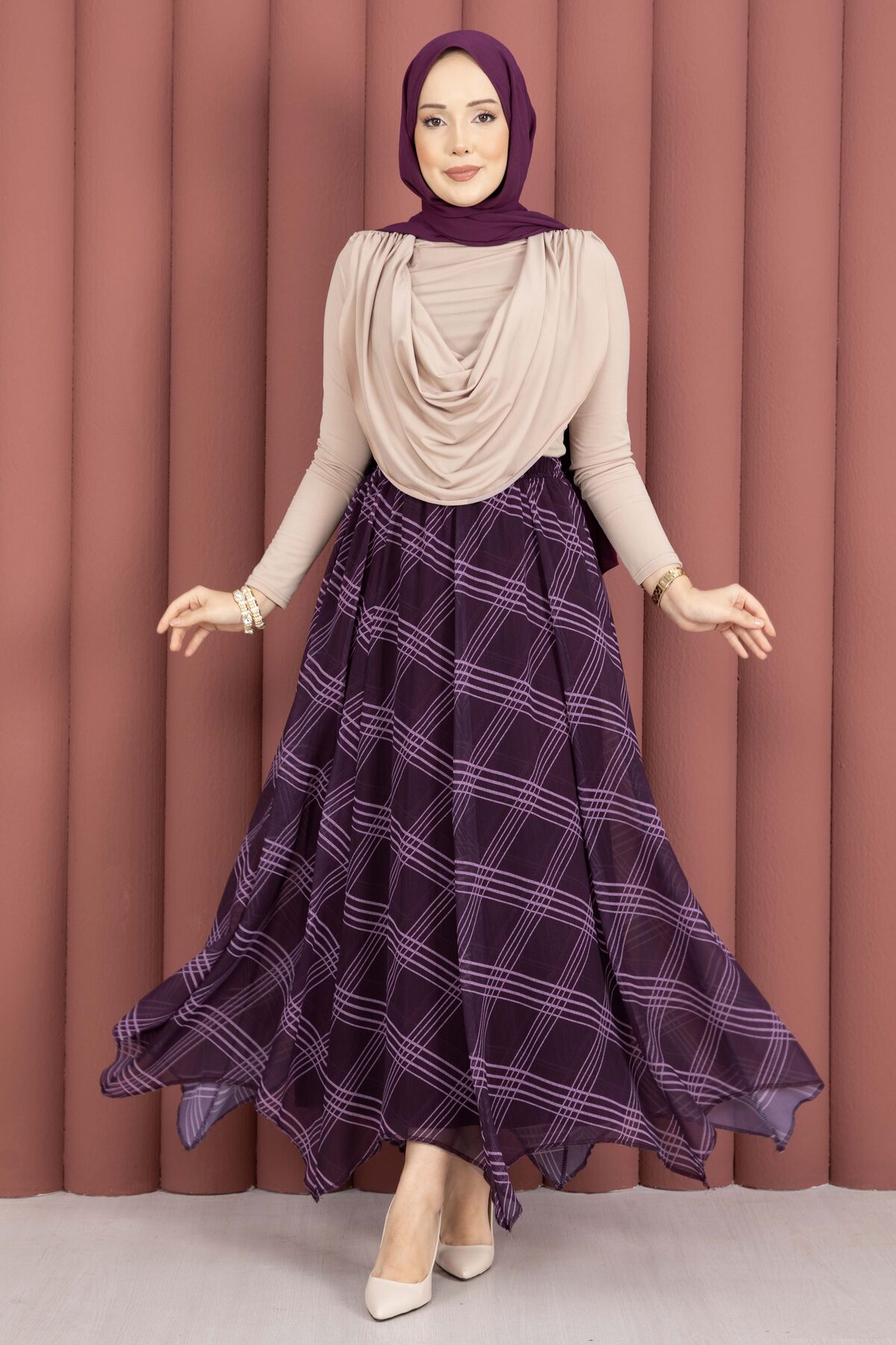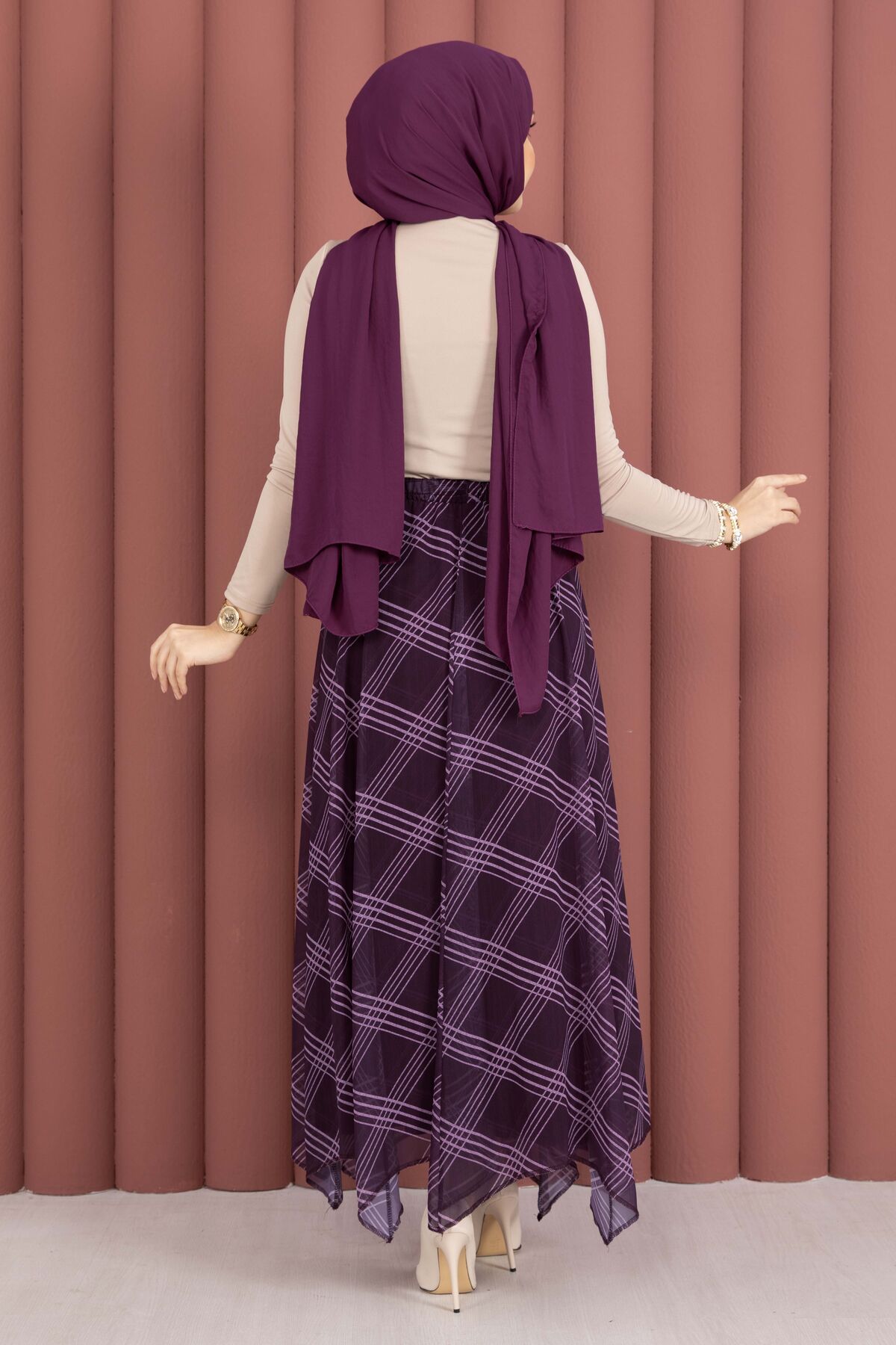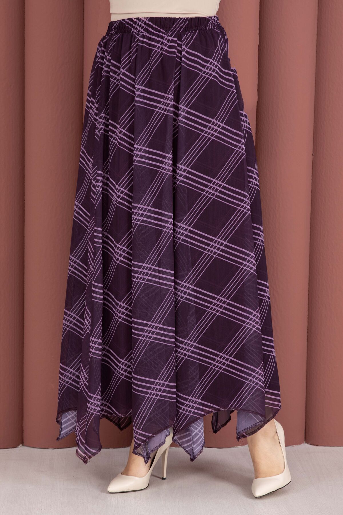 Ekose Desenli Asimetrik Kesim Şifon Etek Mürdüm