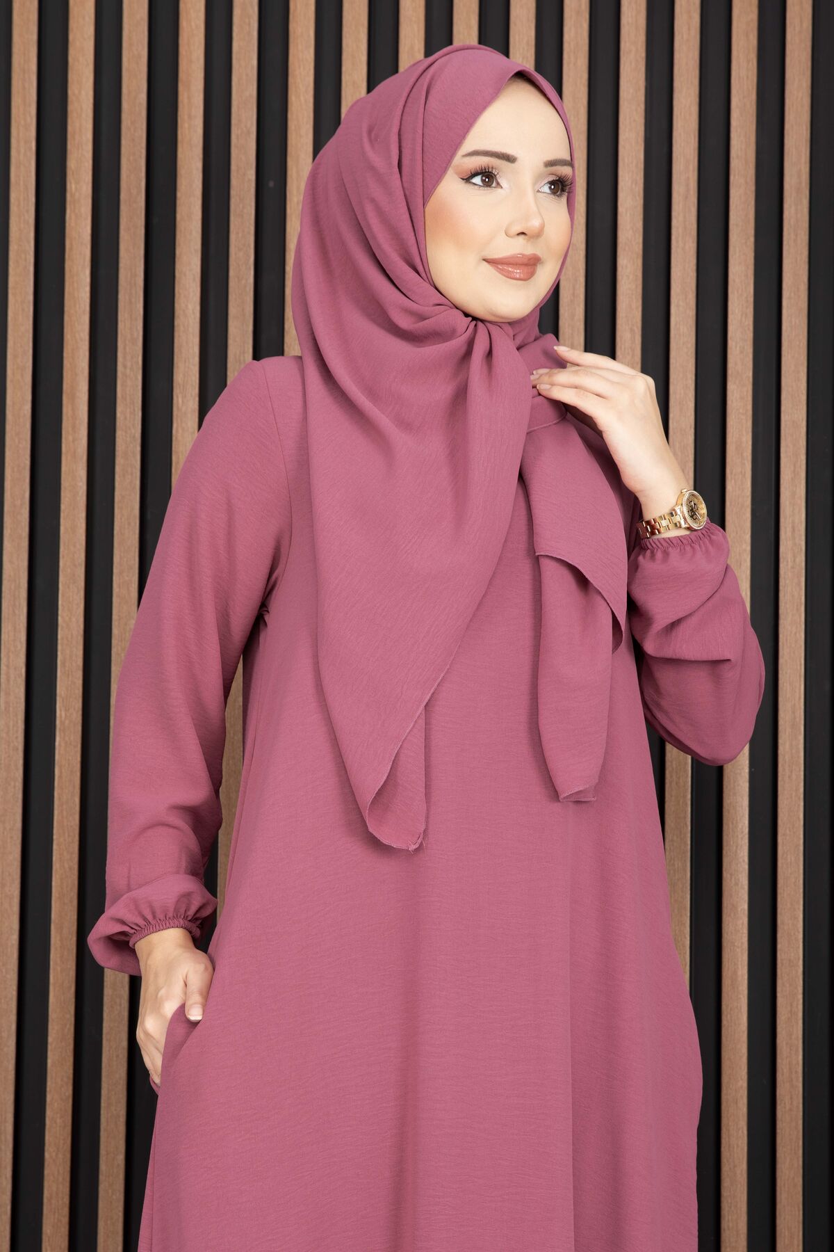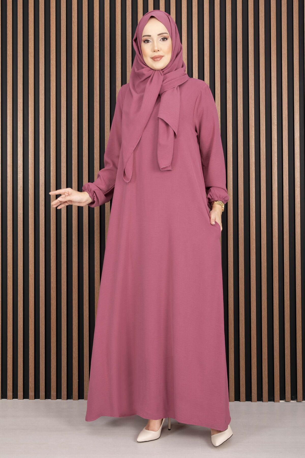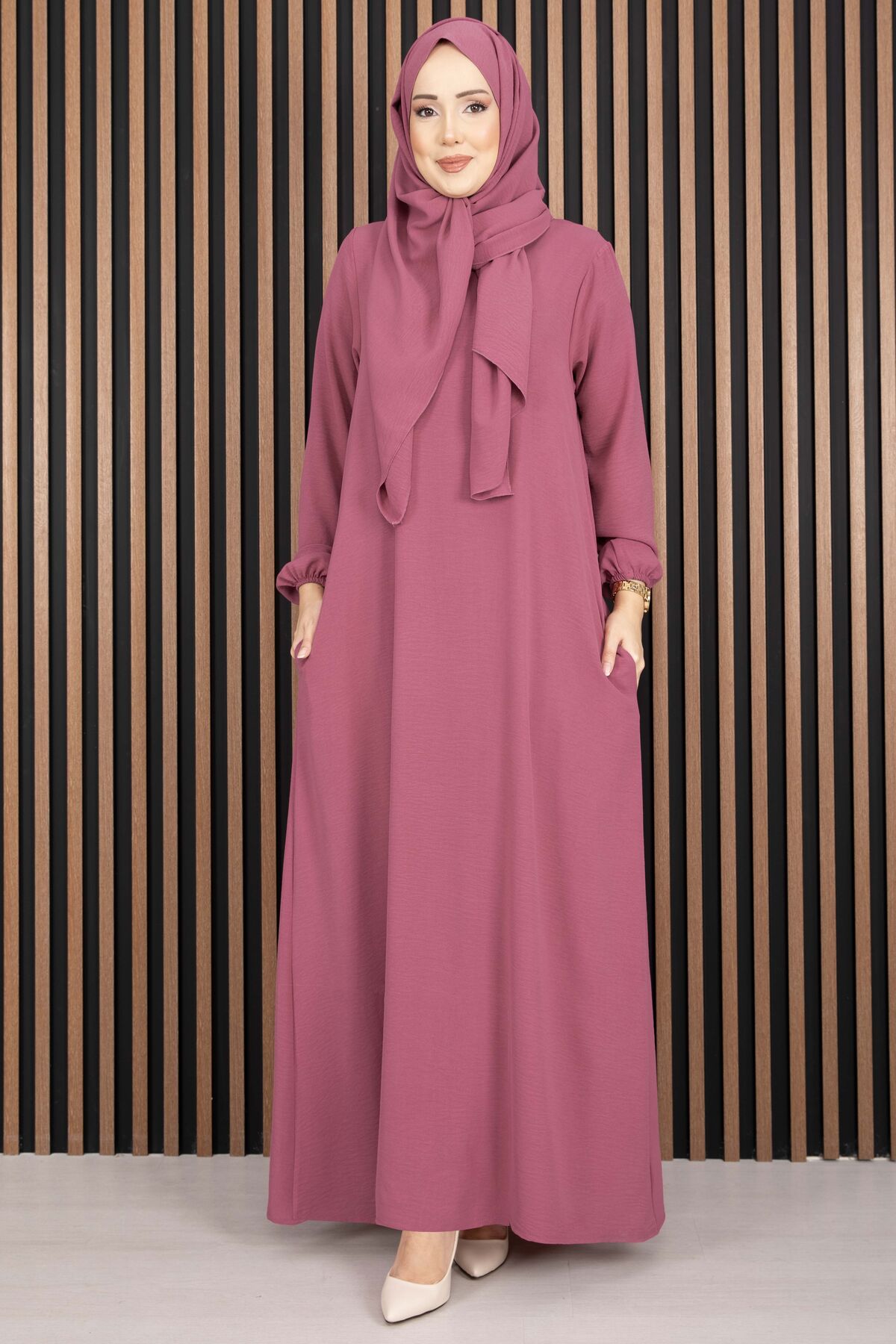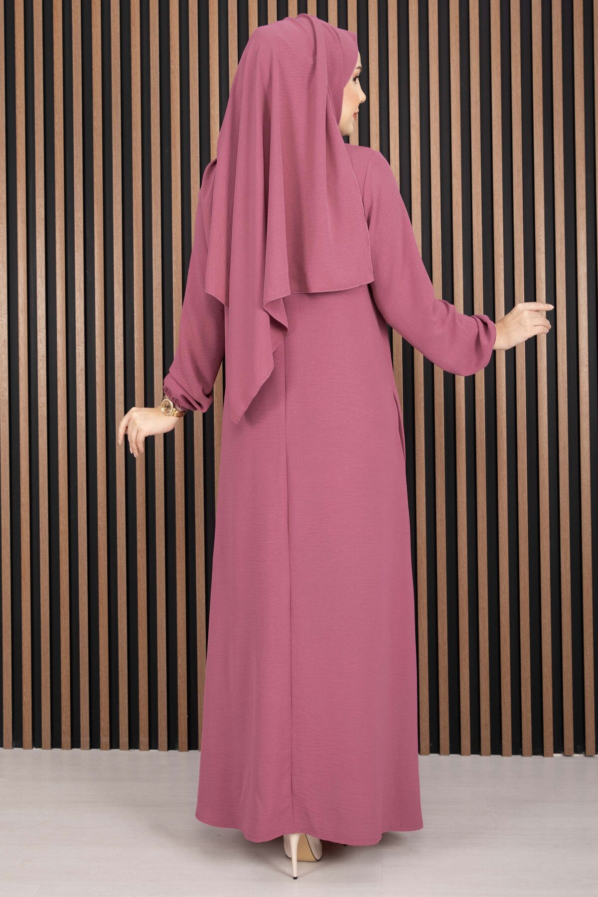 Zarif duruşu ve uyumlu şalı ile kombin yapma derdi olmadan tek parça şıklık sunar. Hem günlük kombinlerde hem de davet stilinde tercih edilebilir.