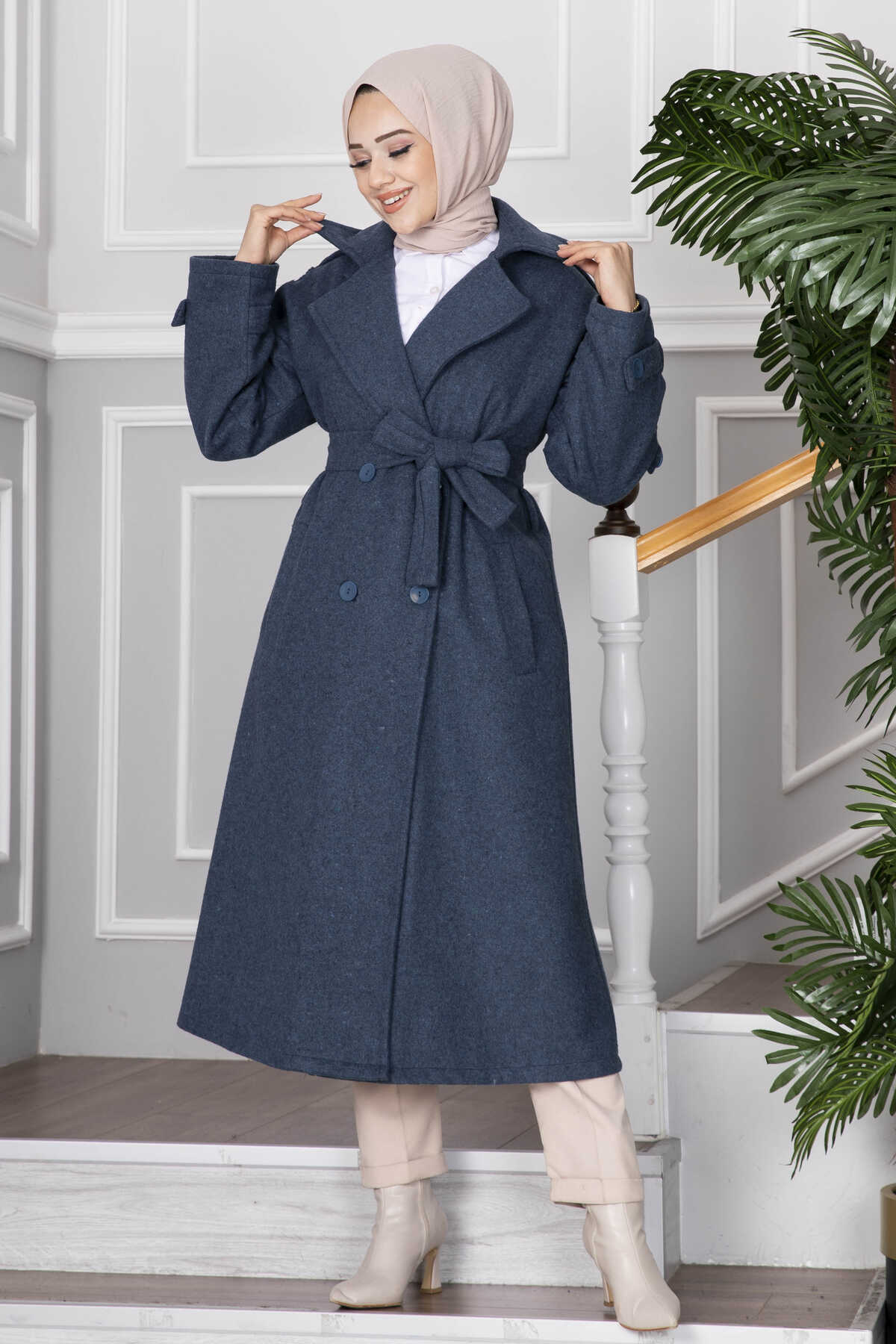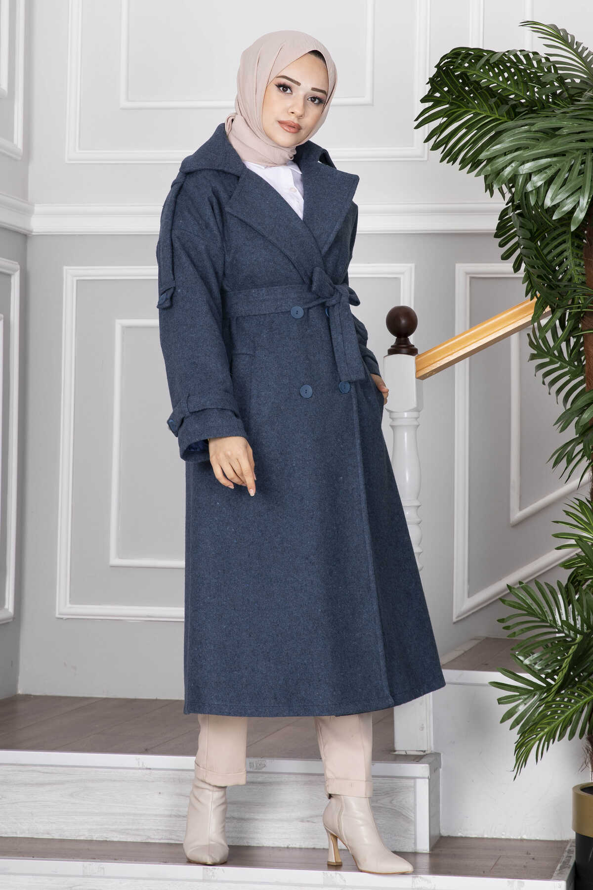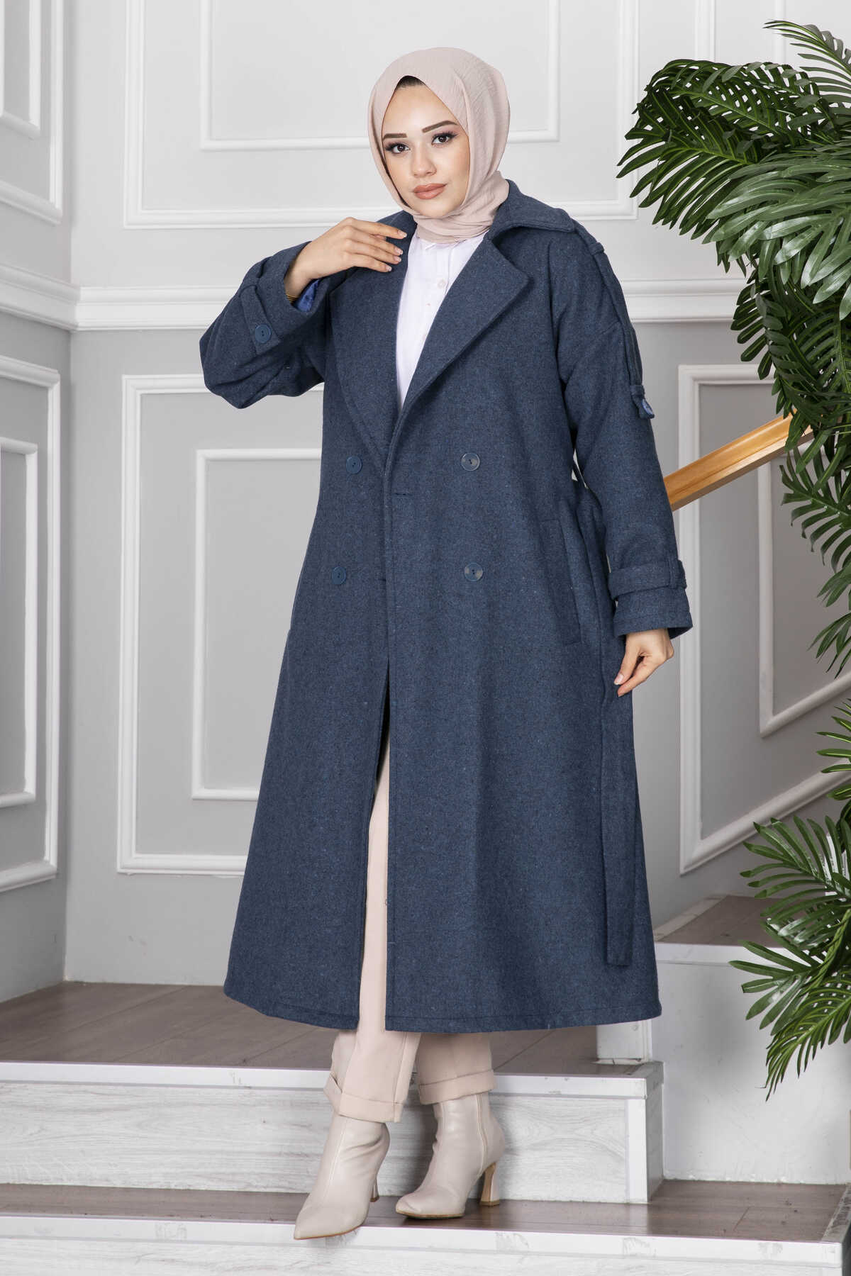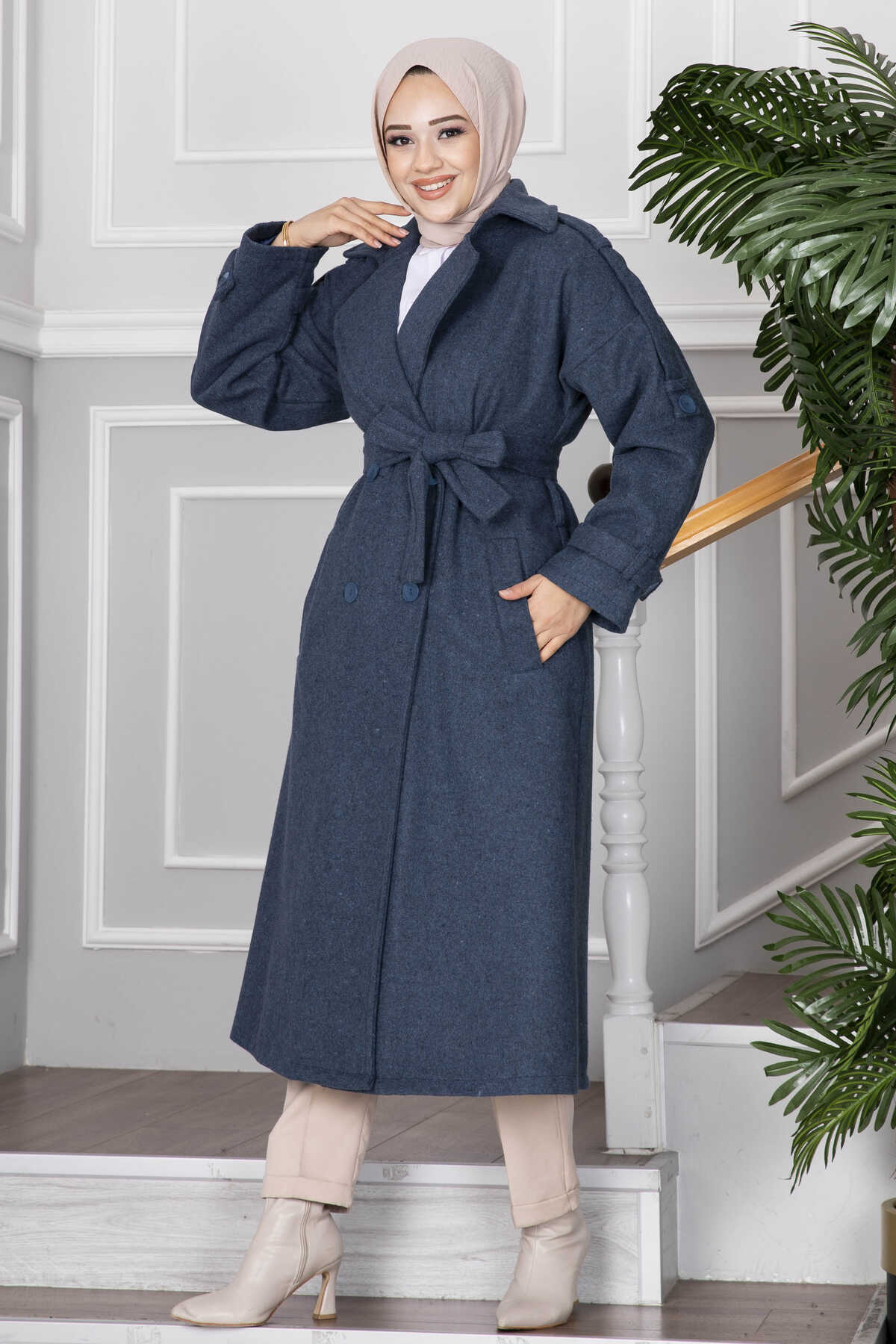 Elvin Tesettür Kaşe Kaban İndigo