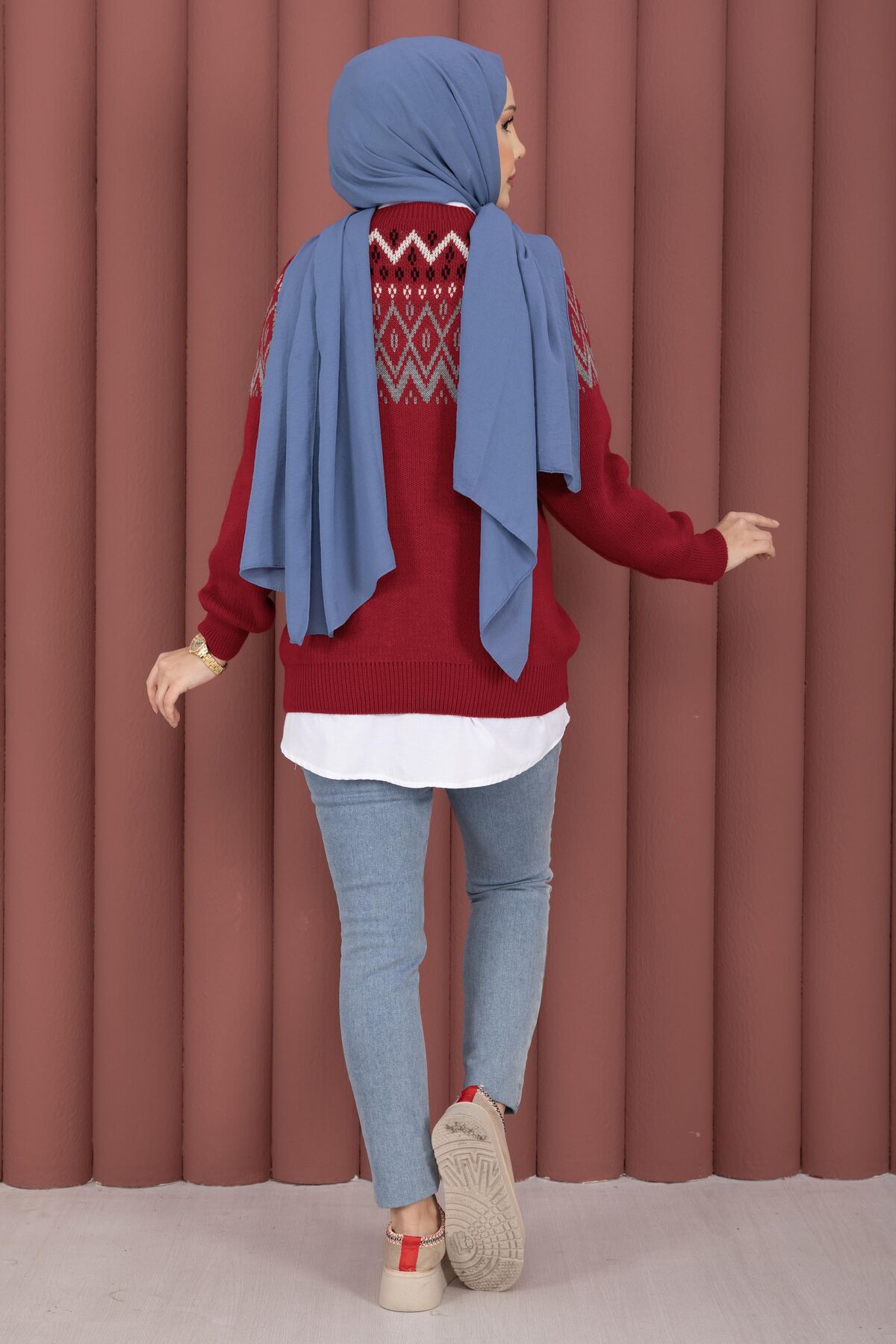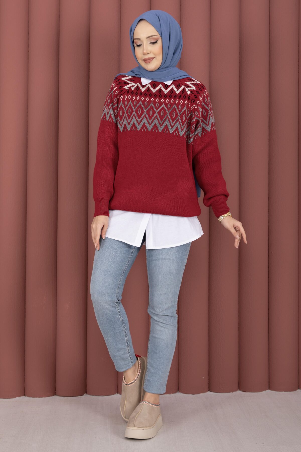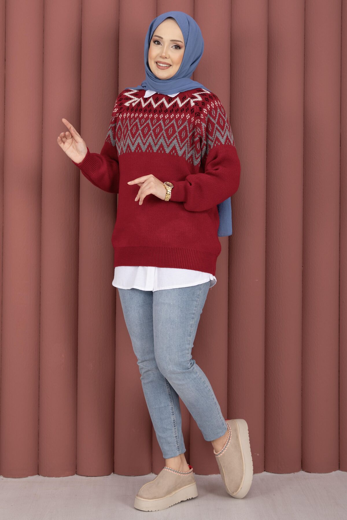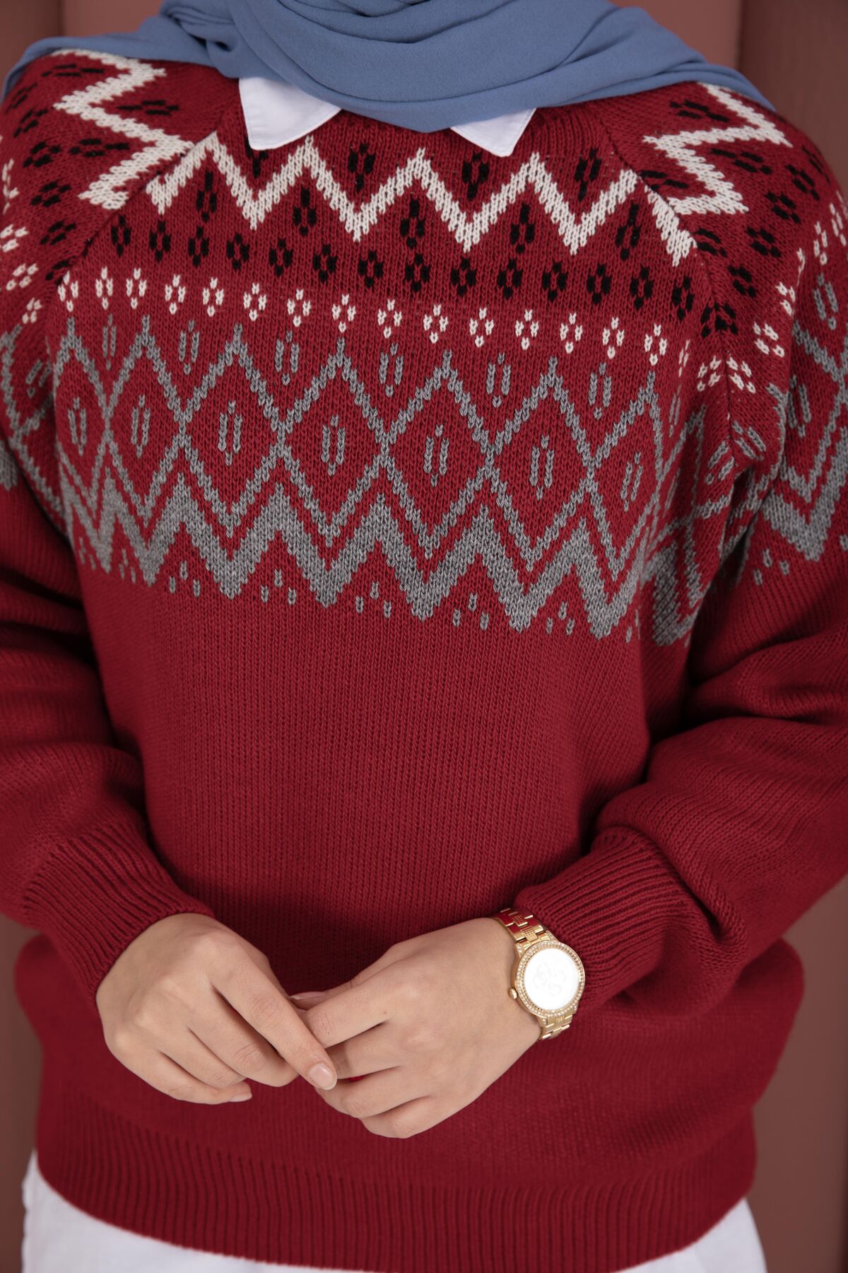 Etnik Motifli Salaş Triko Kazak Kırmızı