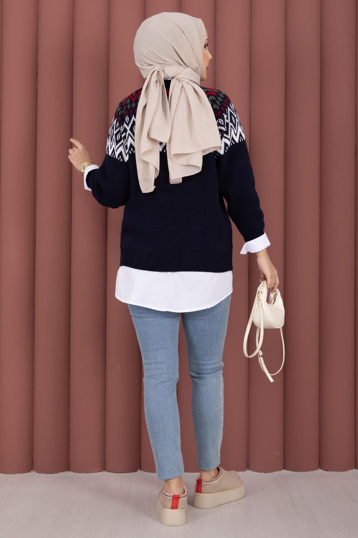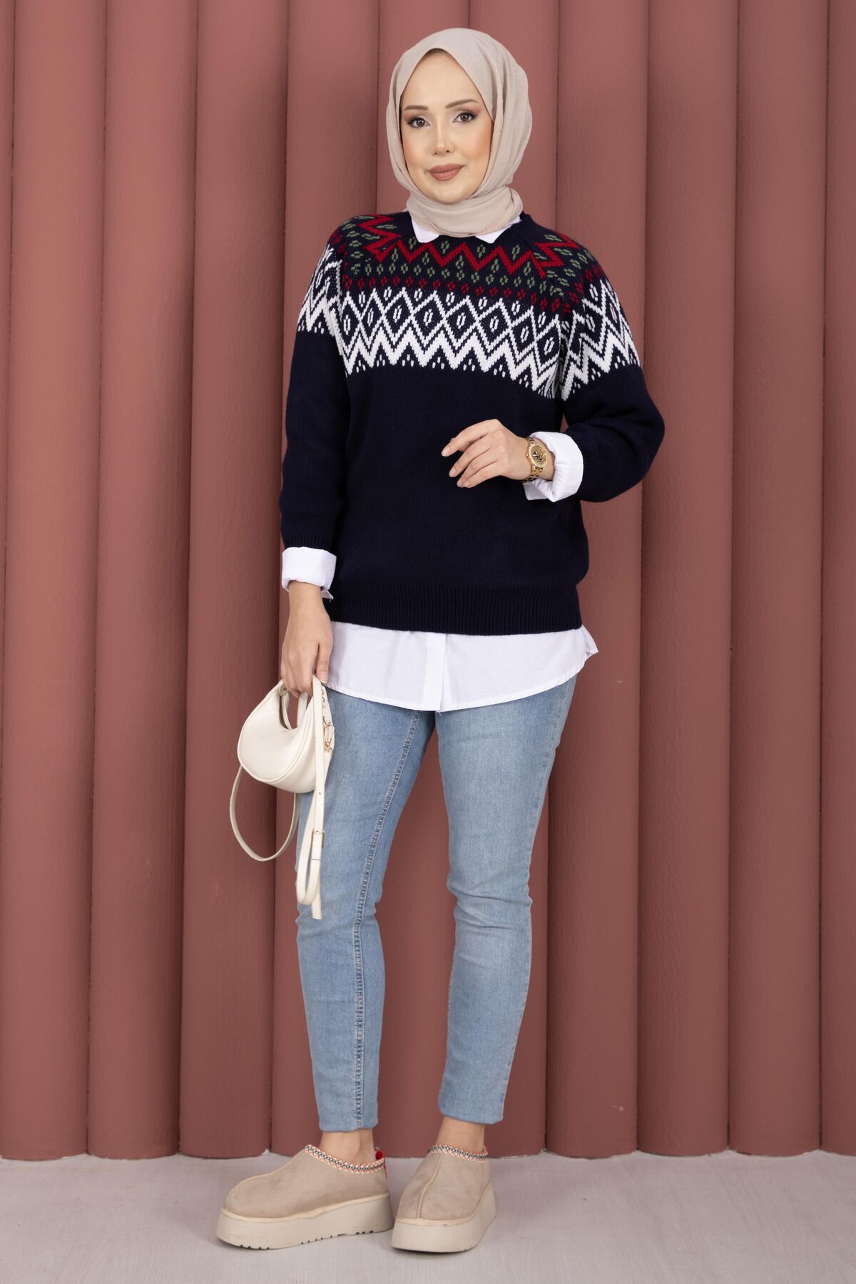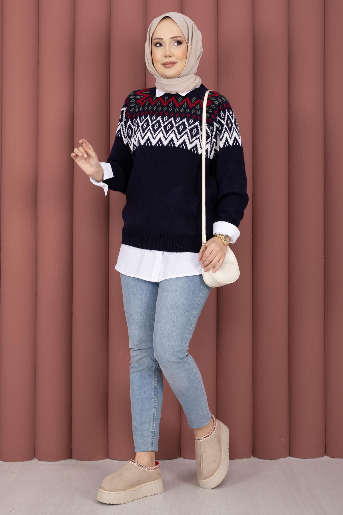 Etnik desenleriyle öne çıkan Etnik Motifli Salaş Triko Kazak, günlük kombinlere sıcak ve şık bir dokunuş katar. Triko kumaşı sayesinde serin havalarda konforlu bir kullanım sunar.