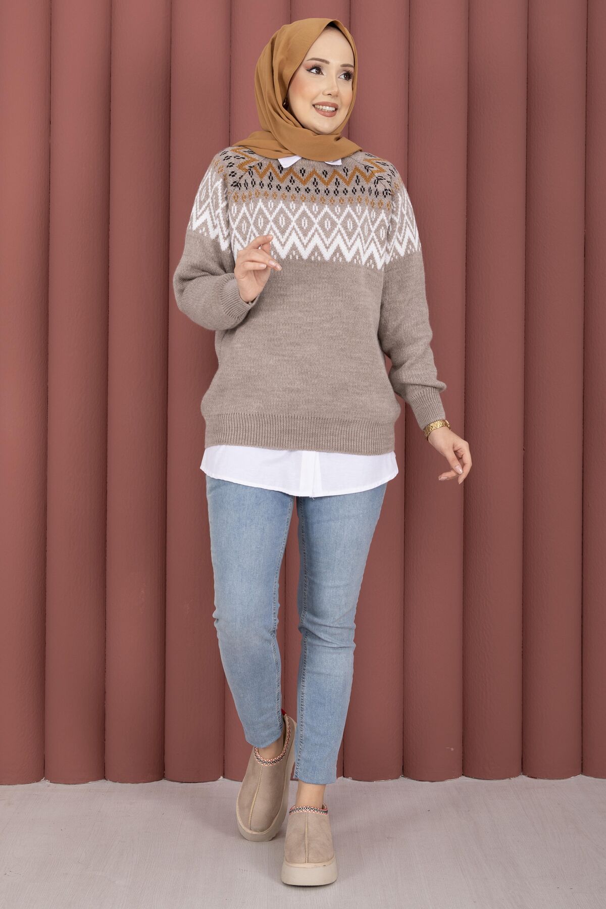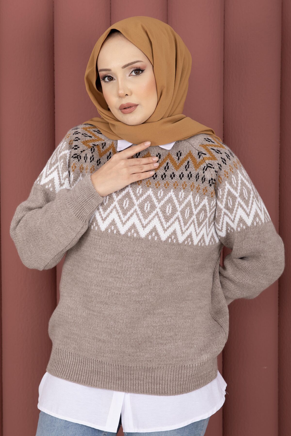Etnik Motifli Salaş Triko Kazak Vizon