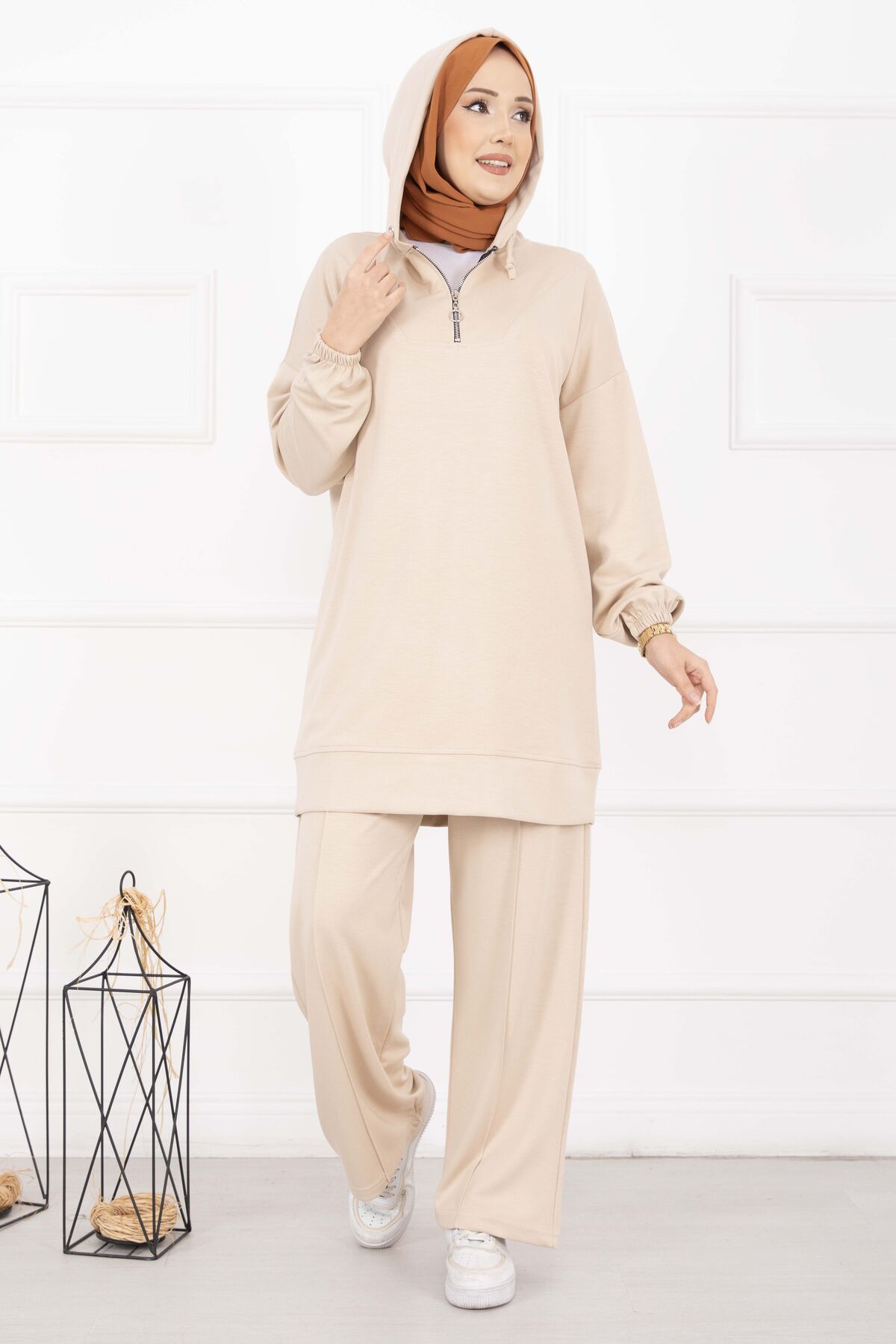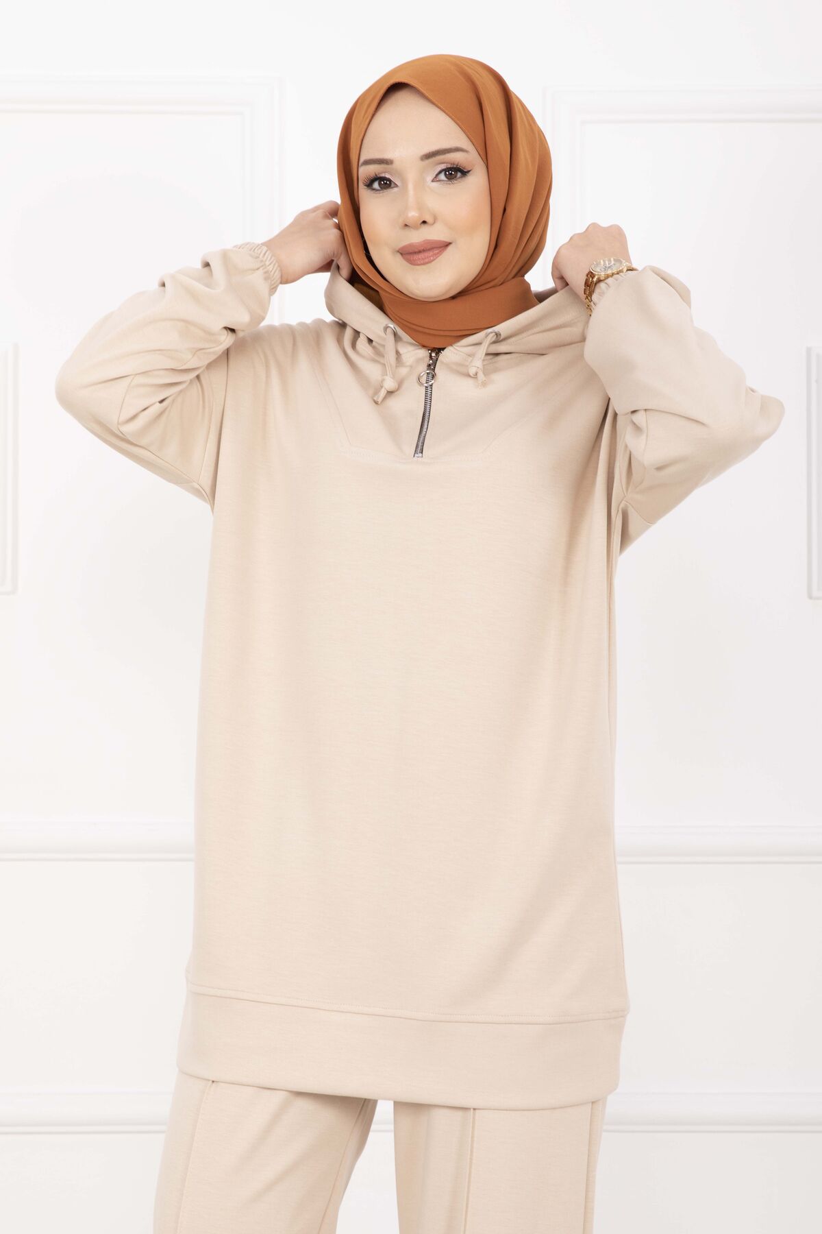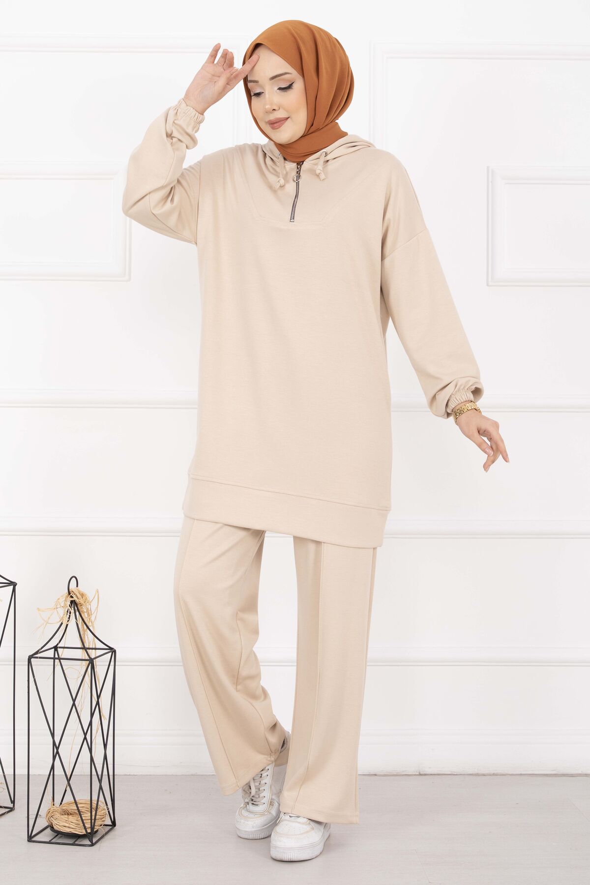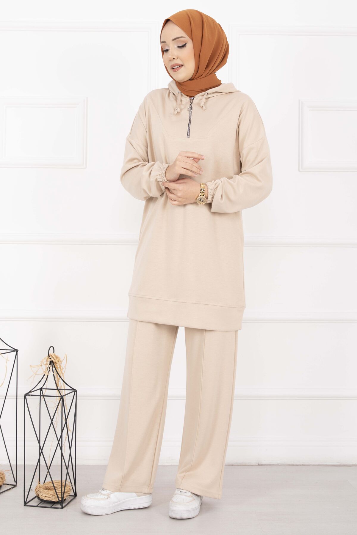 Fermuar Yaka Kapüşonlu Tesettür Takım Bej