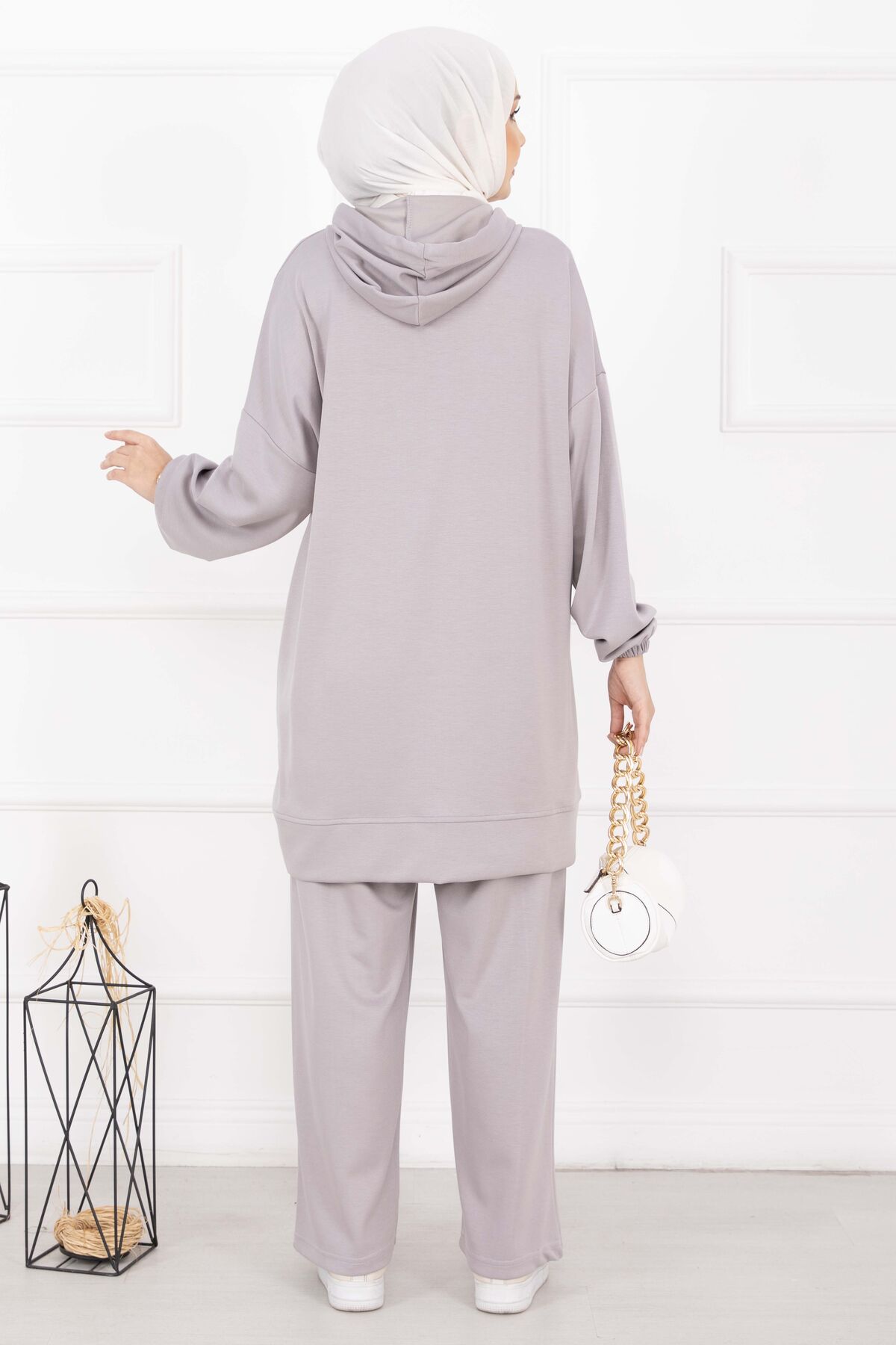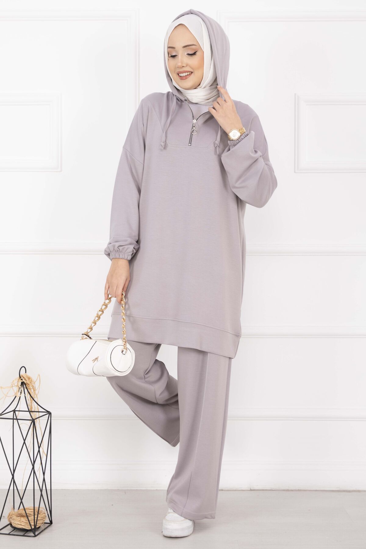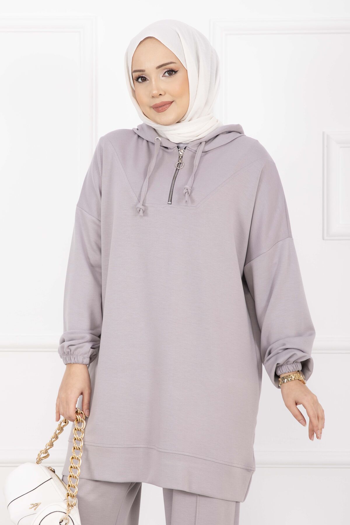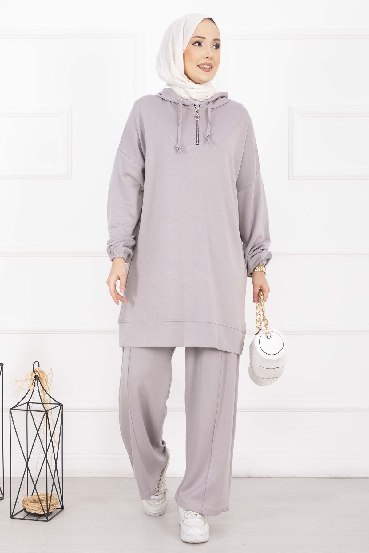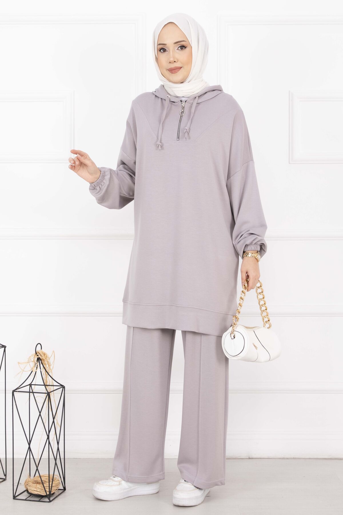 Fermuar Yaka Kapüşonlu Tesettür Takım Gri