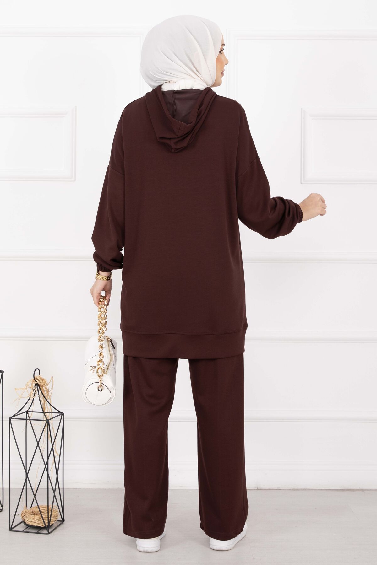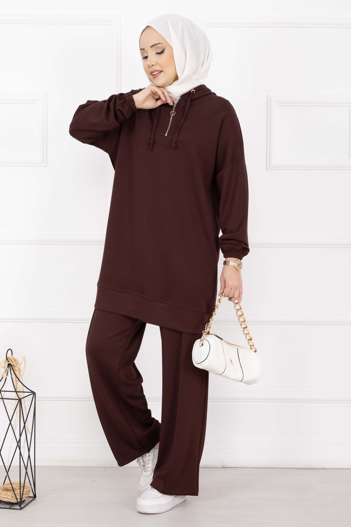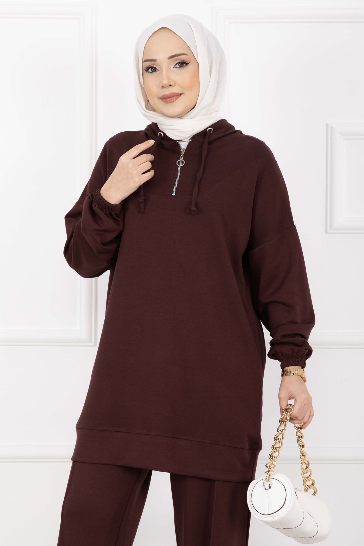 Fermuar Yaka Kapüşonlu Tesettür Takım Kahve