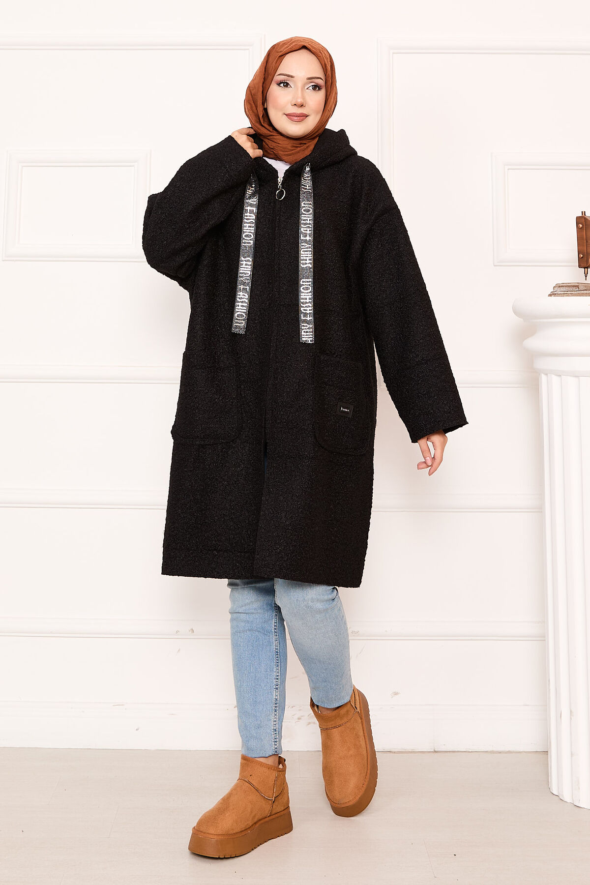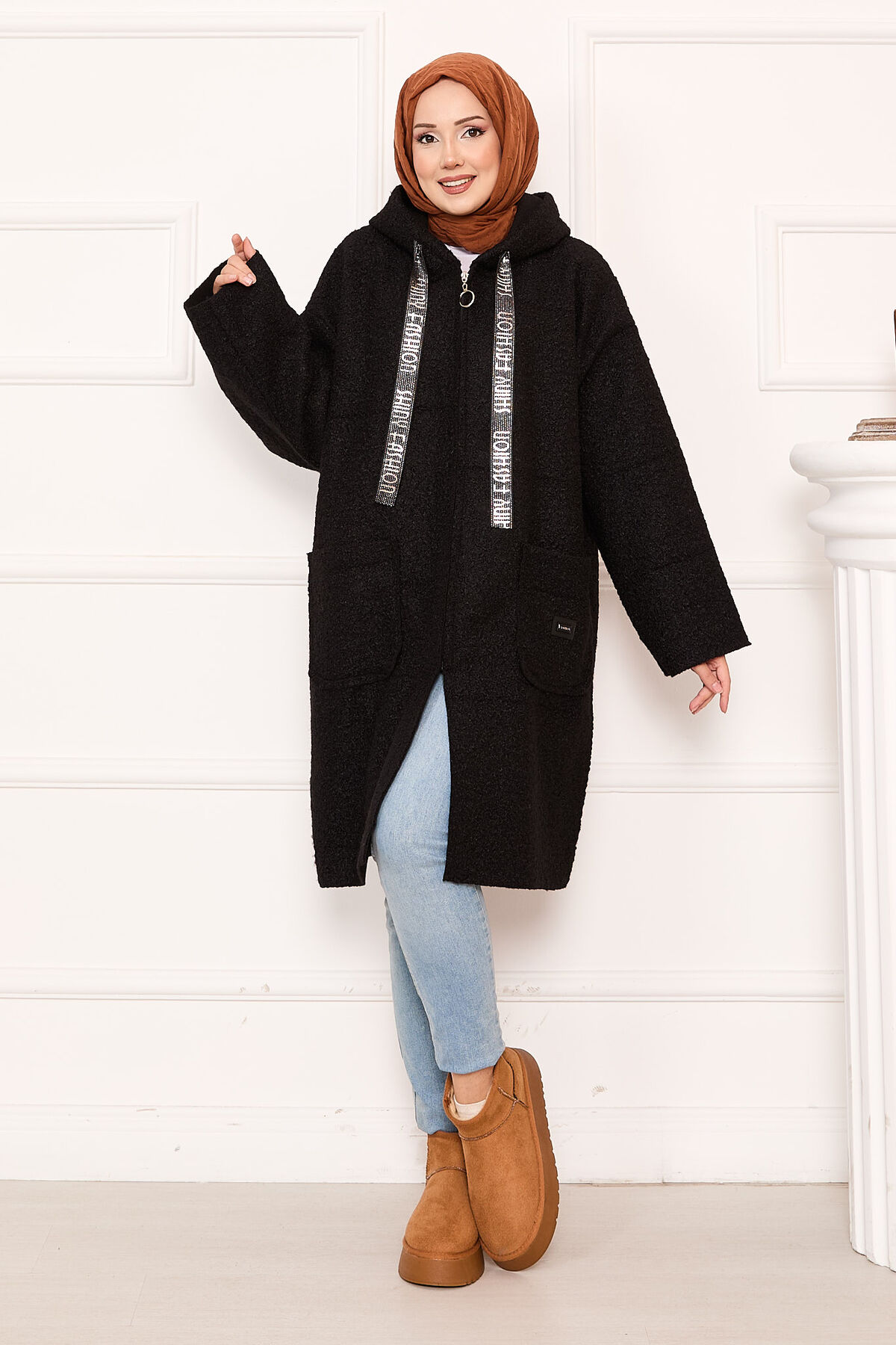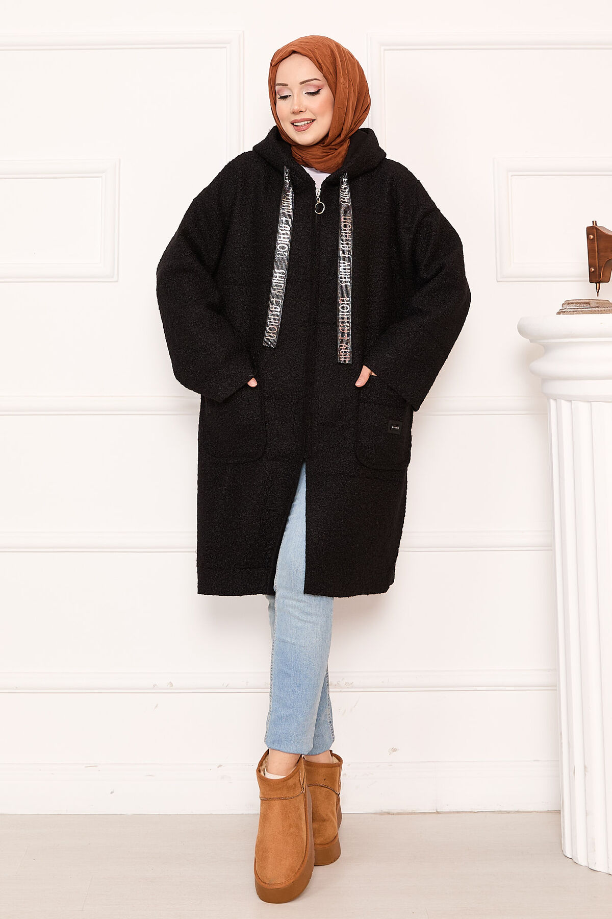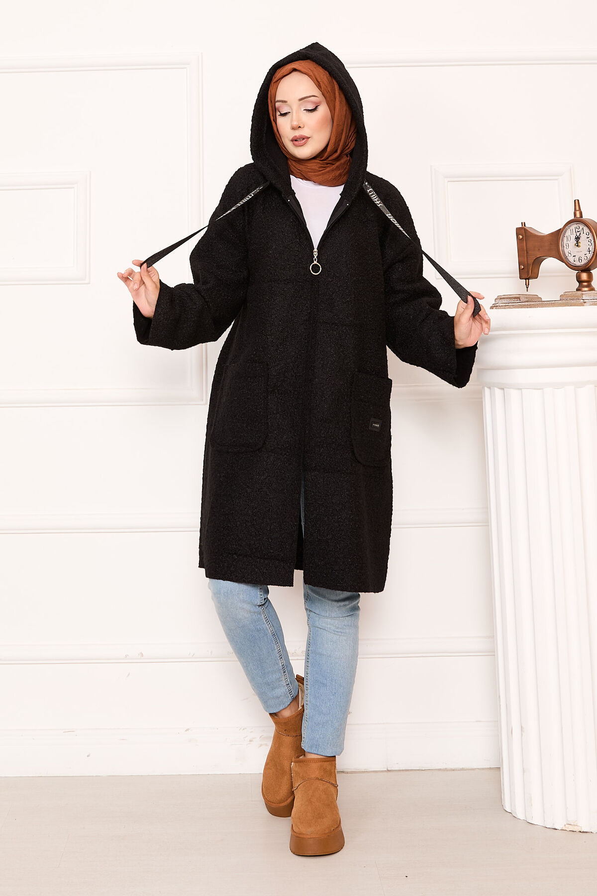 Fermuarlı Kapüşonlu Buklet Kap Siyah