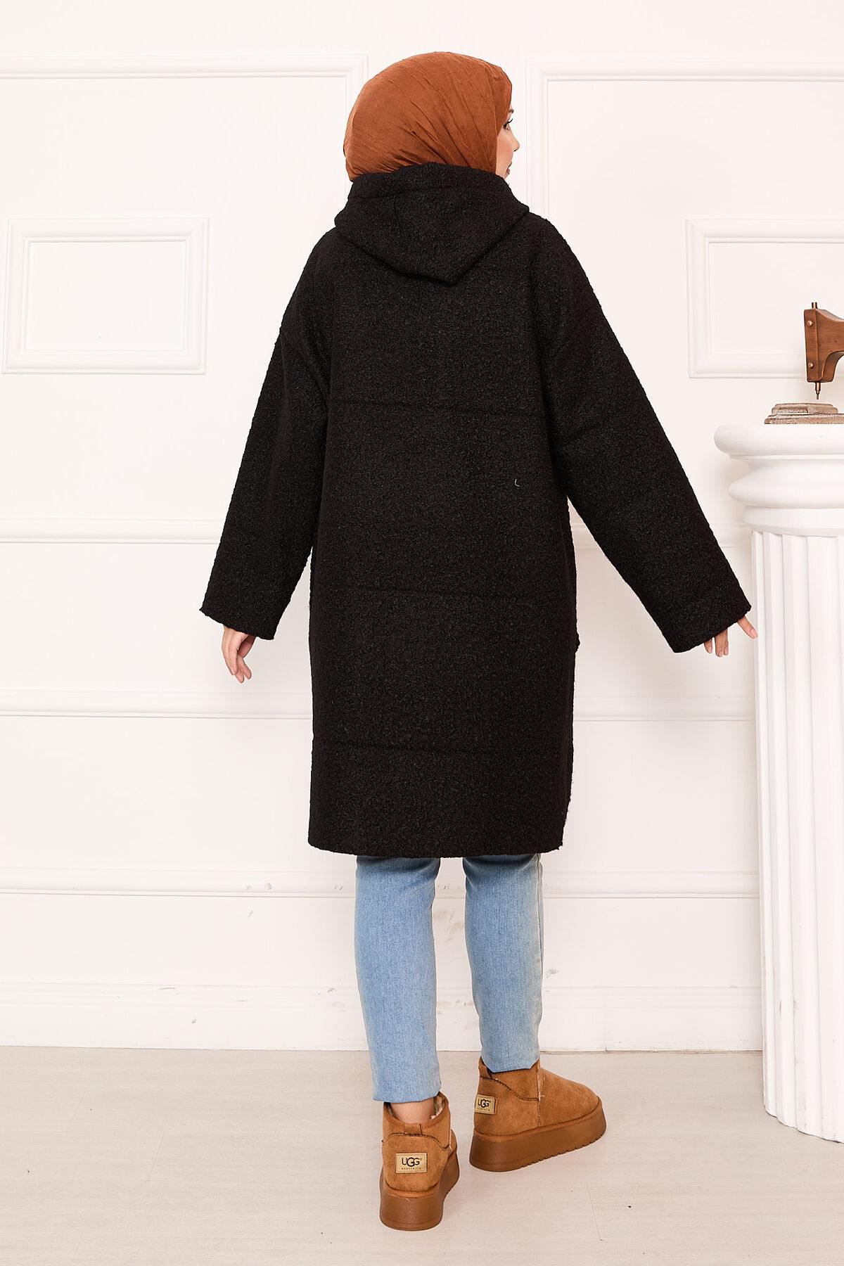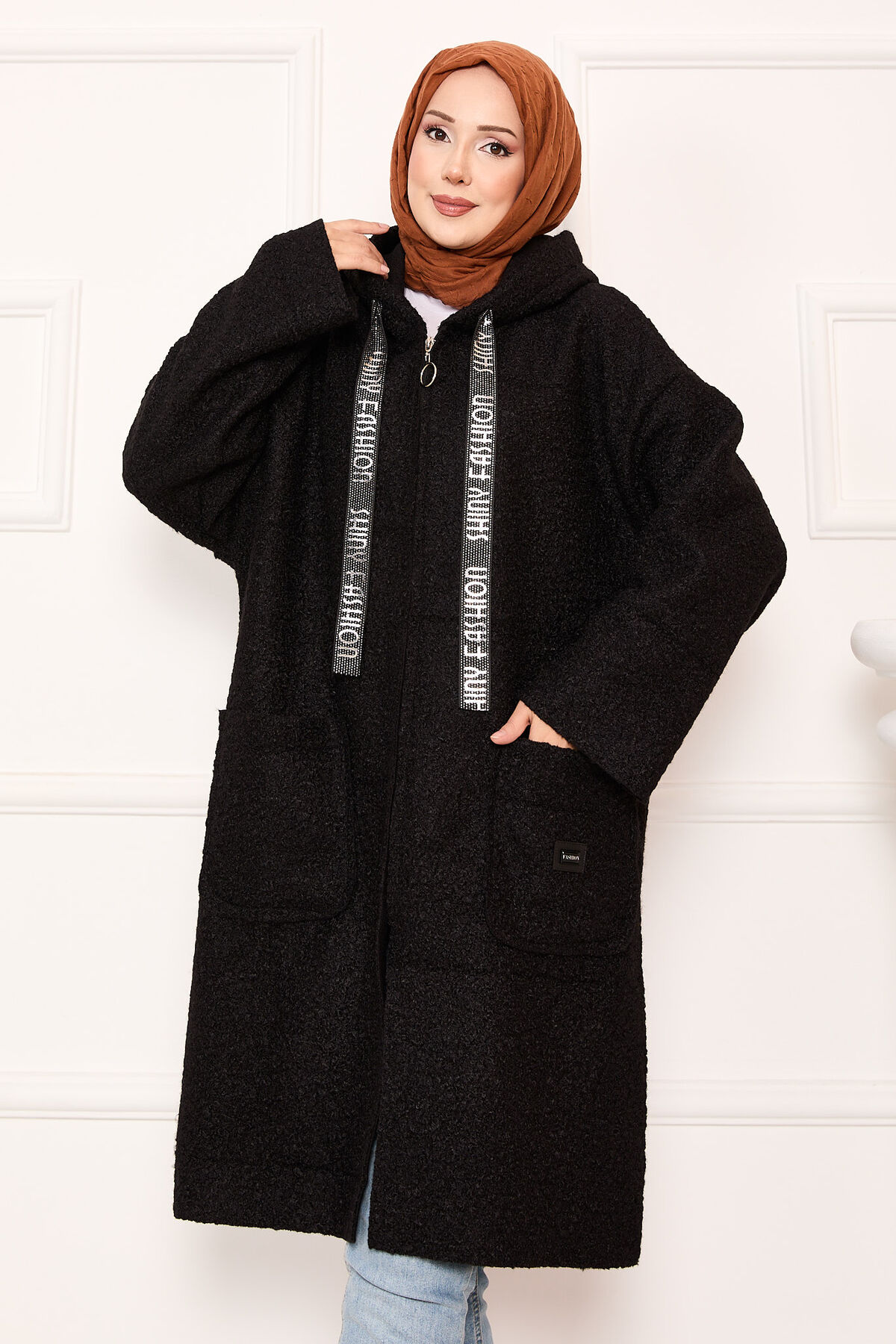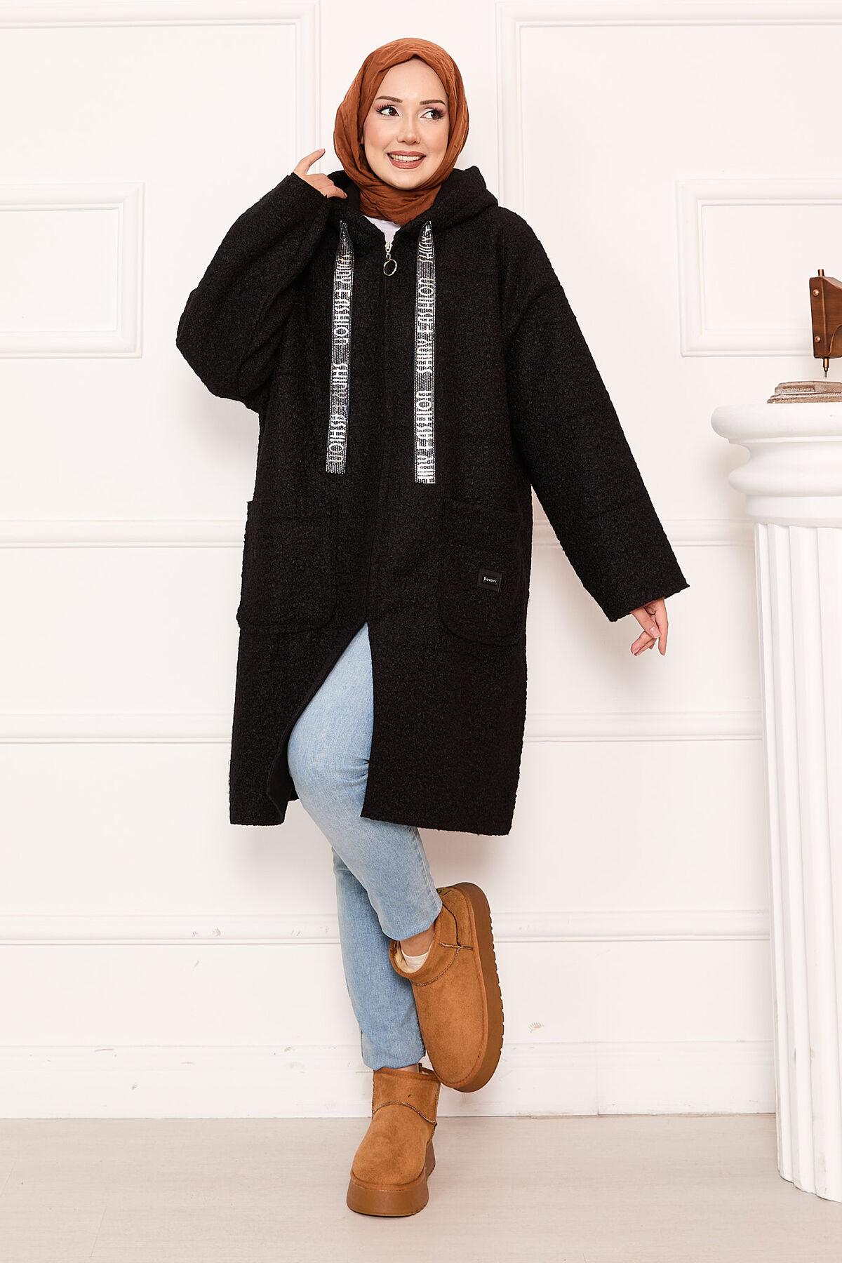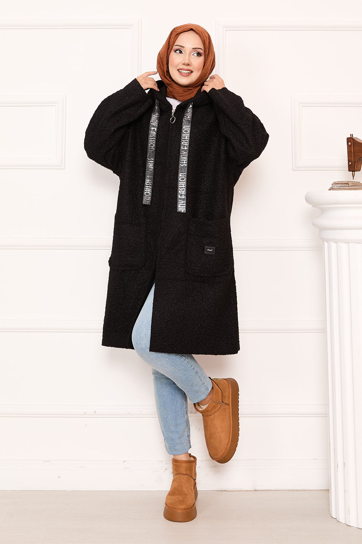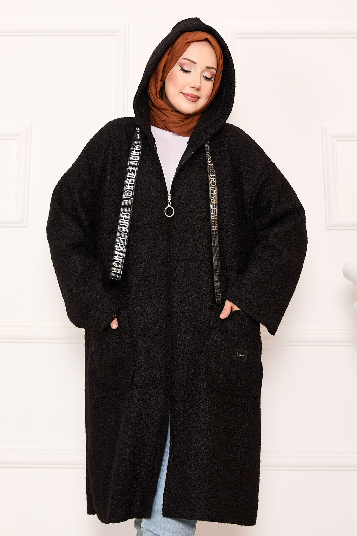 Fermuarlı Kapüşonlu Buklet Kap Siyah