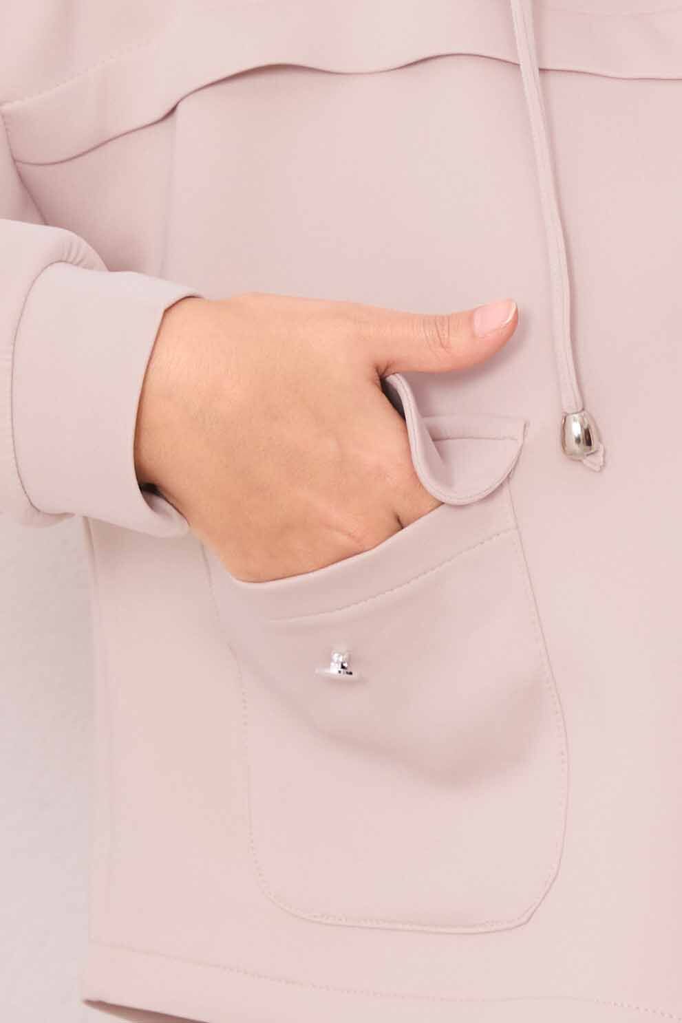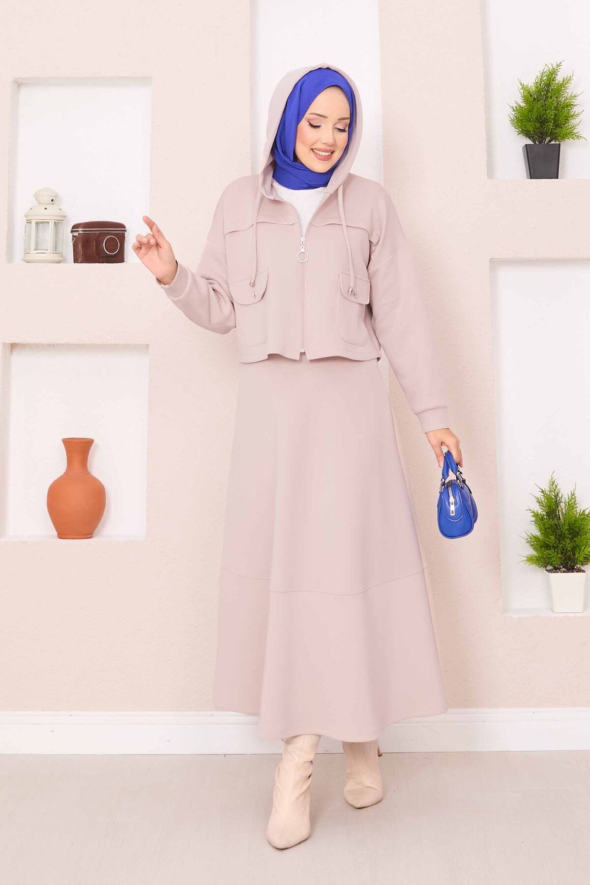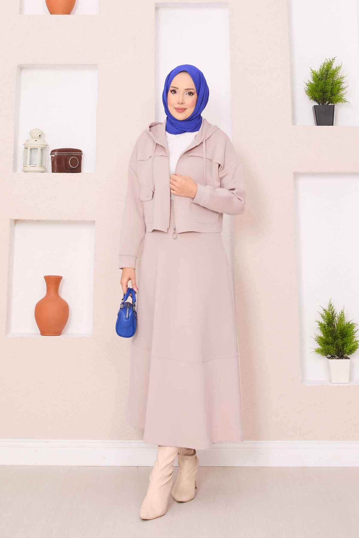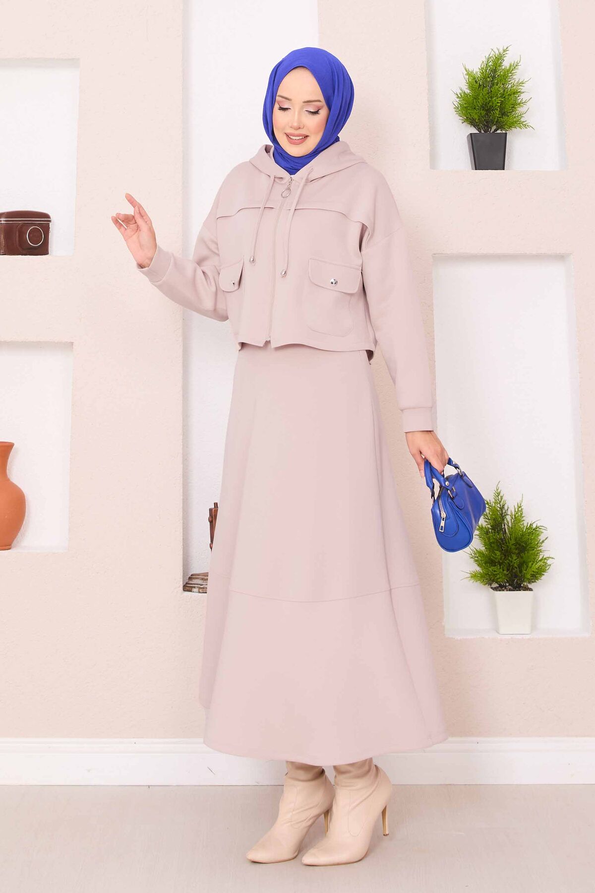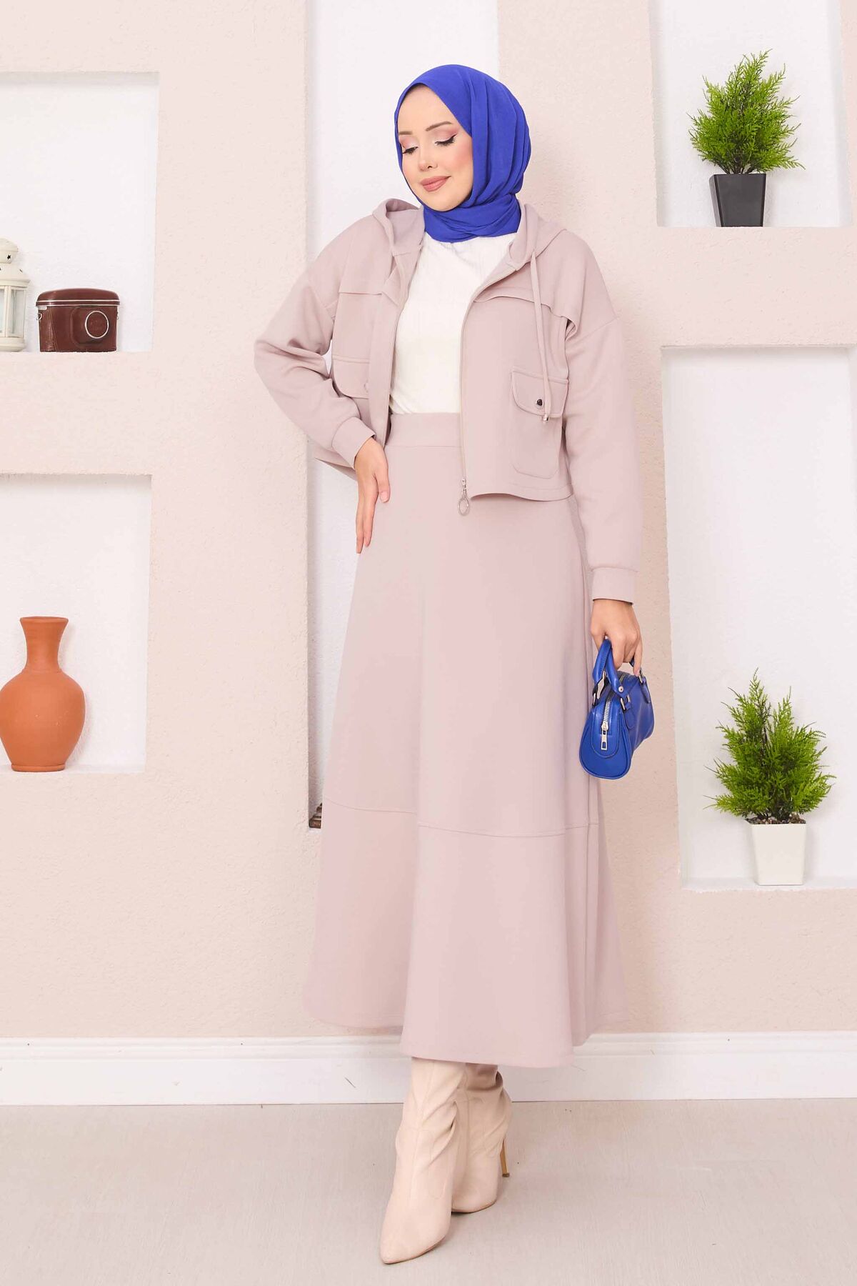 Fermuarlı Kapüşonlu Crop Etek Tesettür Takım Bej
