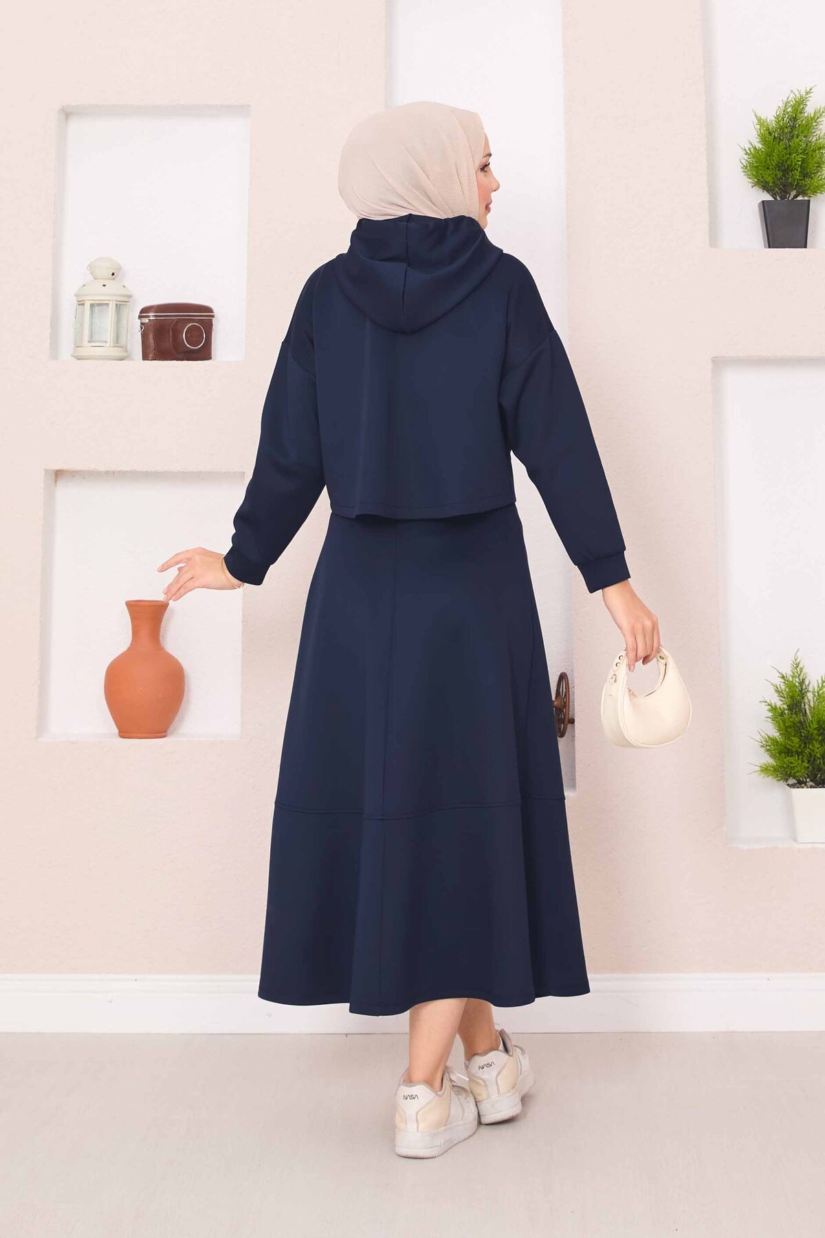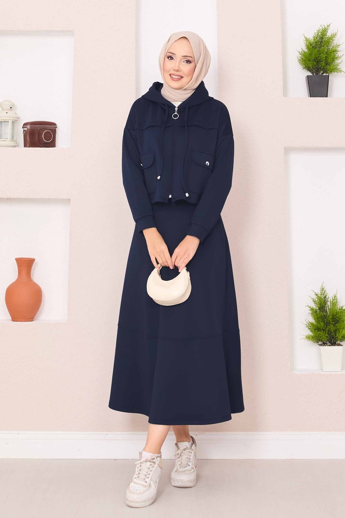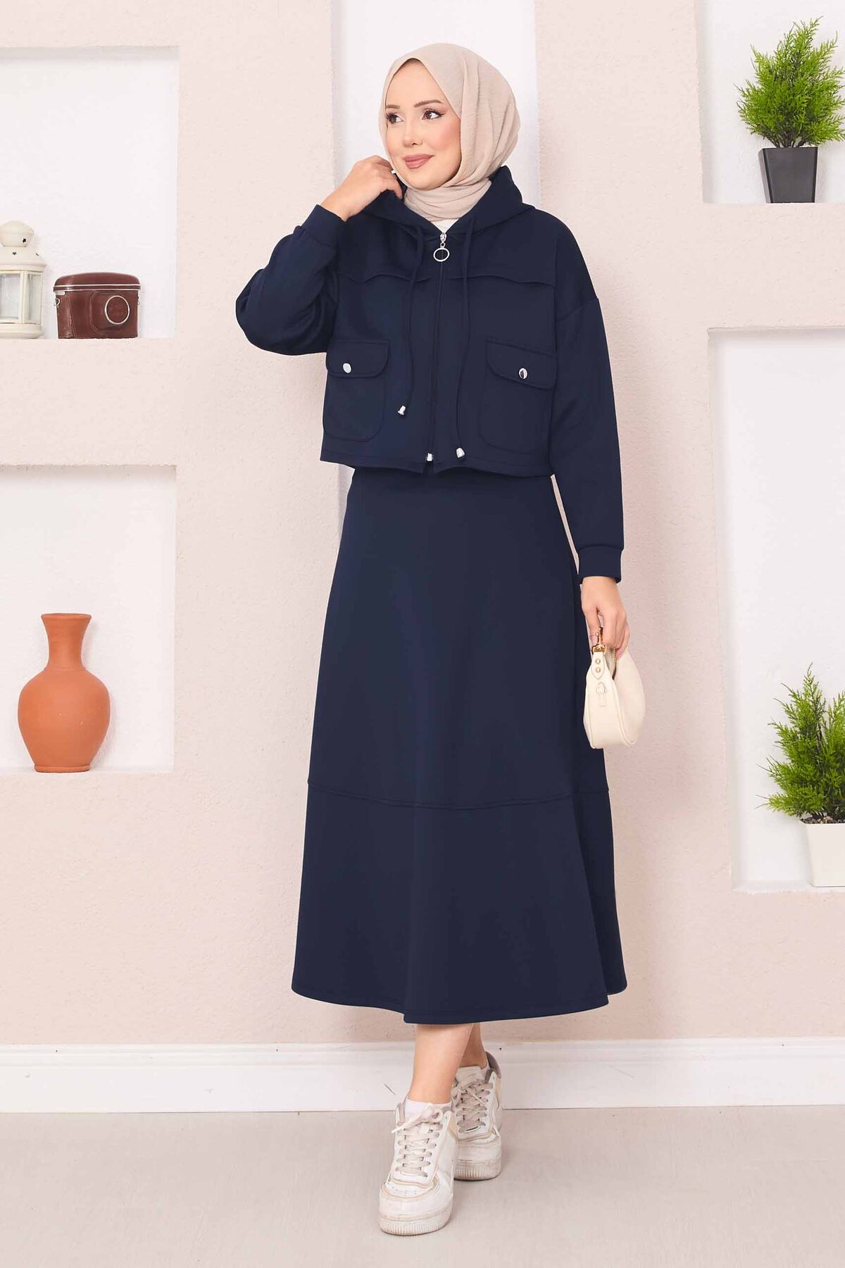 Fermuarlı Kapüşonlu Crop Etek Tesettür Takım Lacivert