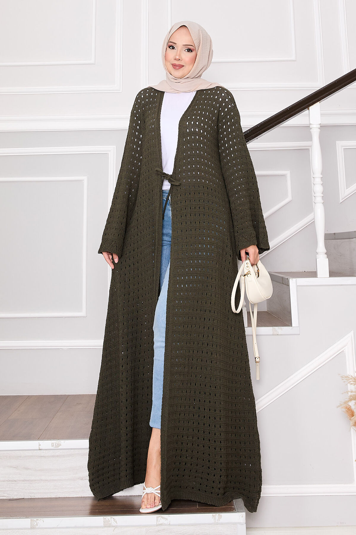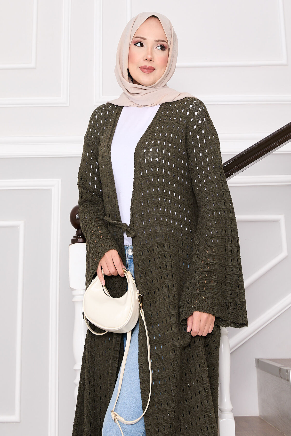 File Detaylı Önü Bağlamalı Triko Hırka Haki