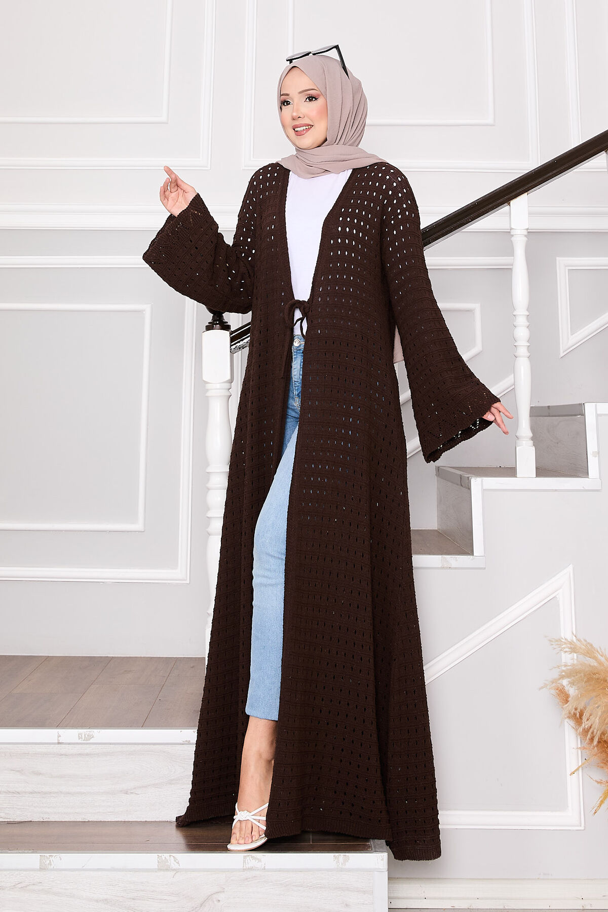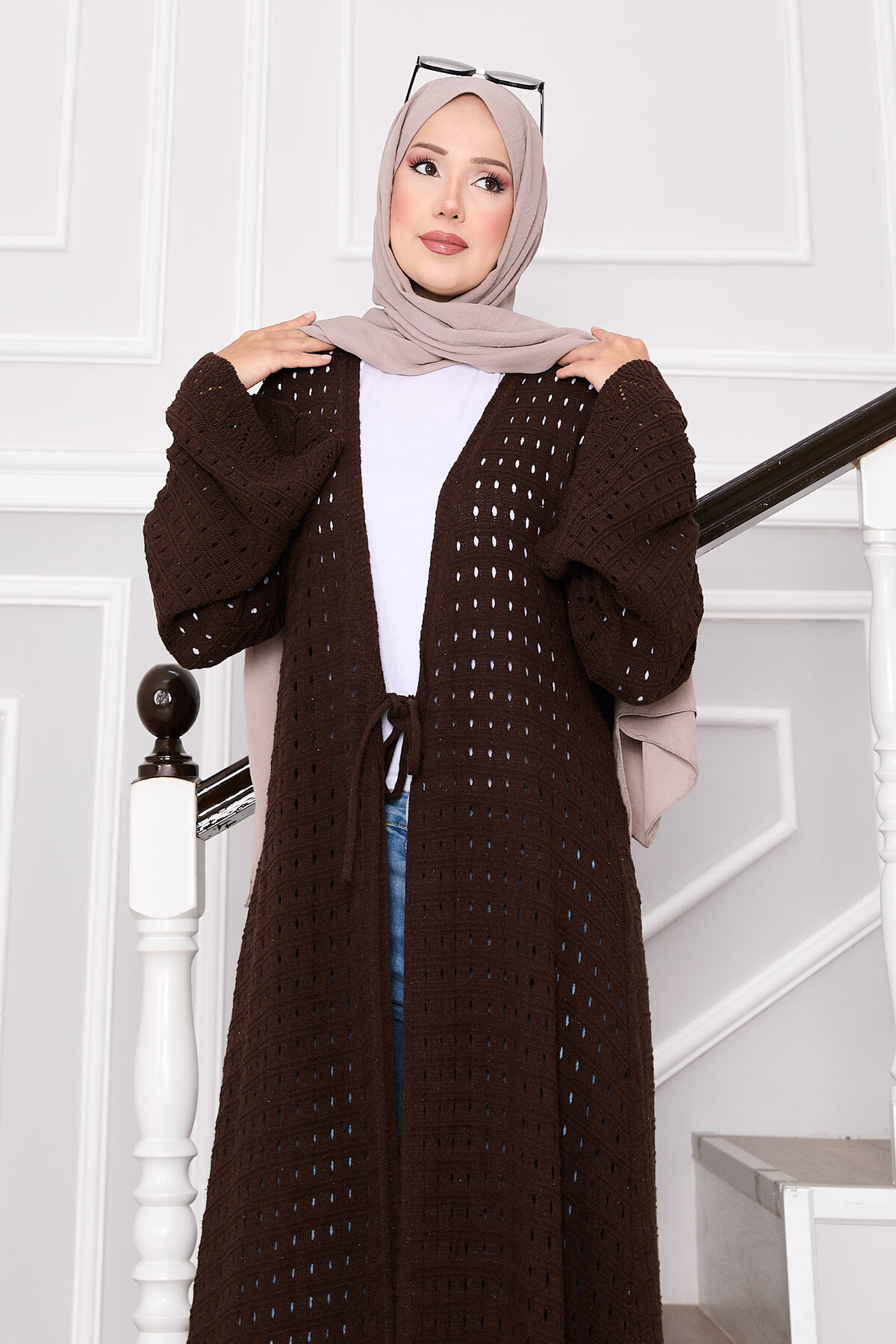File Detaylı Önü Bağlamalı Triko Hırka Kahve