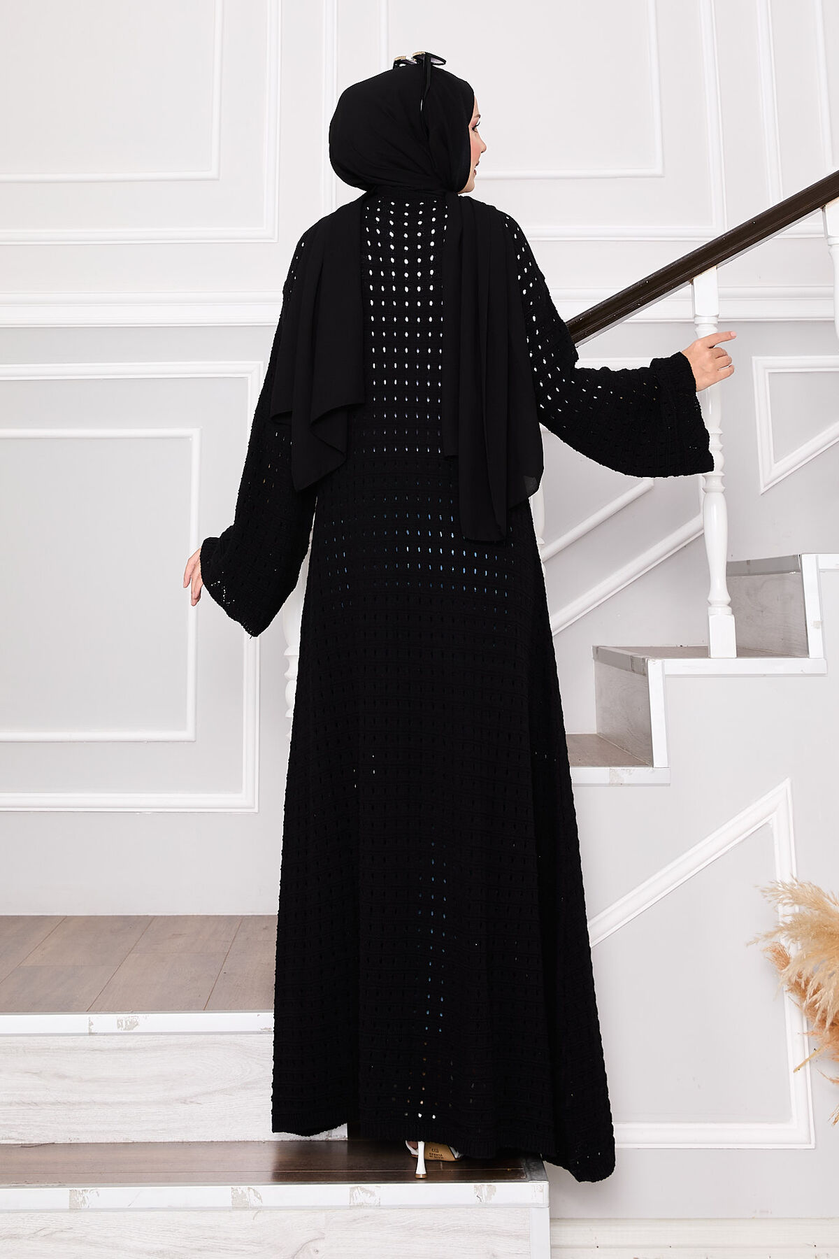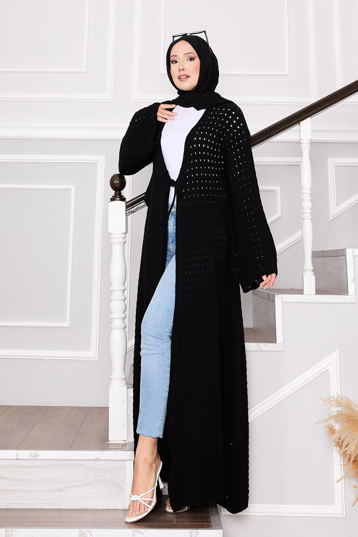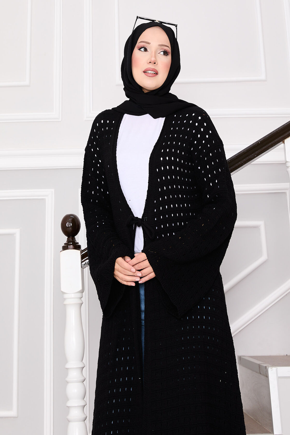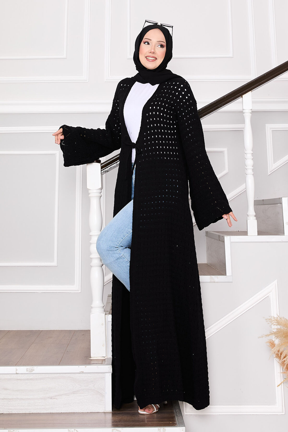 - Ürün mevsimliktir. Boydan delik file detaylı önden kendinden ip bağcıklı kolları salaş triko hırka