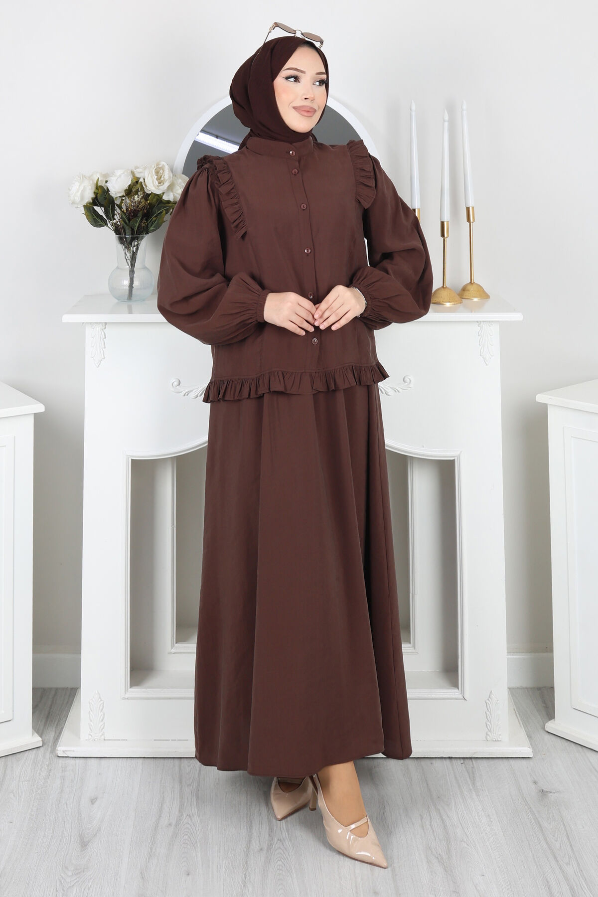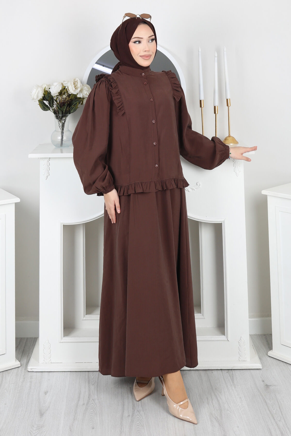 Fırfır Detaylı Düğmeli Etekli Takım Kahve