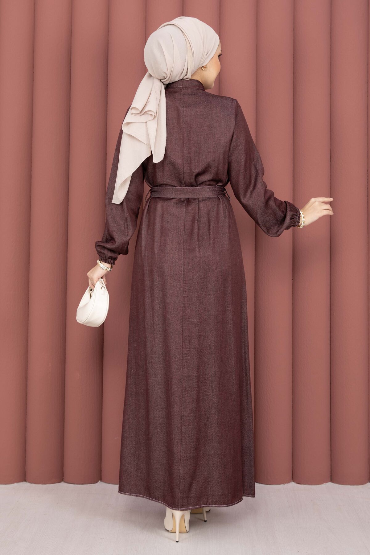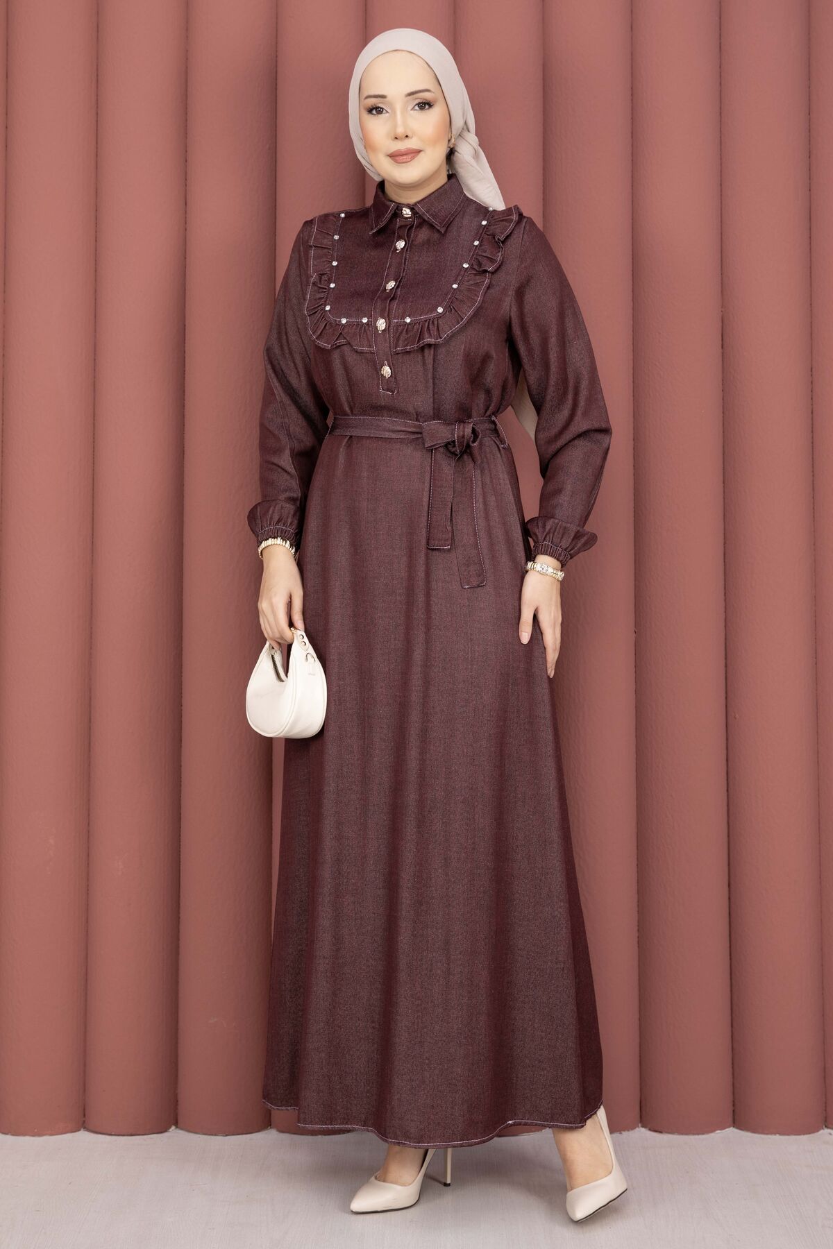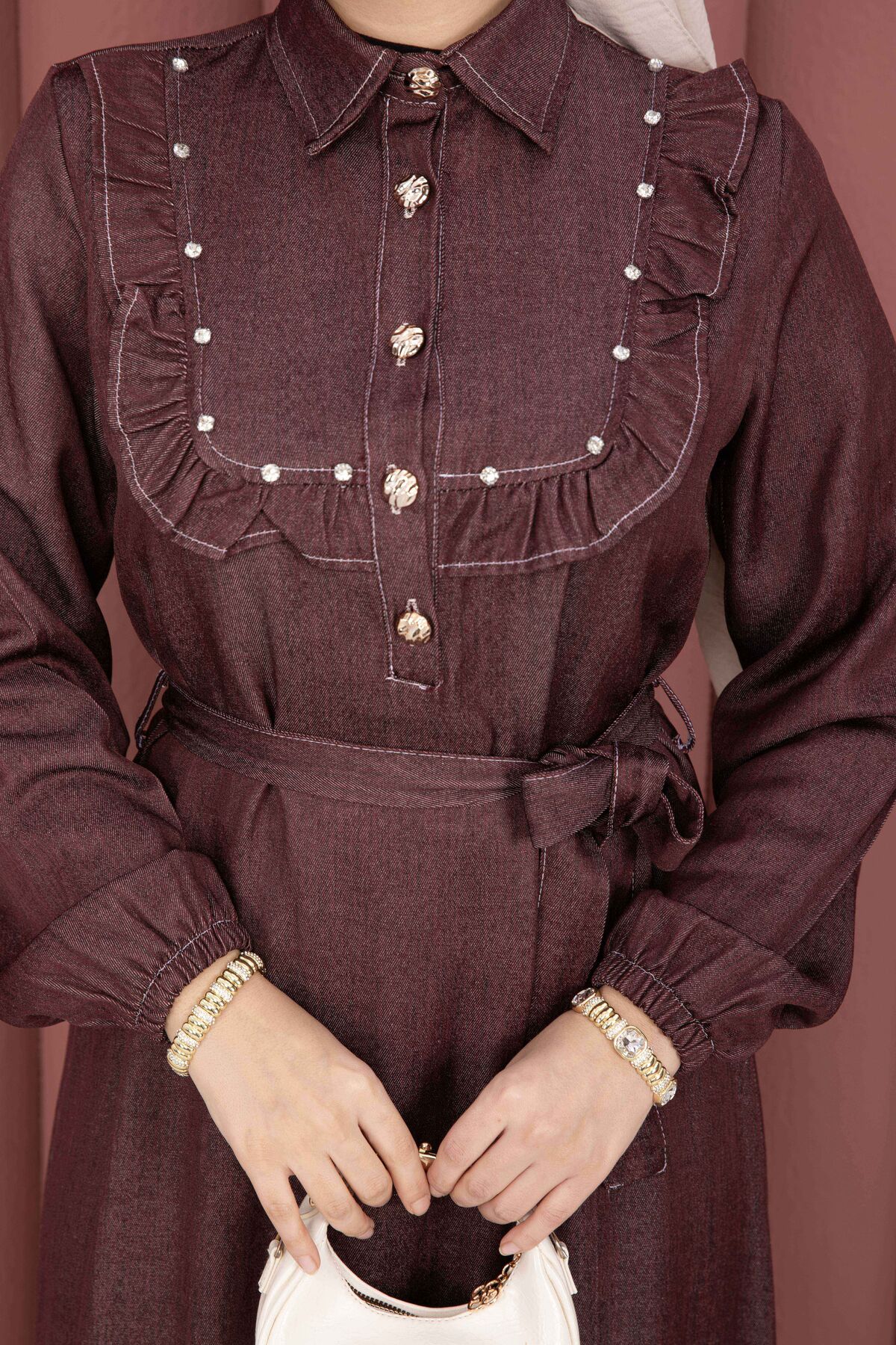 Fırfırlı Yaka Yarım Düğmeli Tensel Kot Elbise Bordo Yorumları