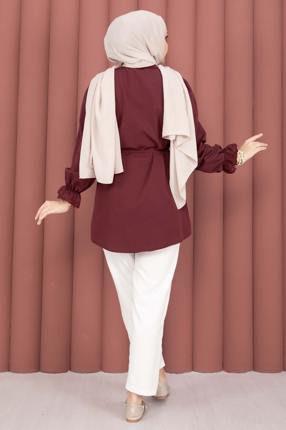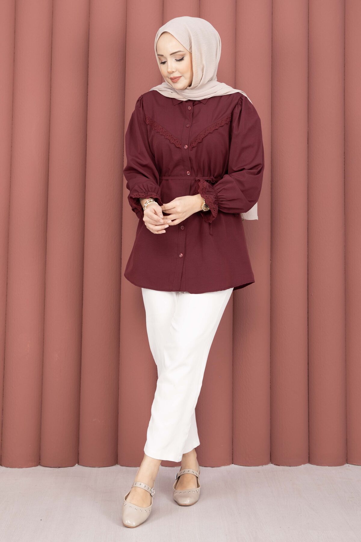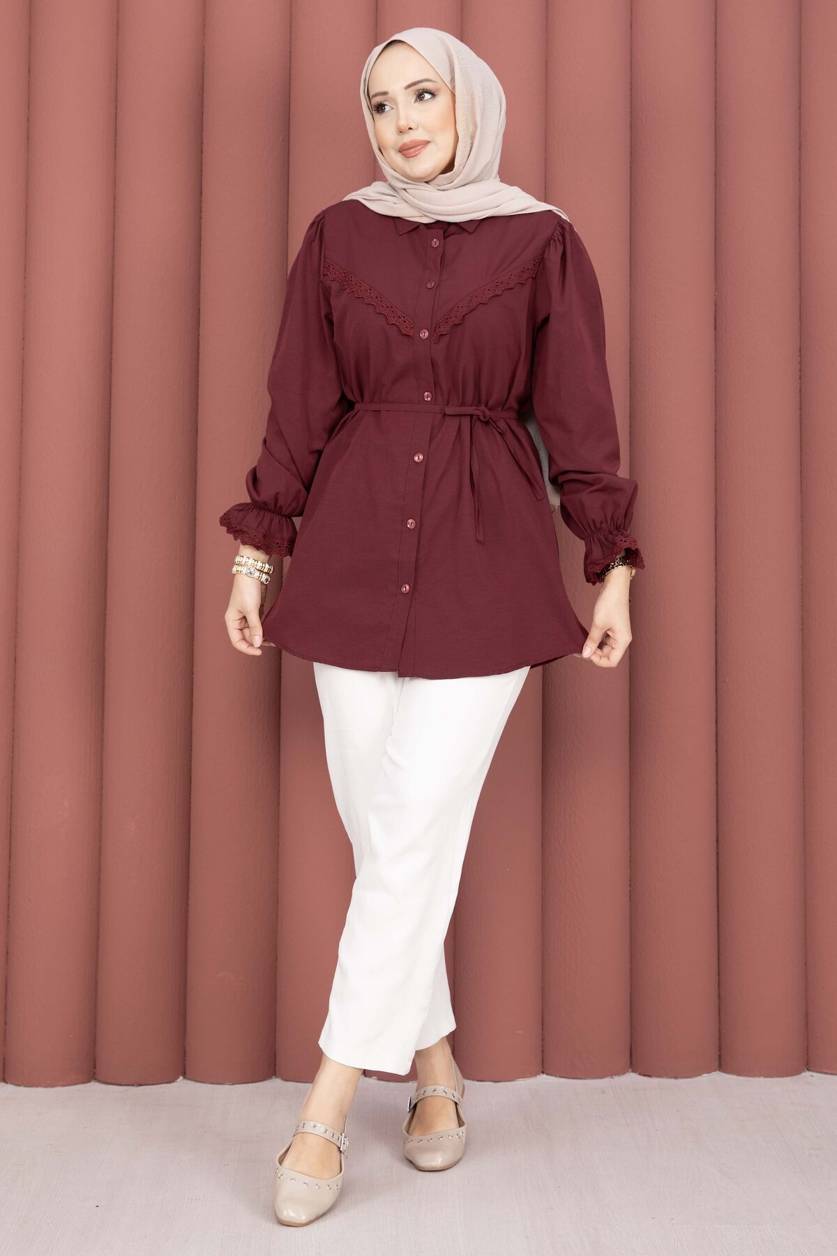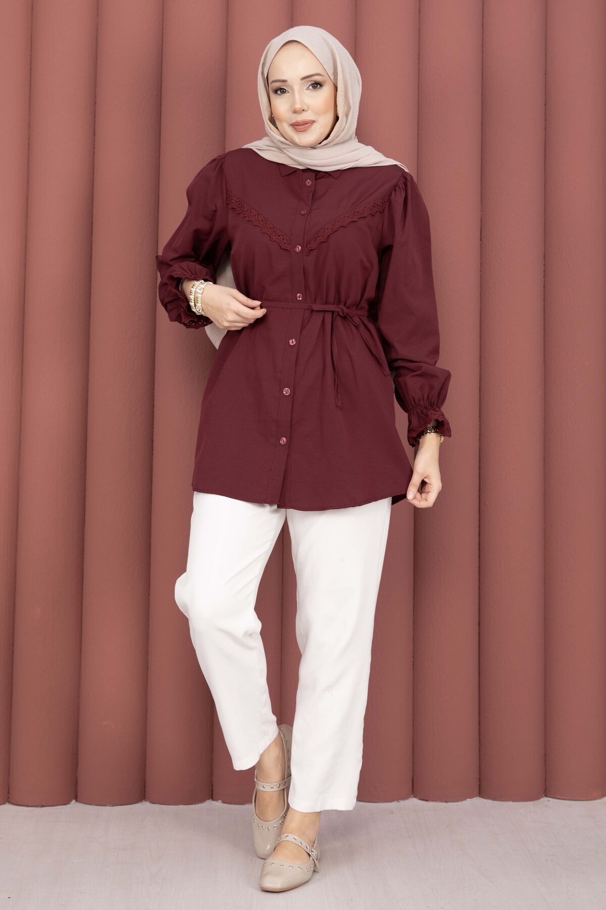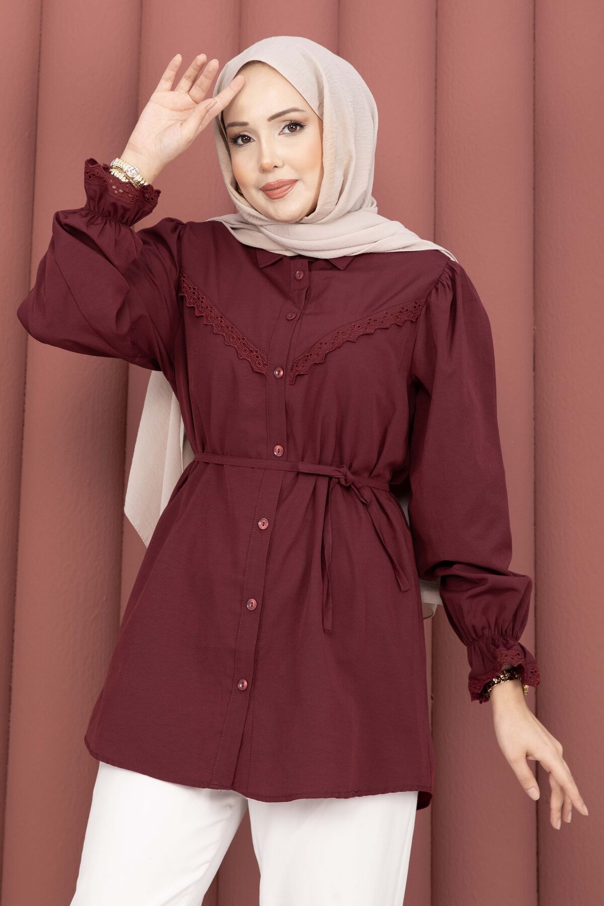 Fisto Detaylı Bağcıklı Gömlek Bordo