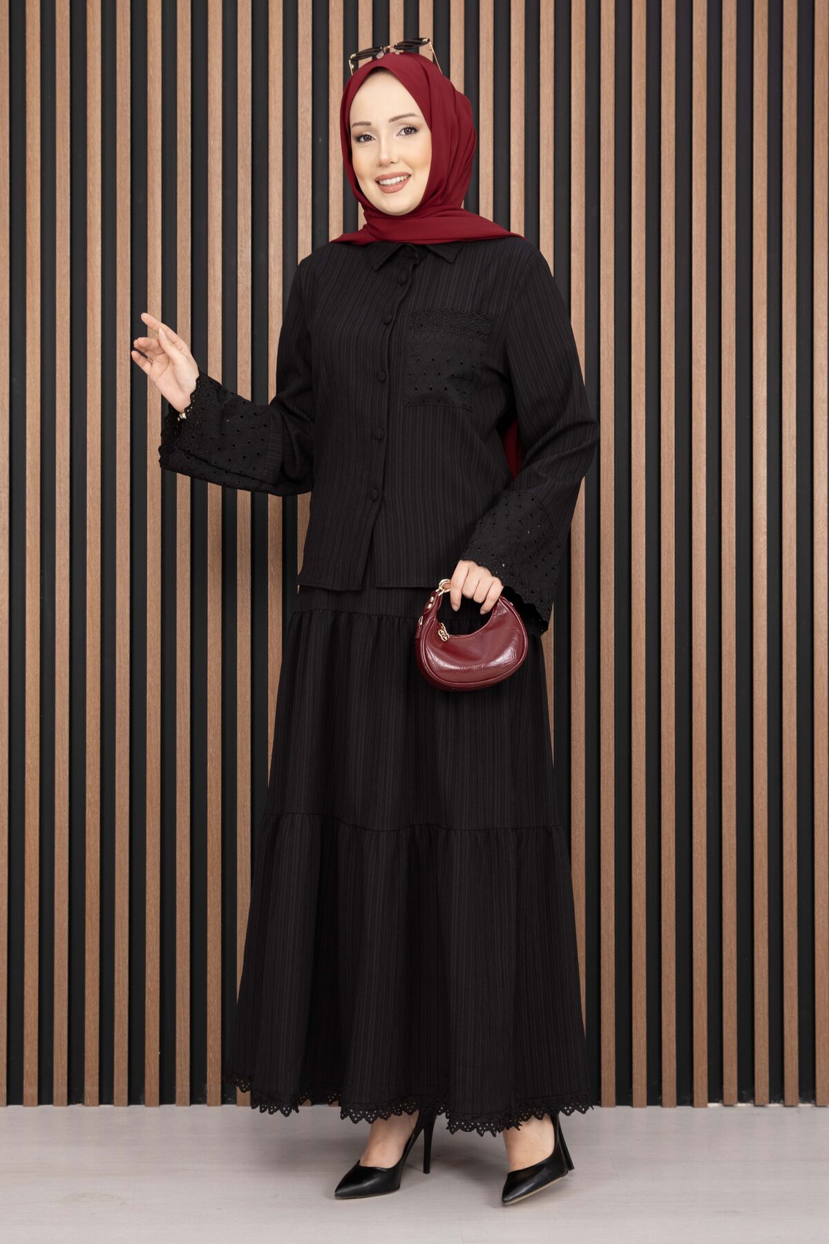 Zarif fistolu detayları ve feminen tasarımıyla öne çıkan Fistolu Gömlek Etek İkili Takım, hem günlük kombinlerde hem de özel günlerde şıklık sunar. Akışkan ve rahat yapısıyla gün boyu konfor sağlar.
