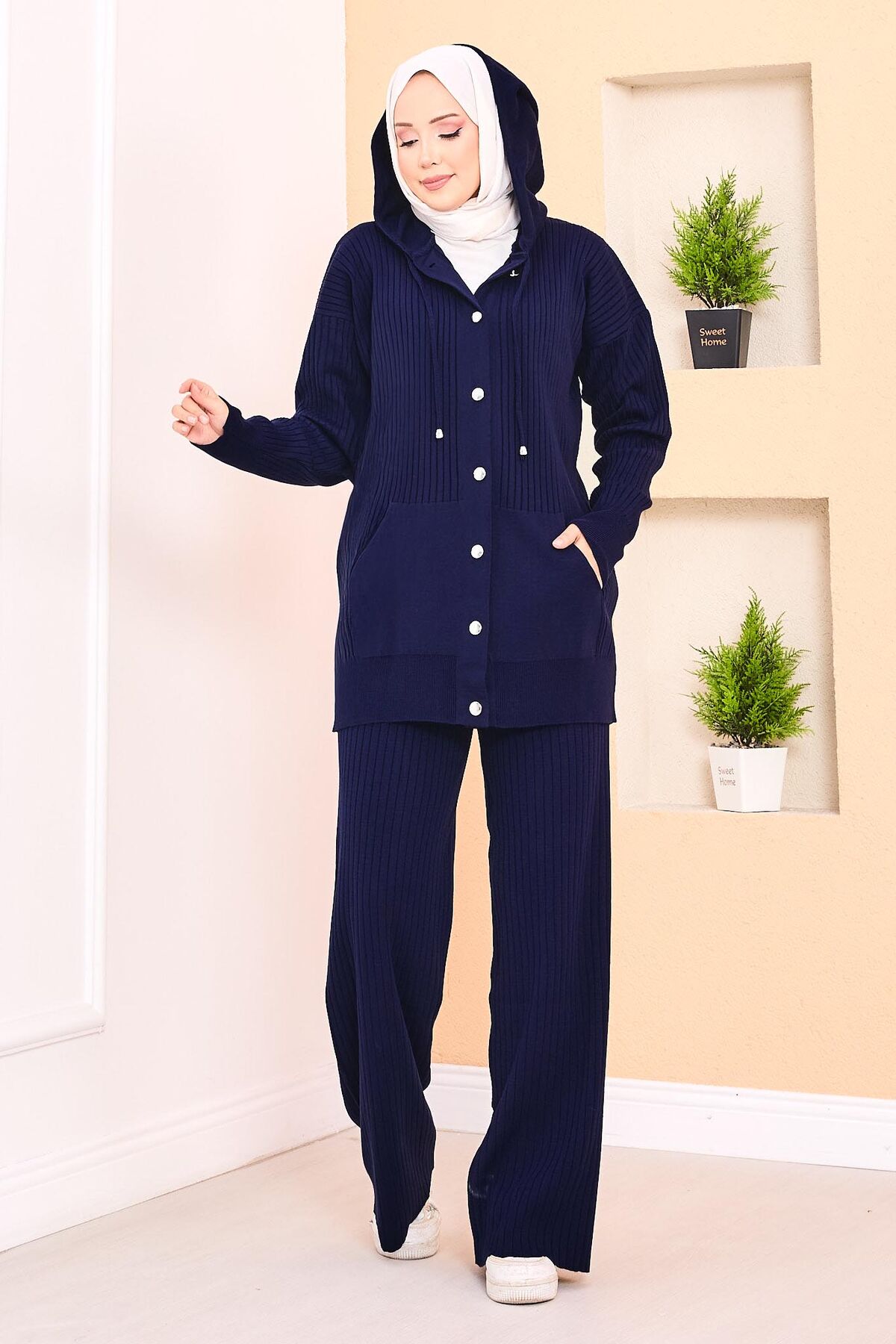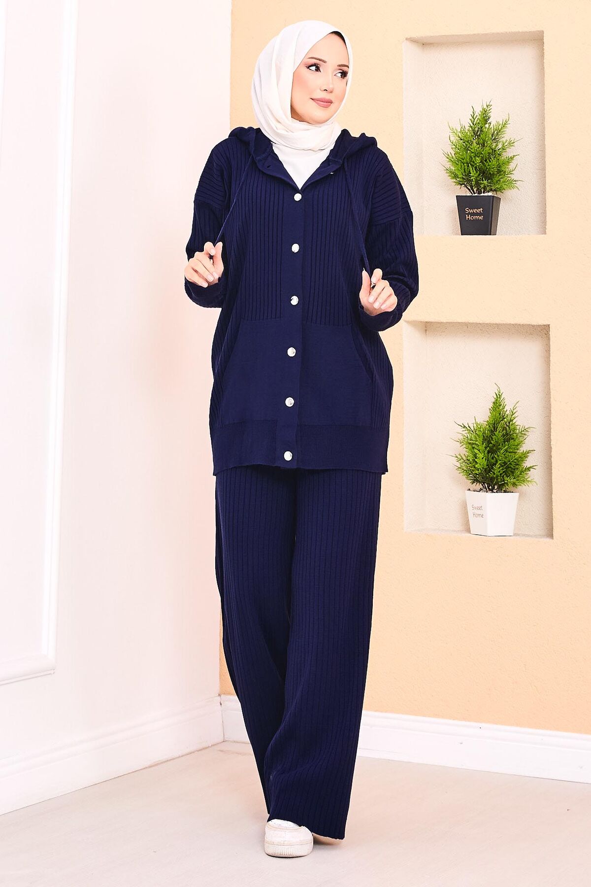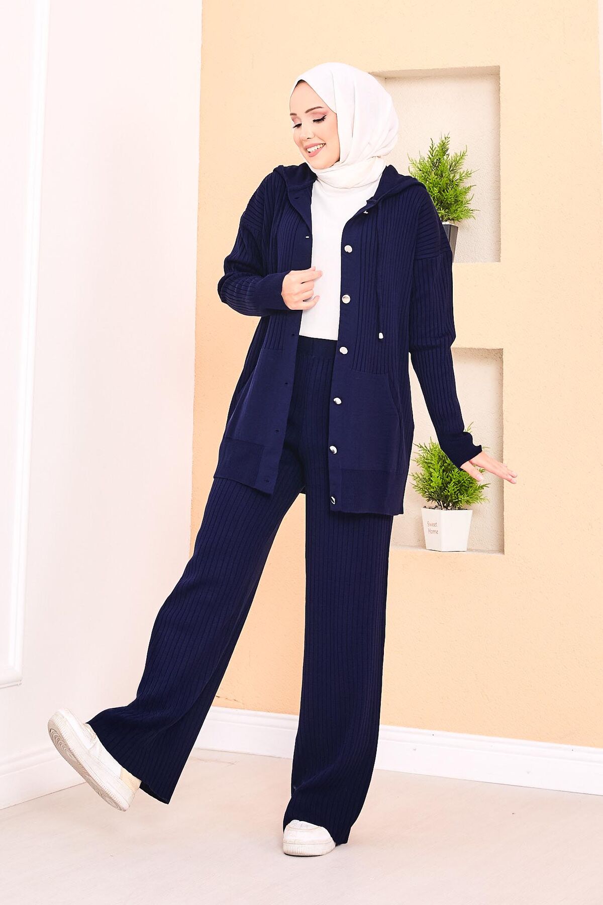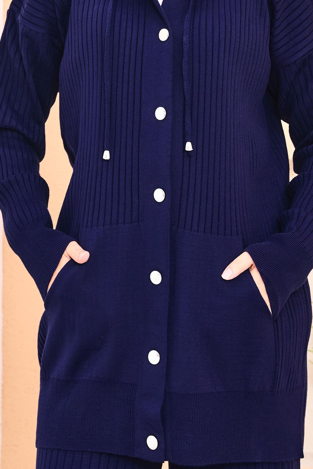 Fitilli Kapüşonlu Cepli Triko Tesettür Takım Lacivert