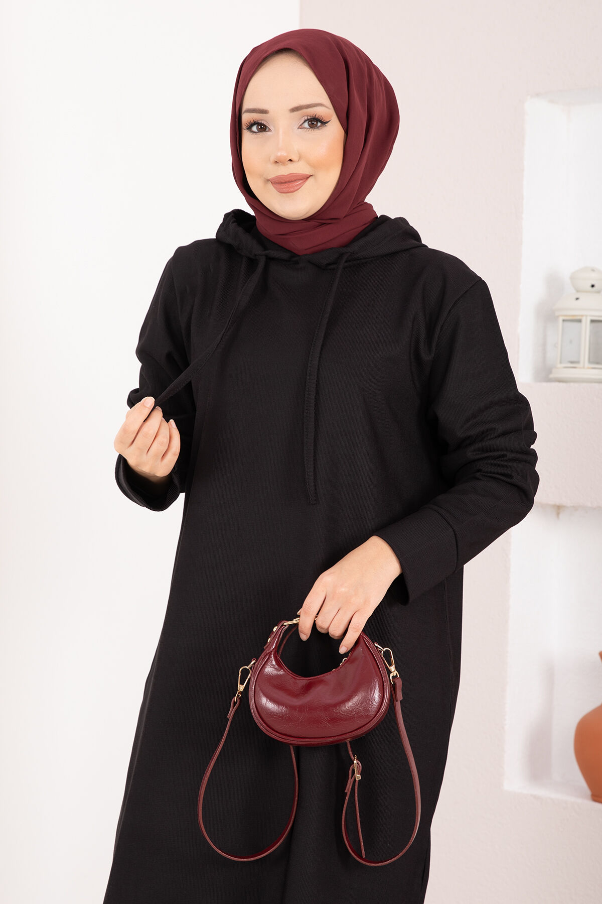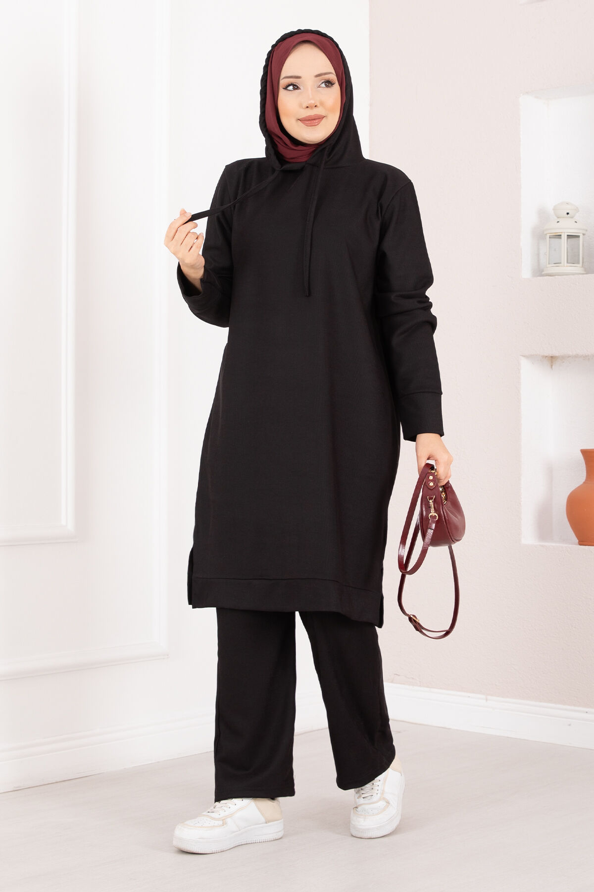 Fitilli Kapüşonlu Tesettür İkili Takım Siyah