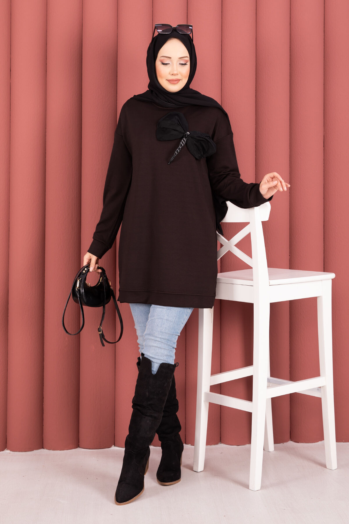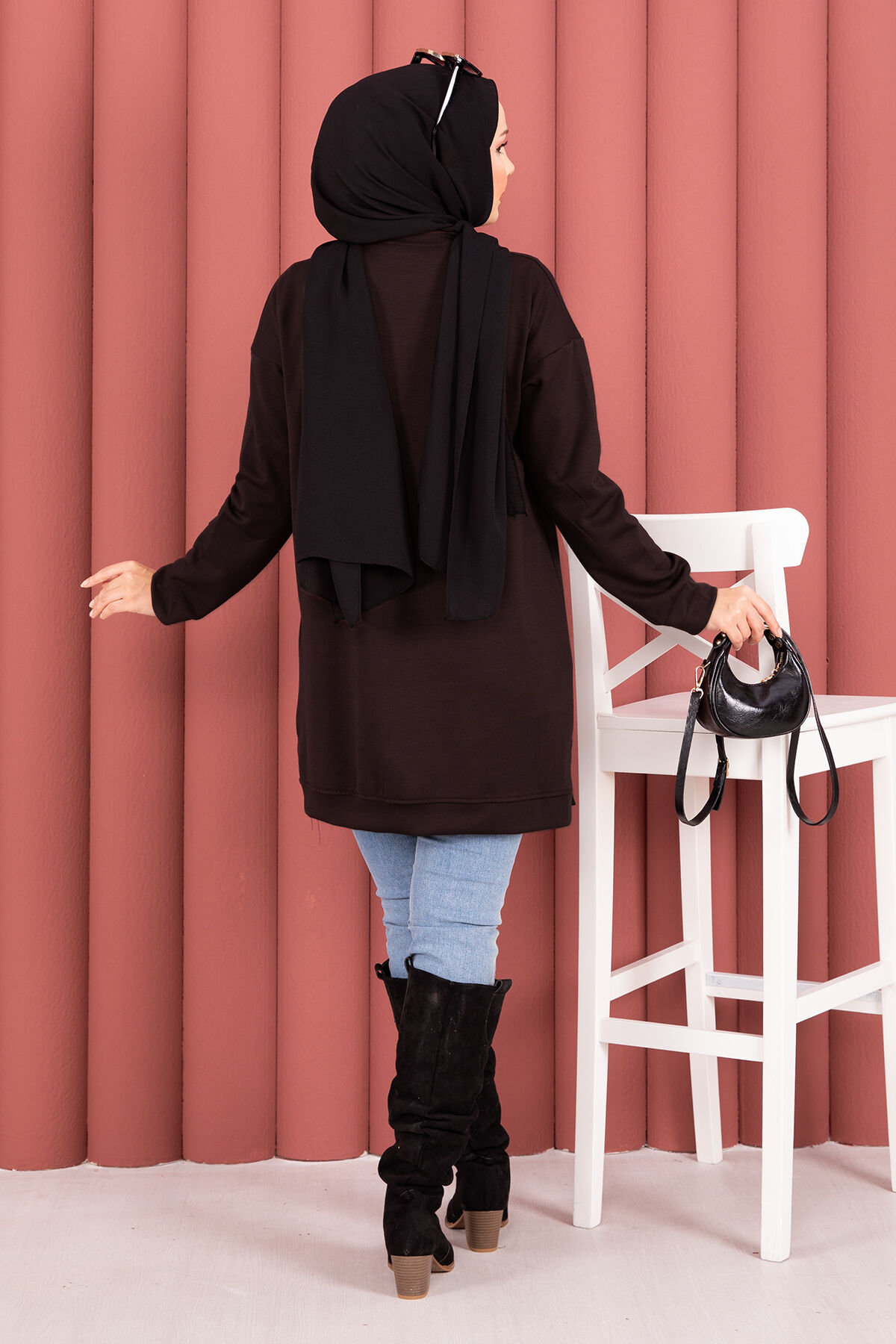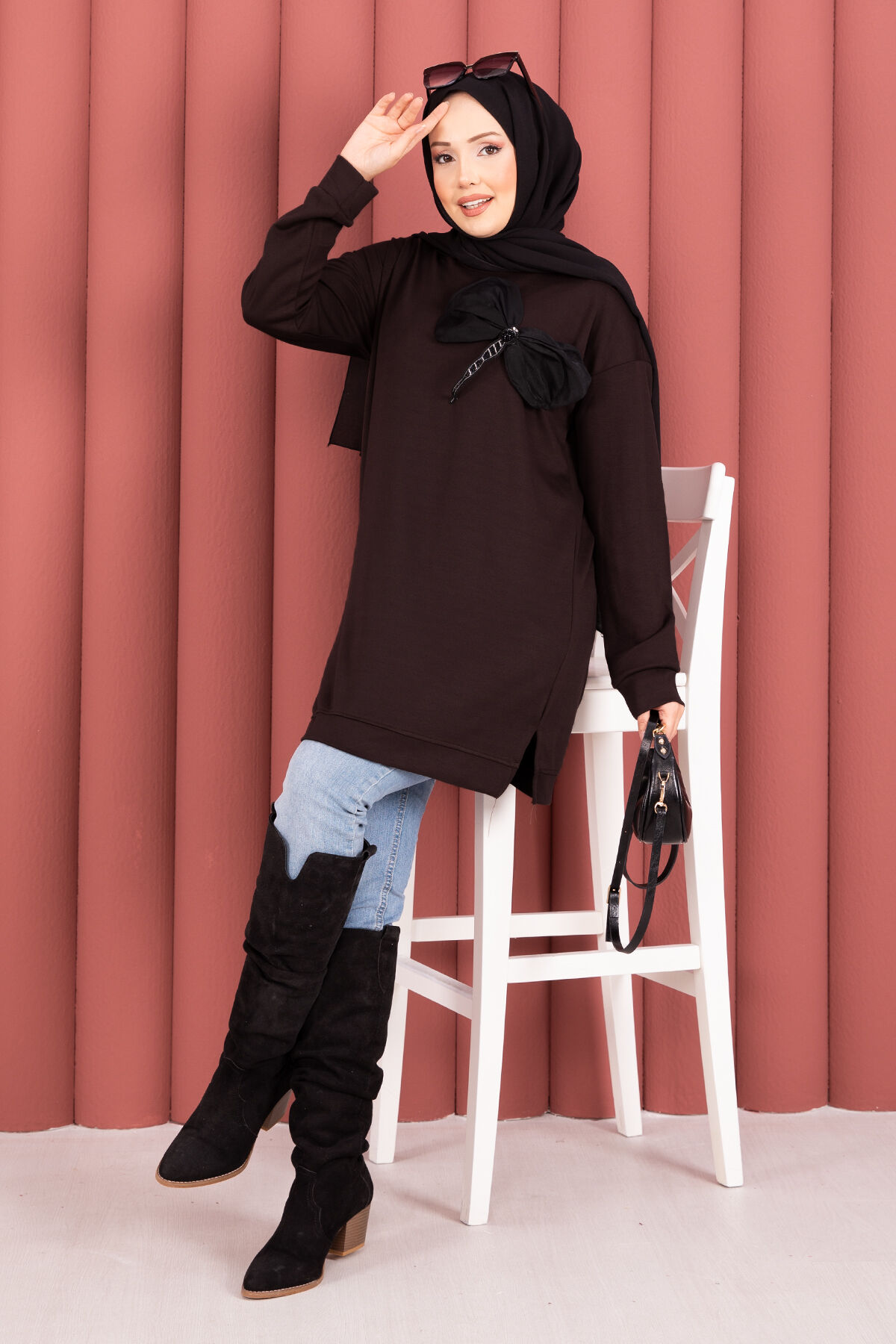 Fiyonk Detaylı Taş İşlemeli Oyşo Tesettür Tunik Kahve