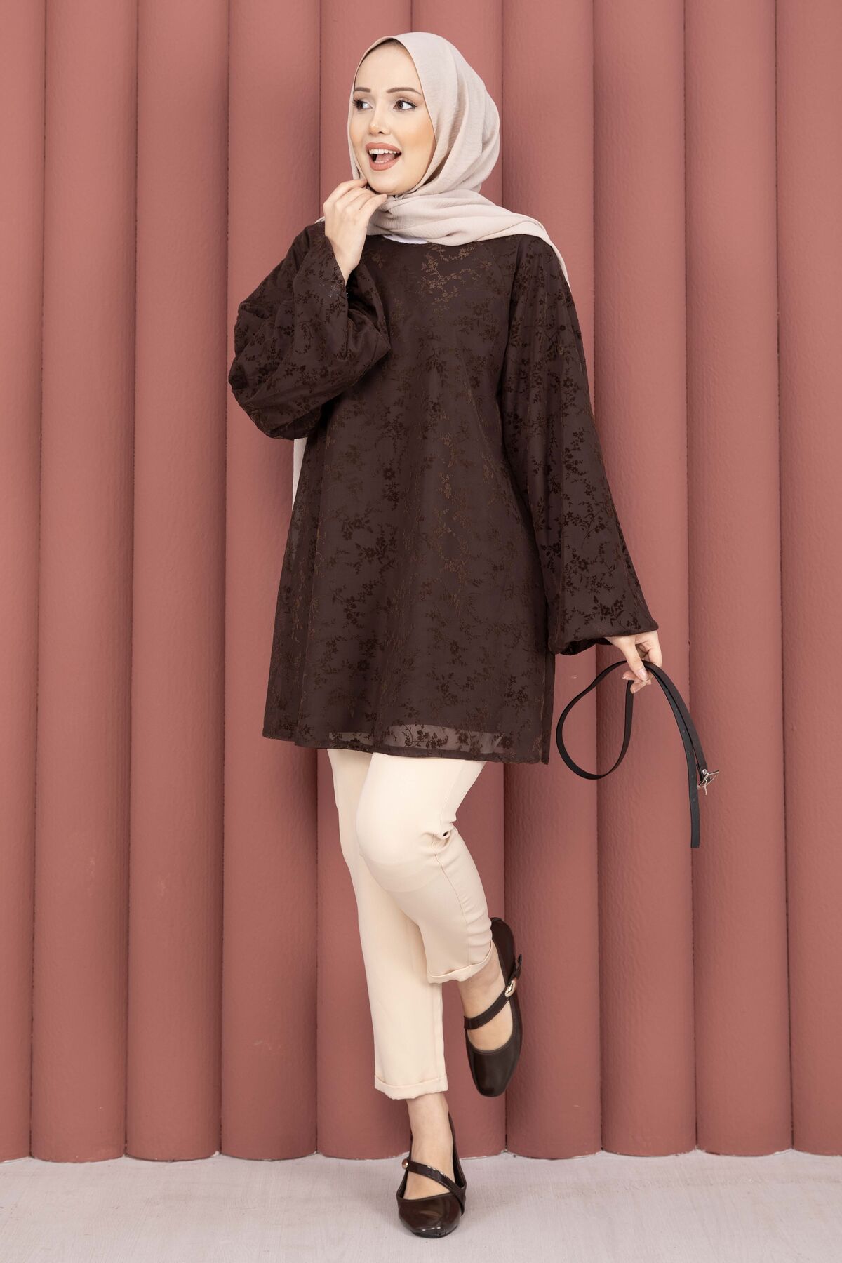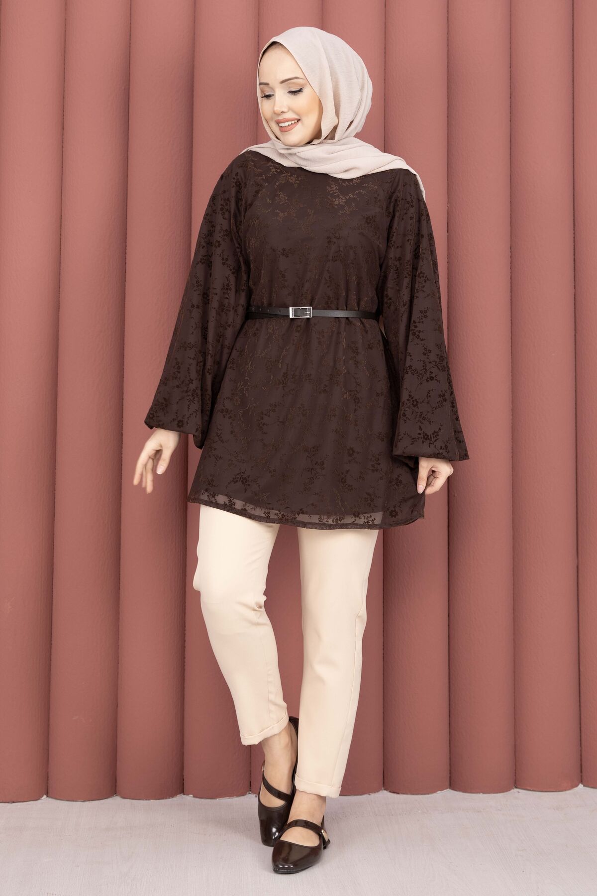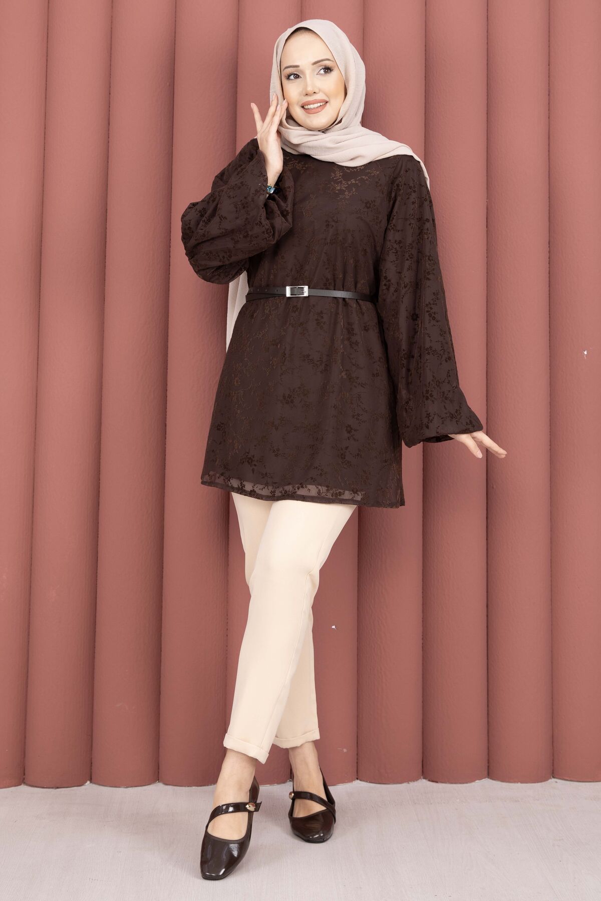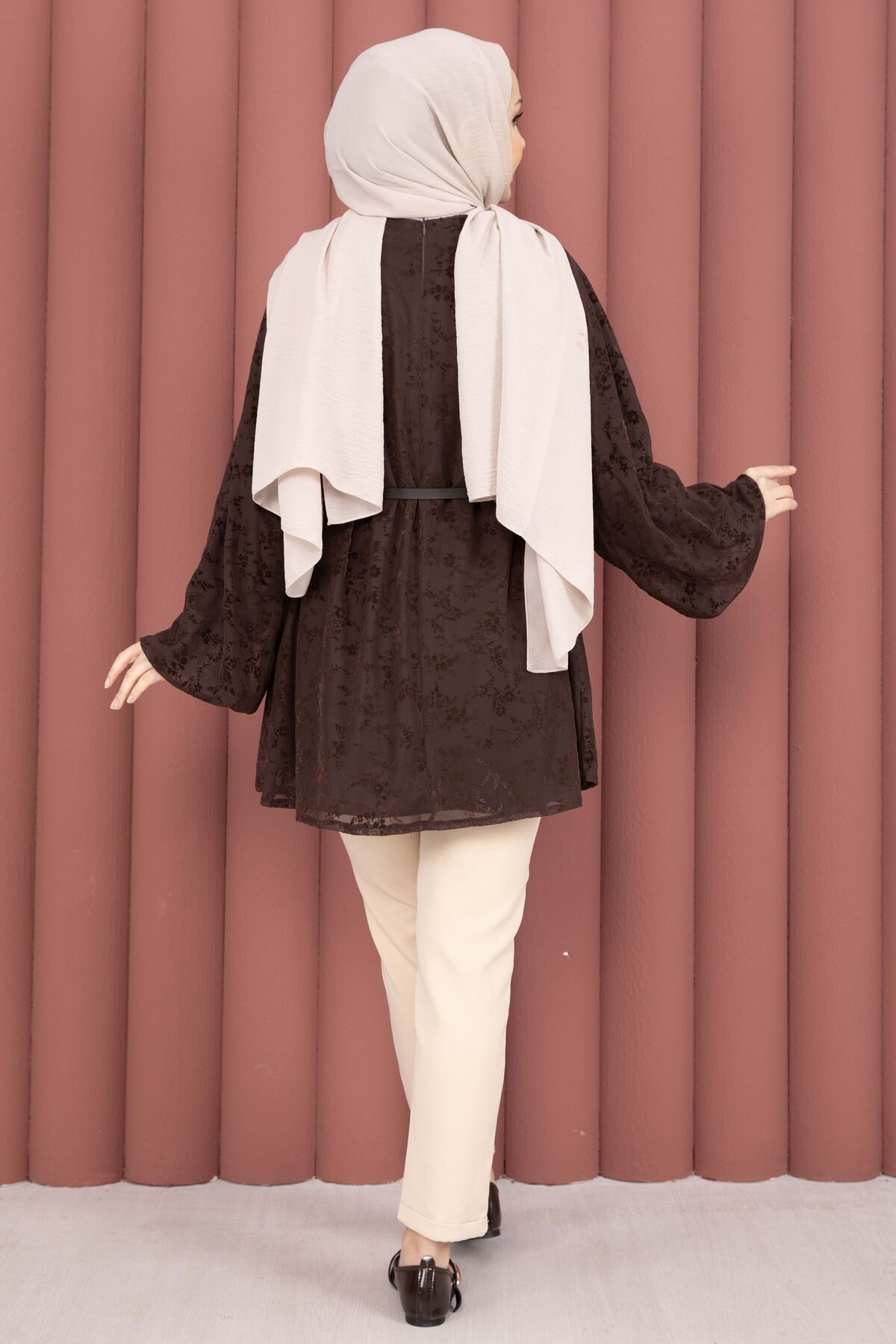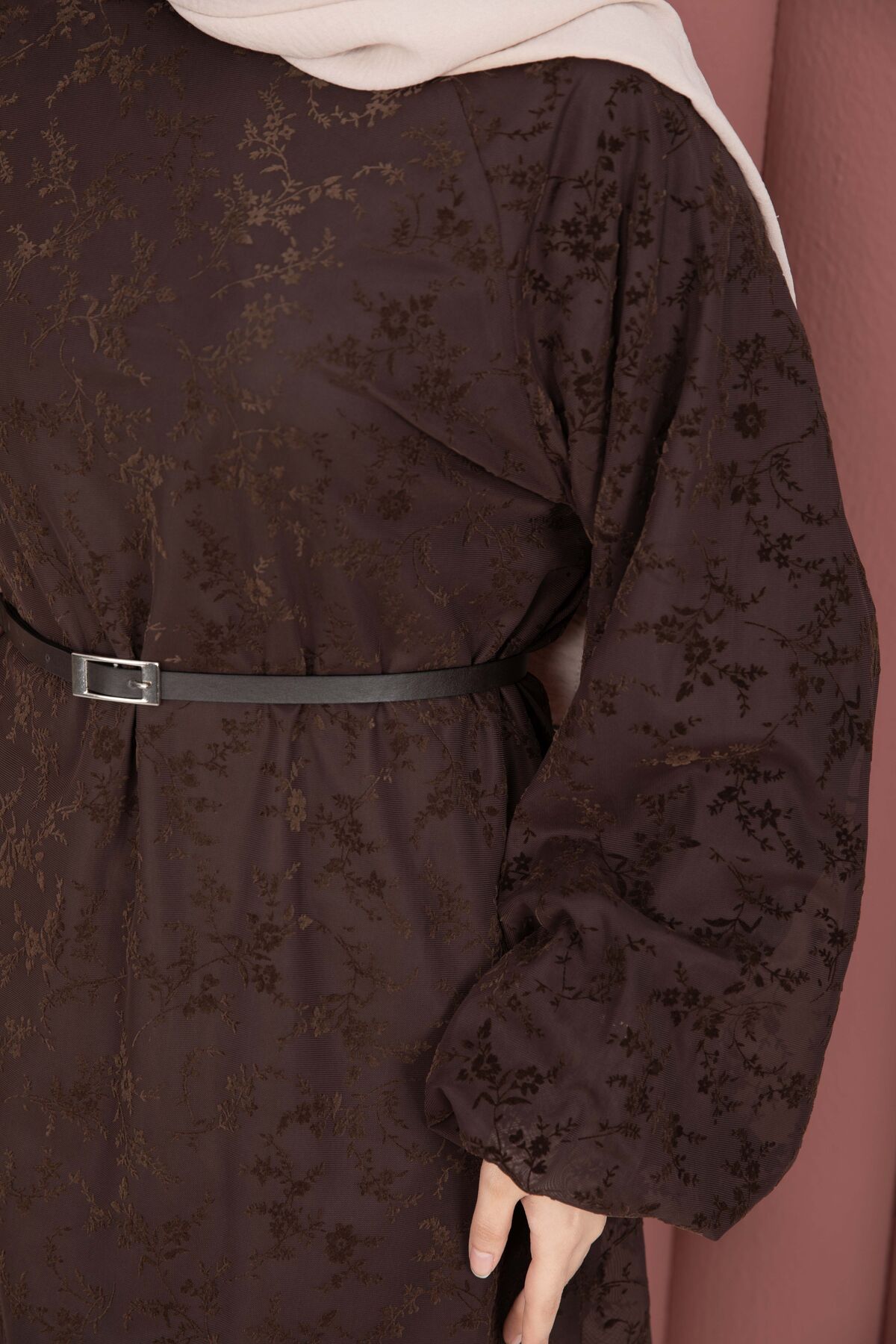 Flok Baskı Balon Kol Kemerli Tunik Kahve