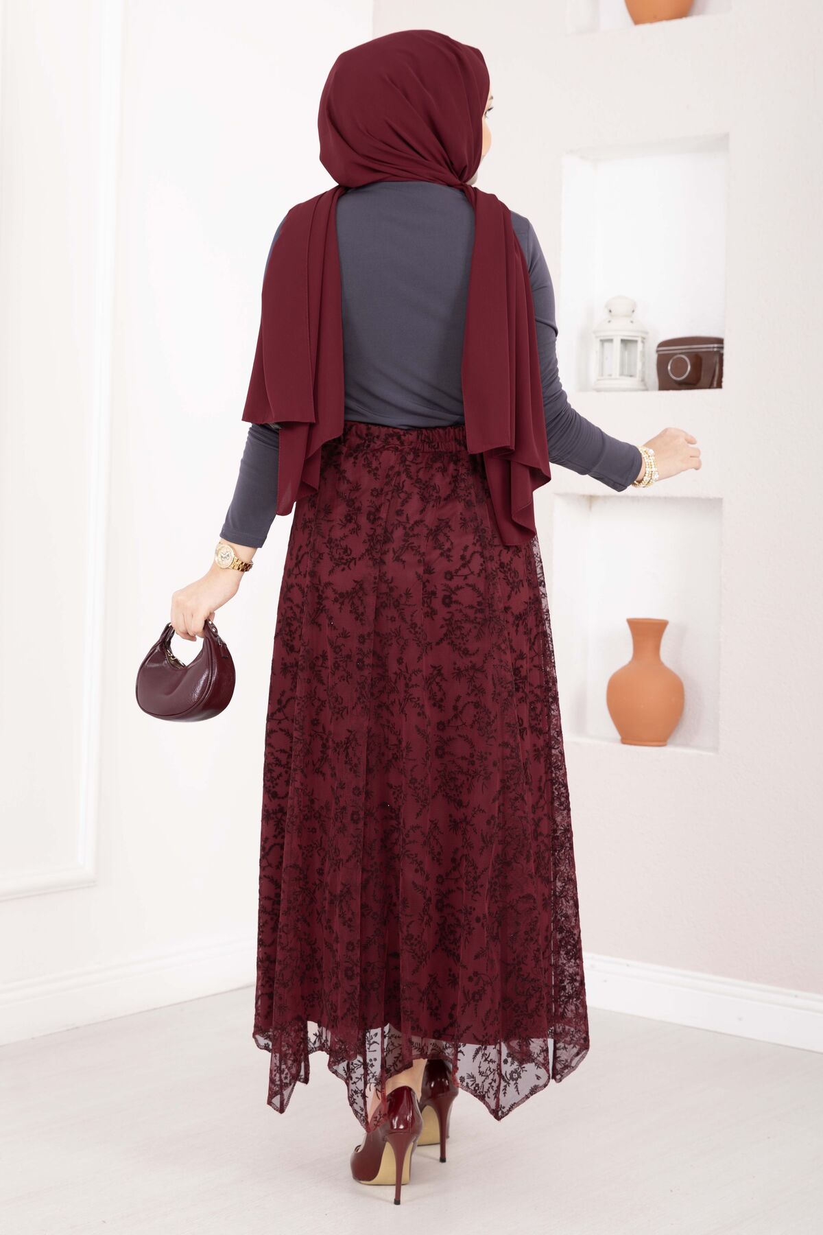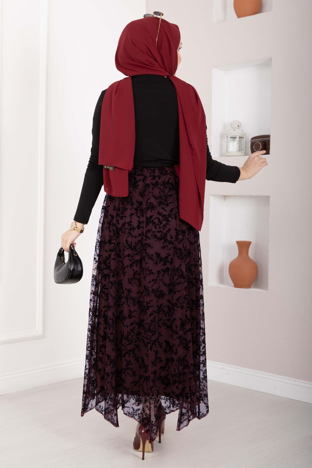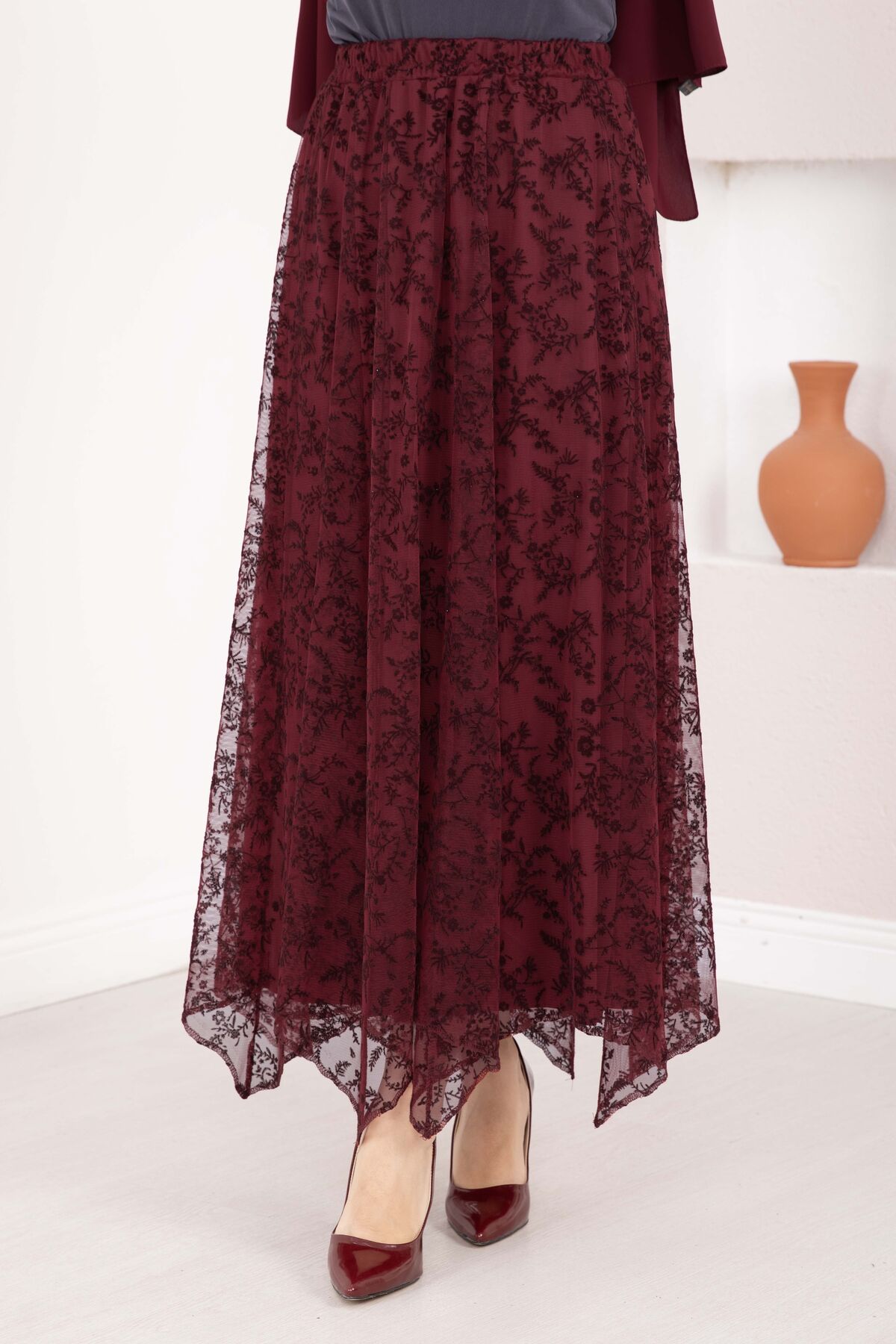 Flok Baskılı Asimetrik Kesim Tül Etek Bordo