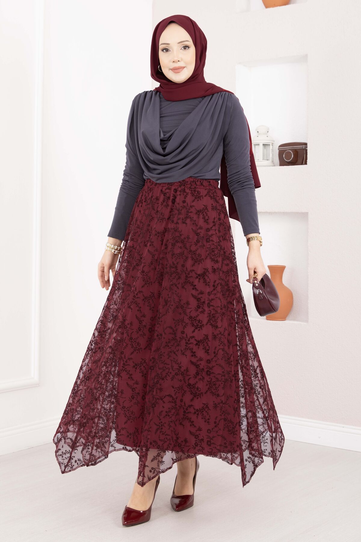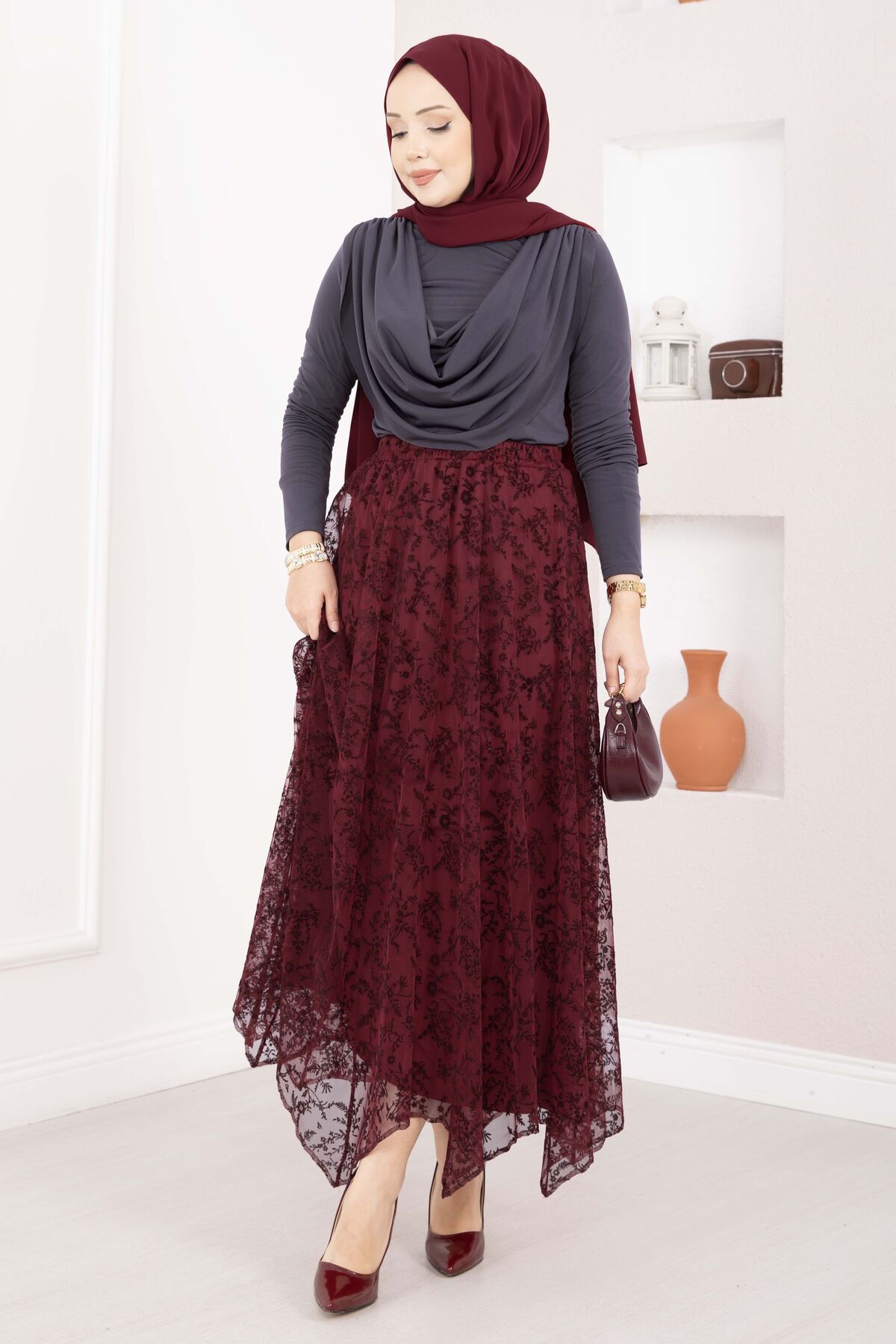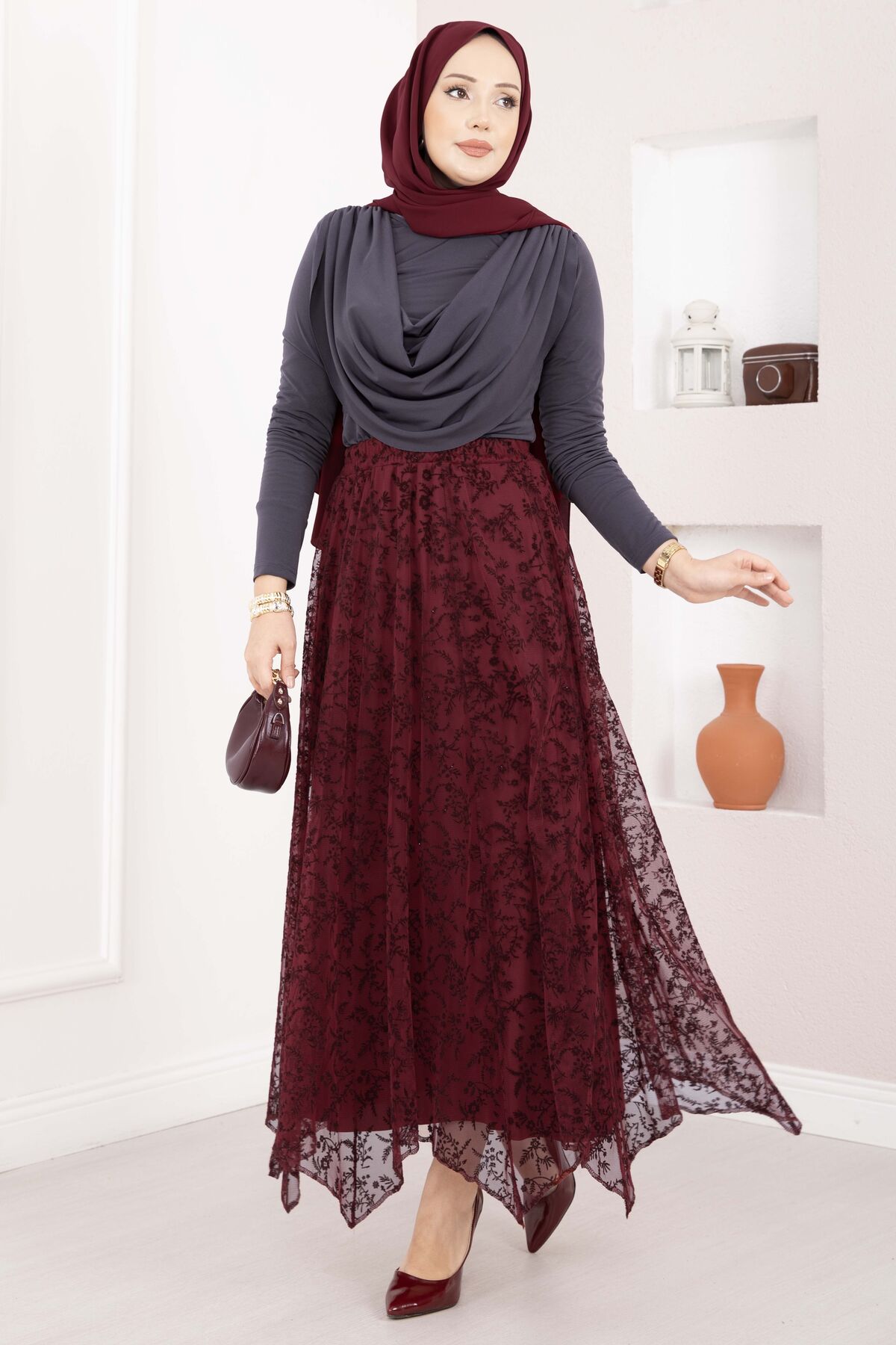 Flok Baskılı Asimetrik Kesim Tül Etek Bordo