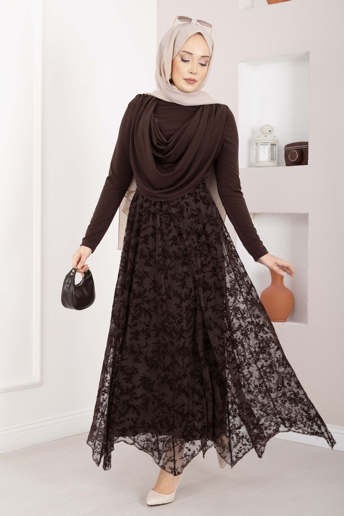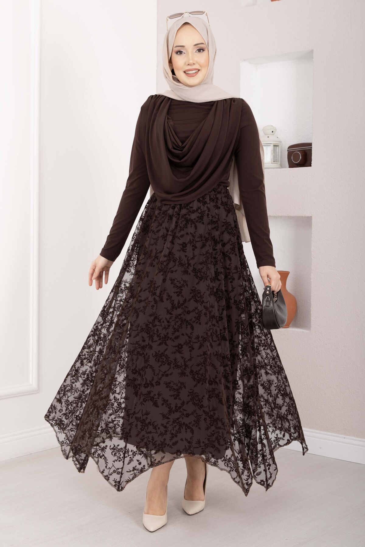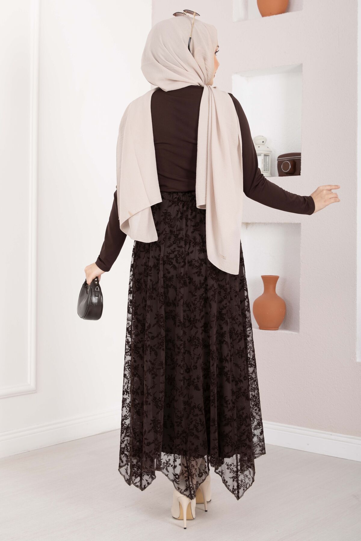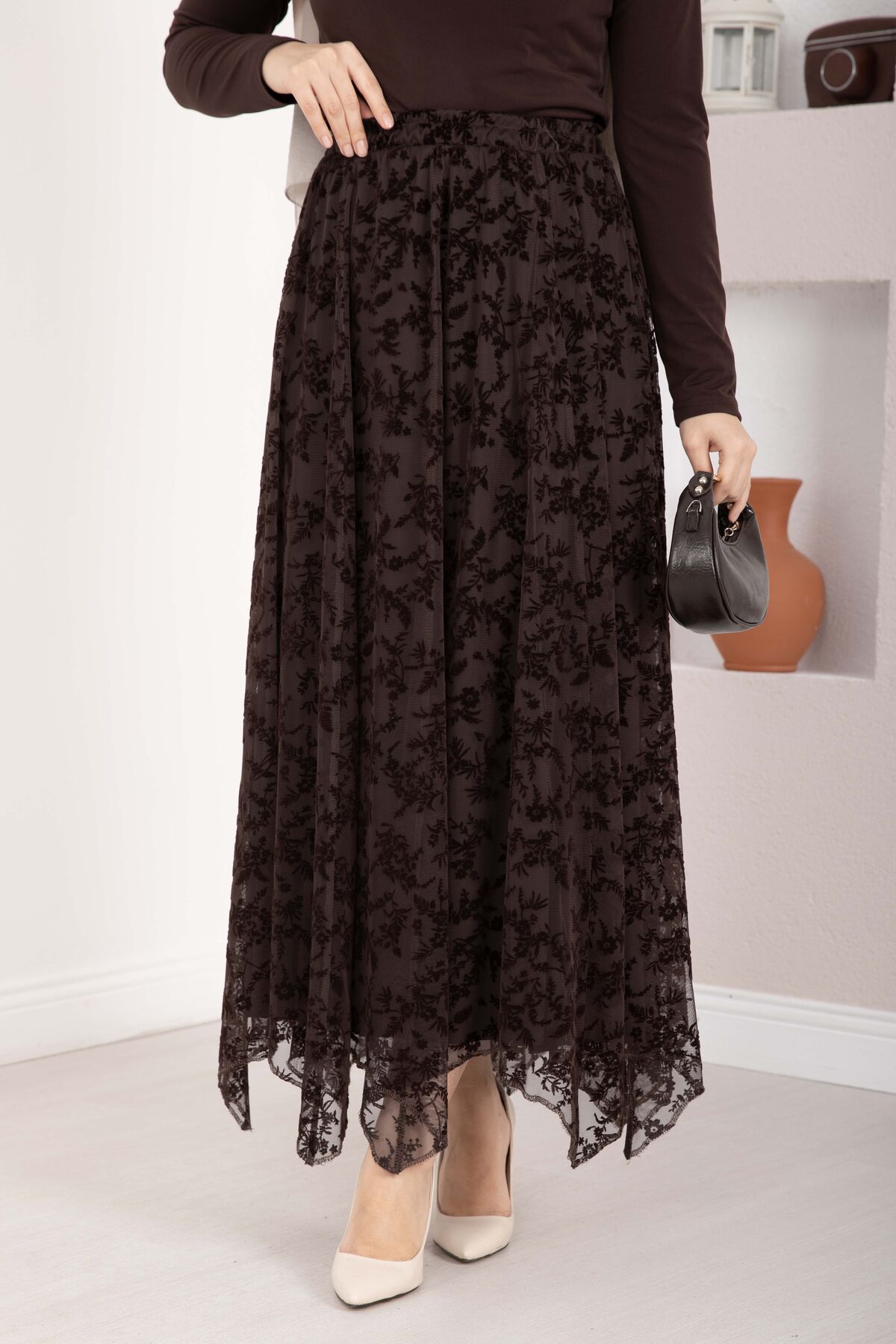 Flok Baskılı Asimetrik Kesim Tül Etek Kahve
