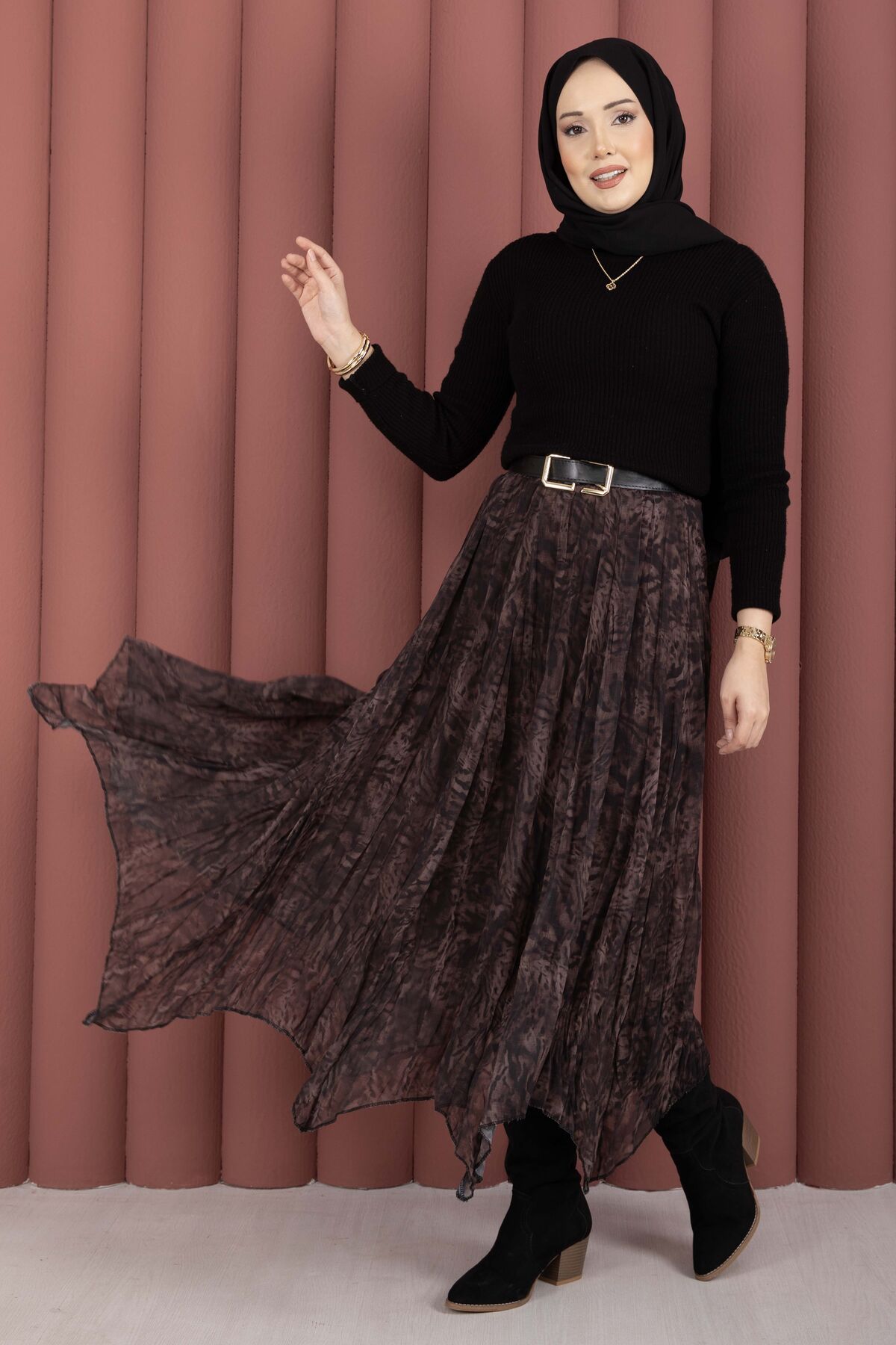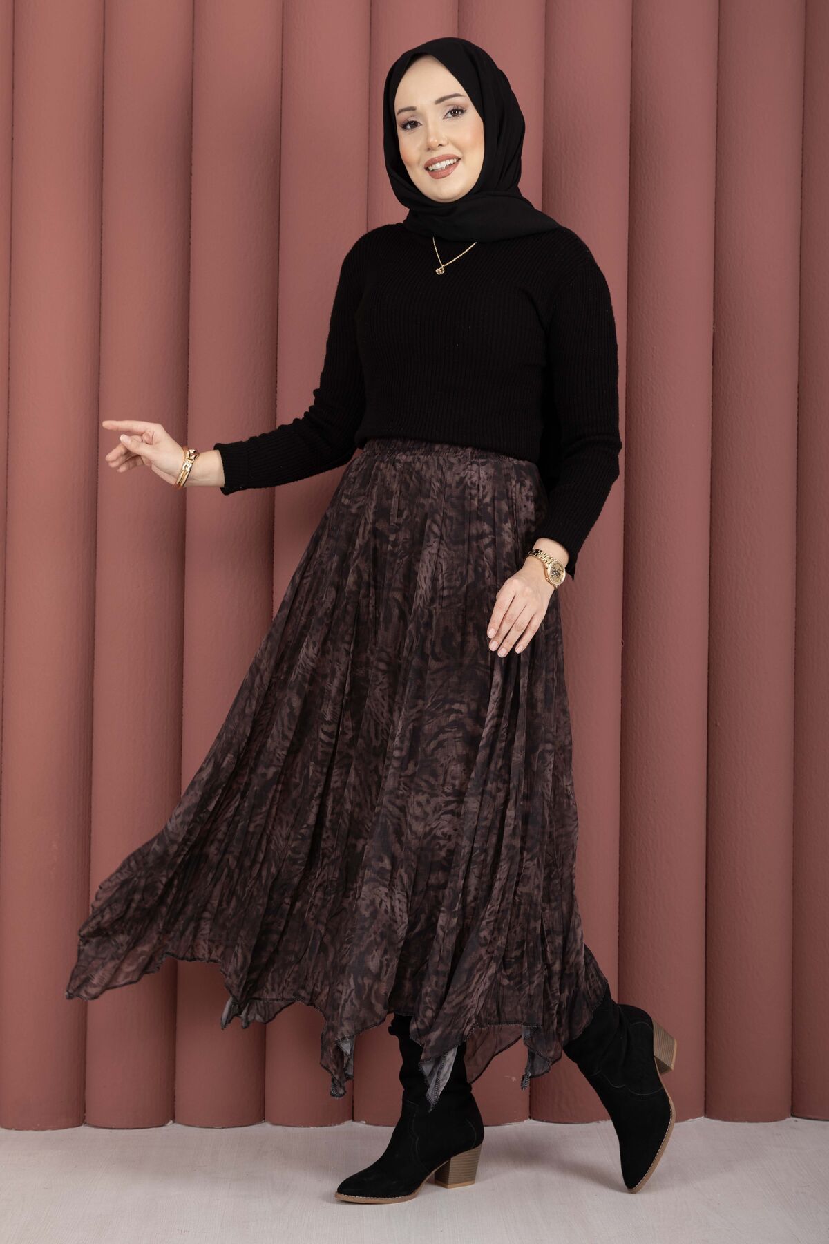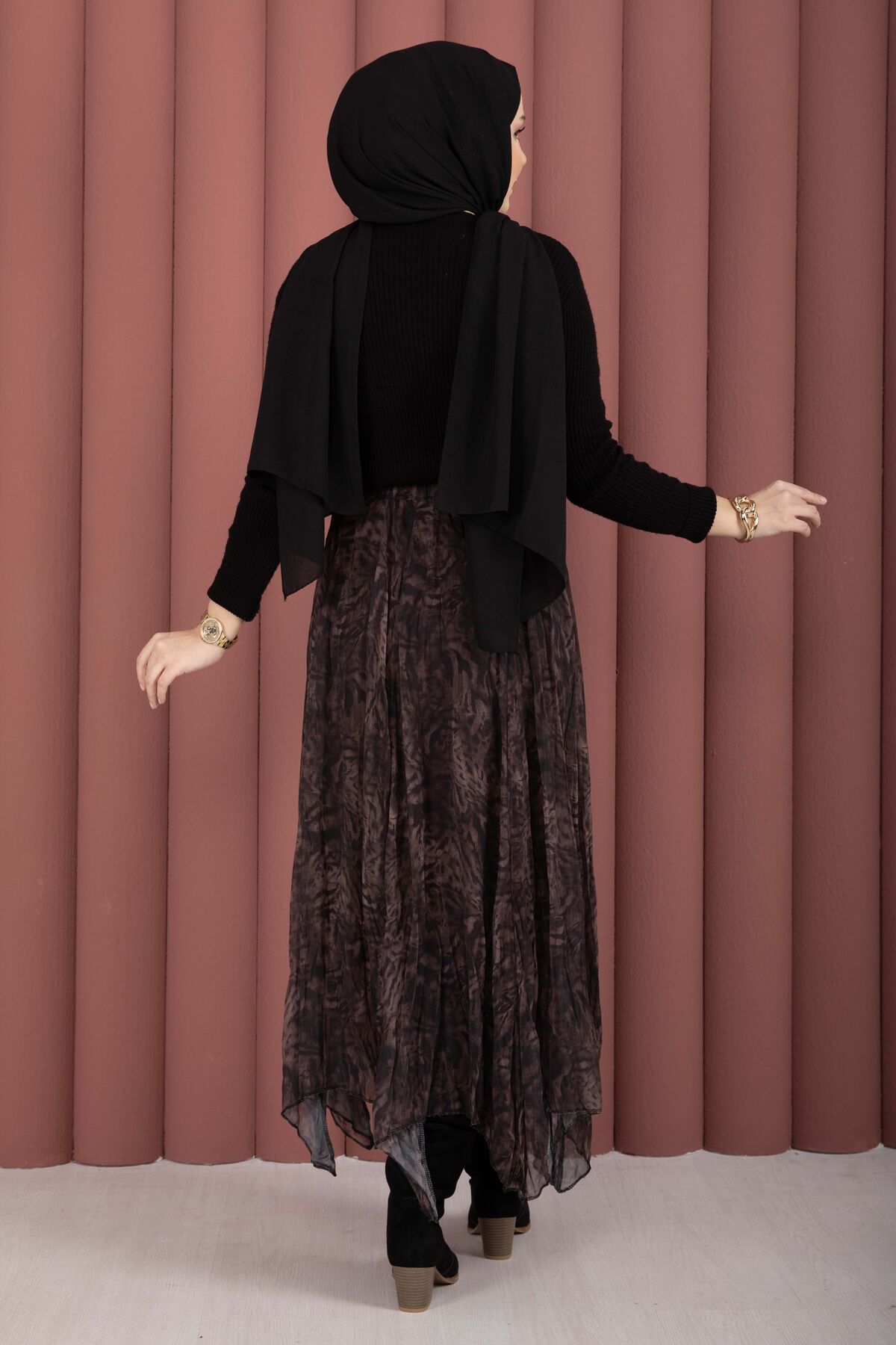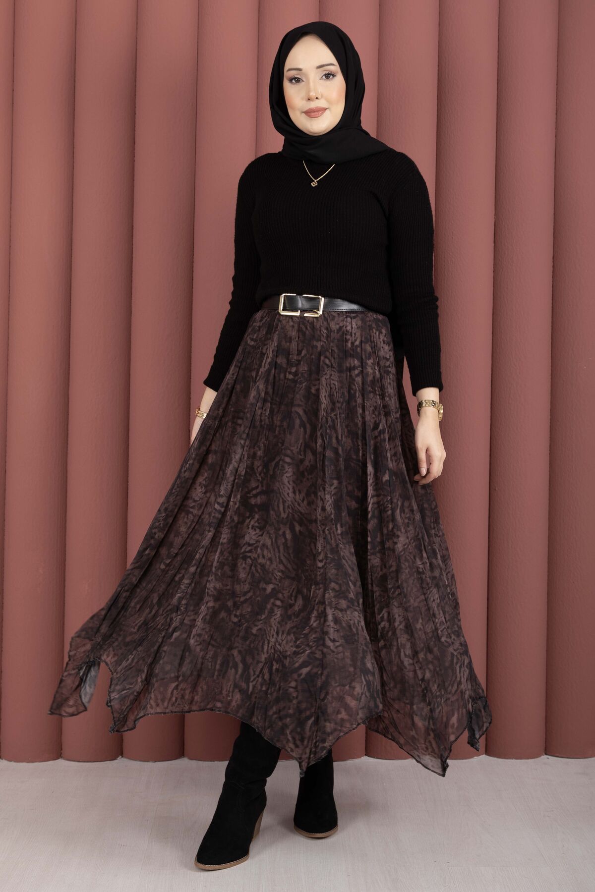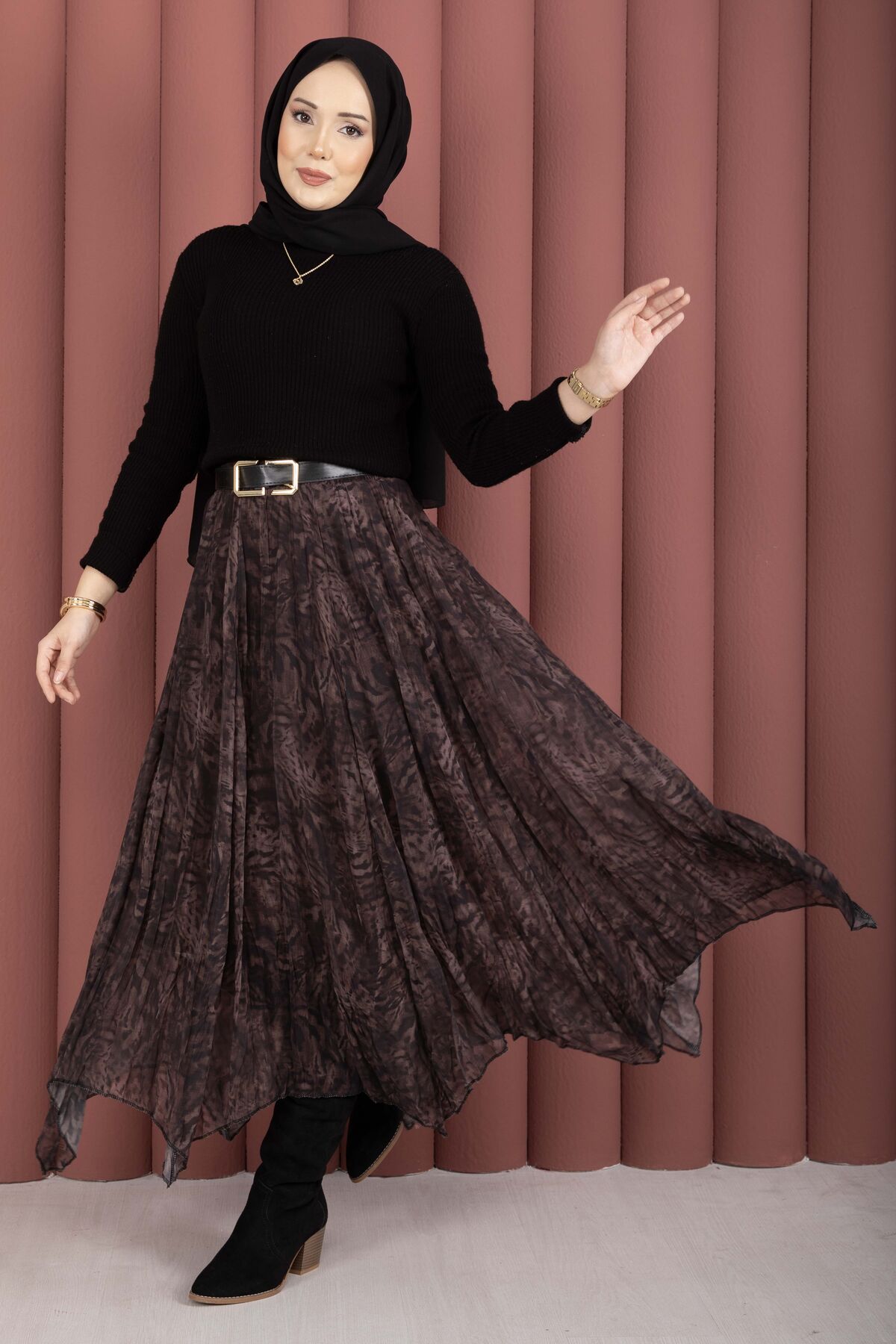 Flok Baskılı Şifon Etek Açık Kahve