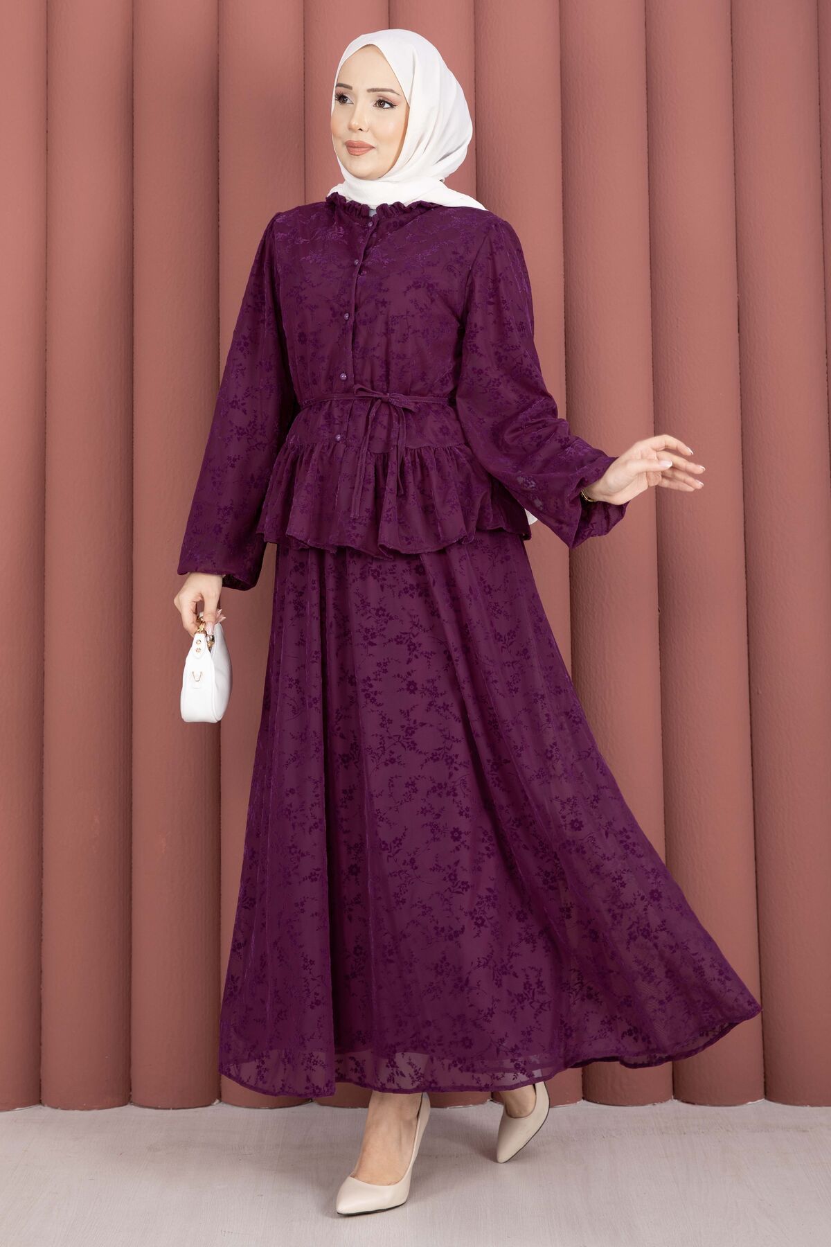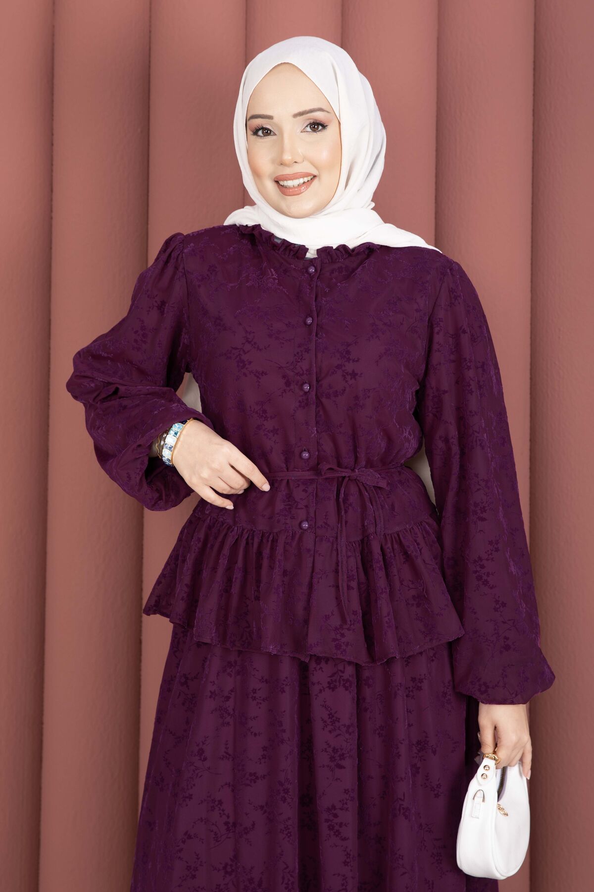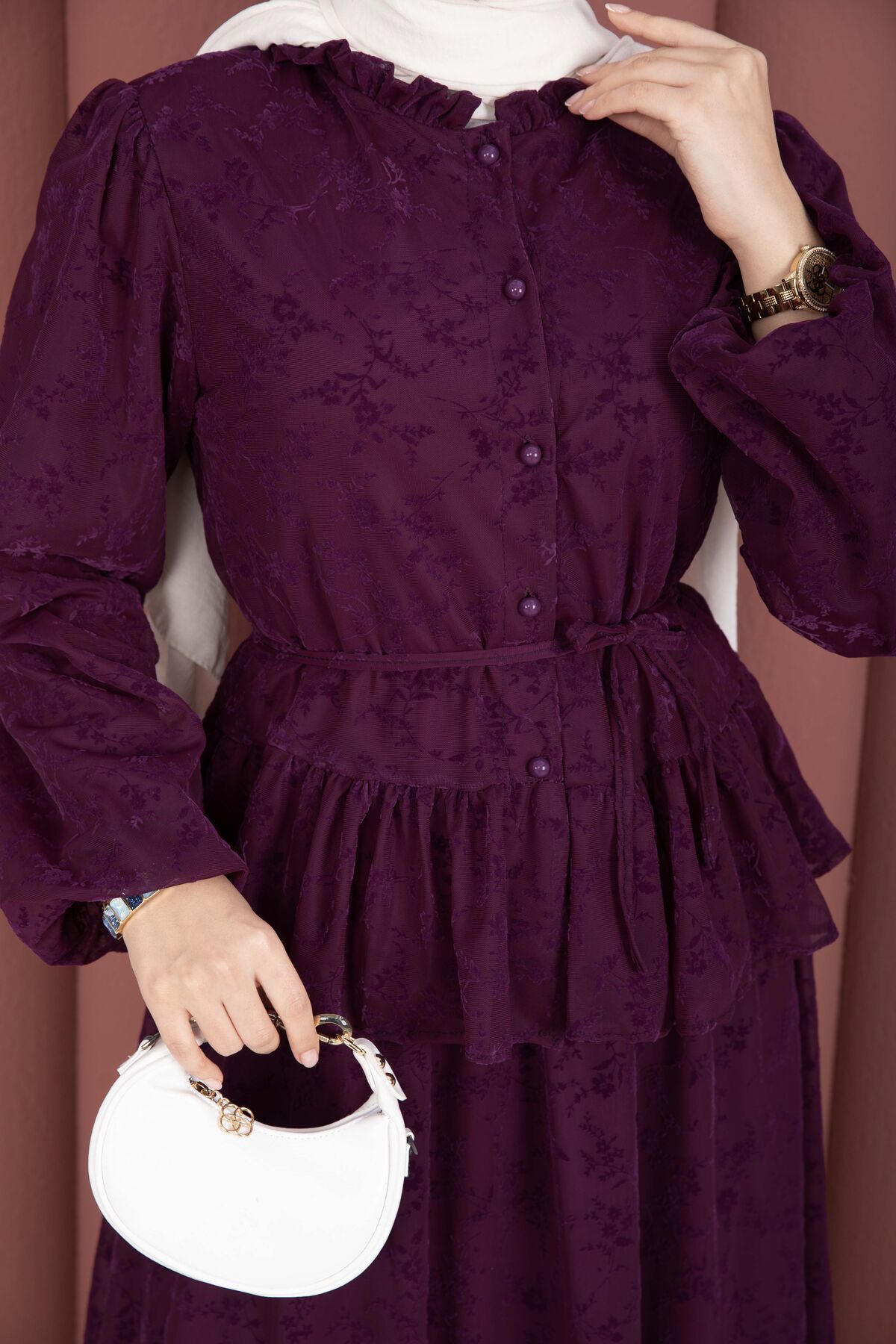 Flok Baskılı Yaka Fırfır Detaylı İçi Astarlı Etek Takım Mürdüm