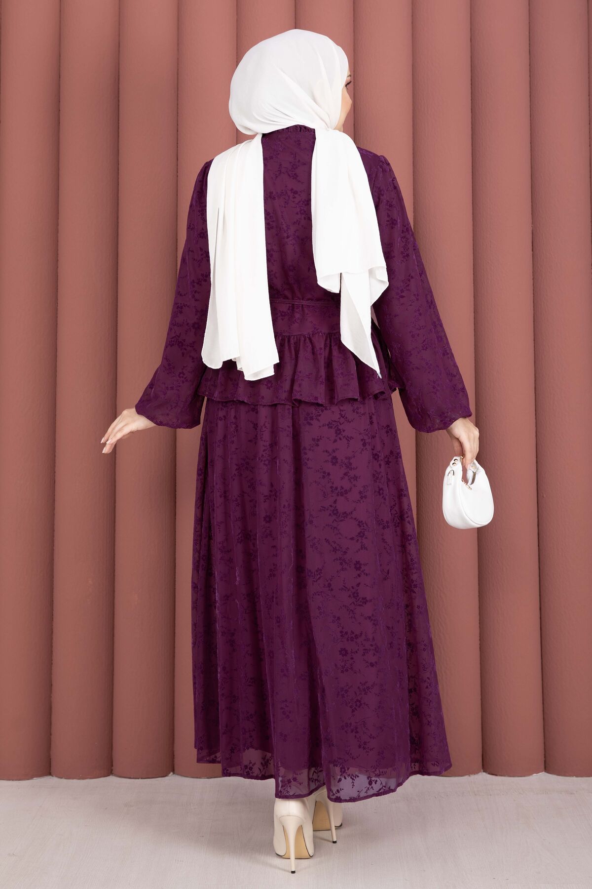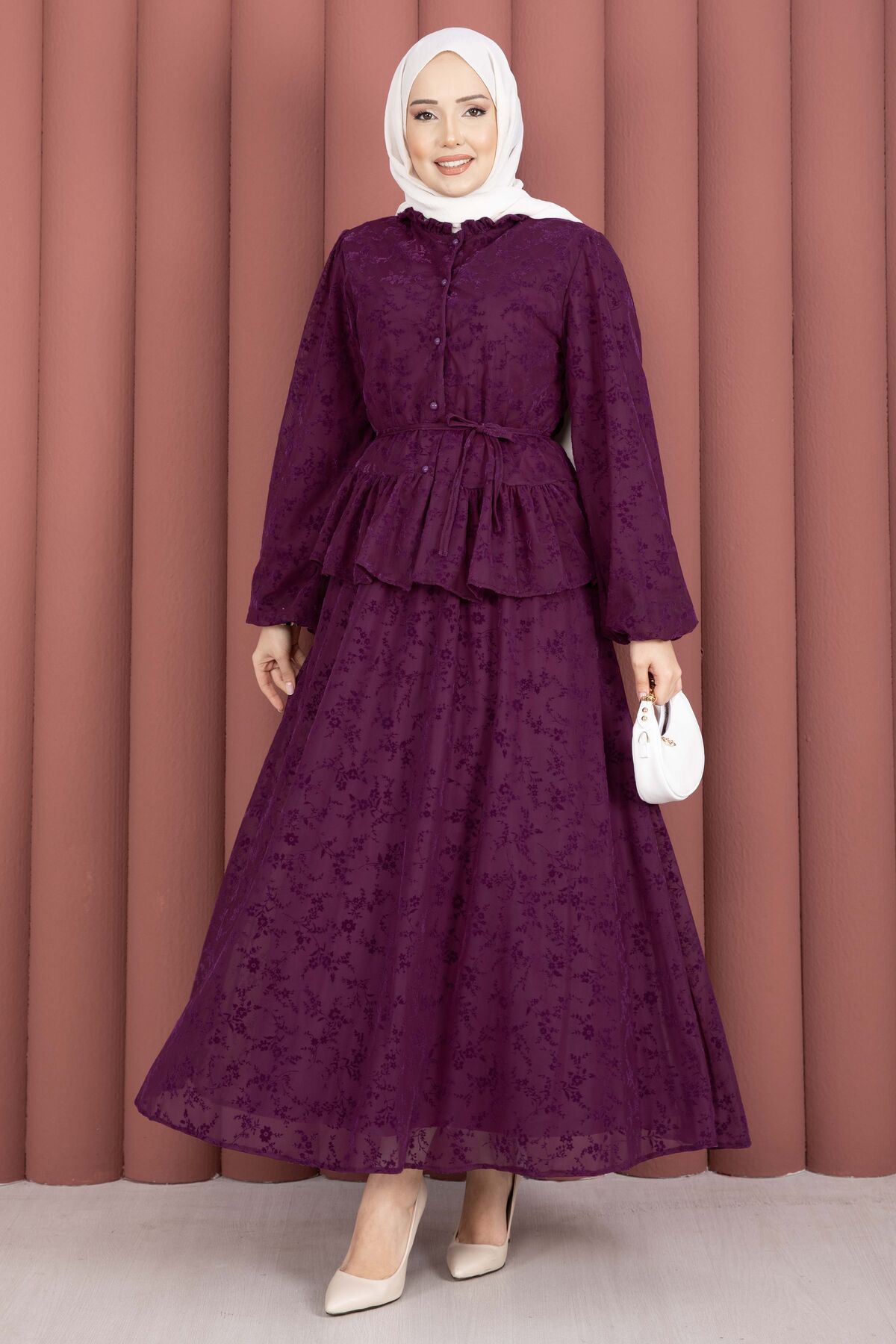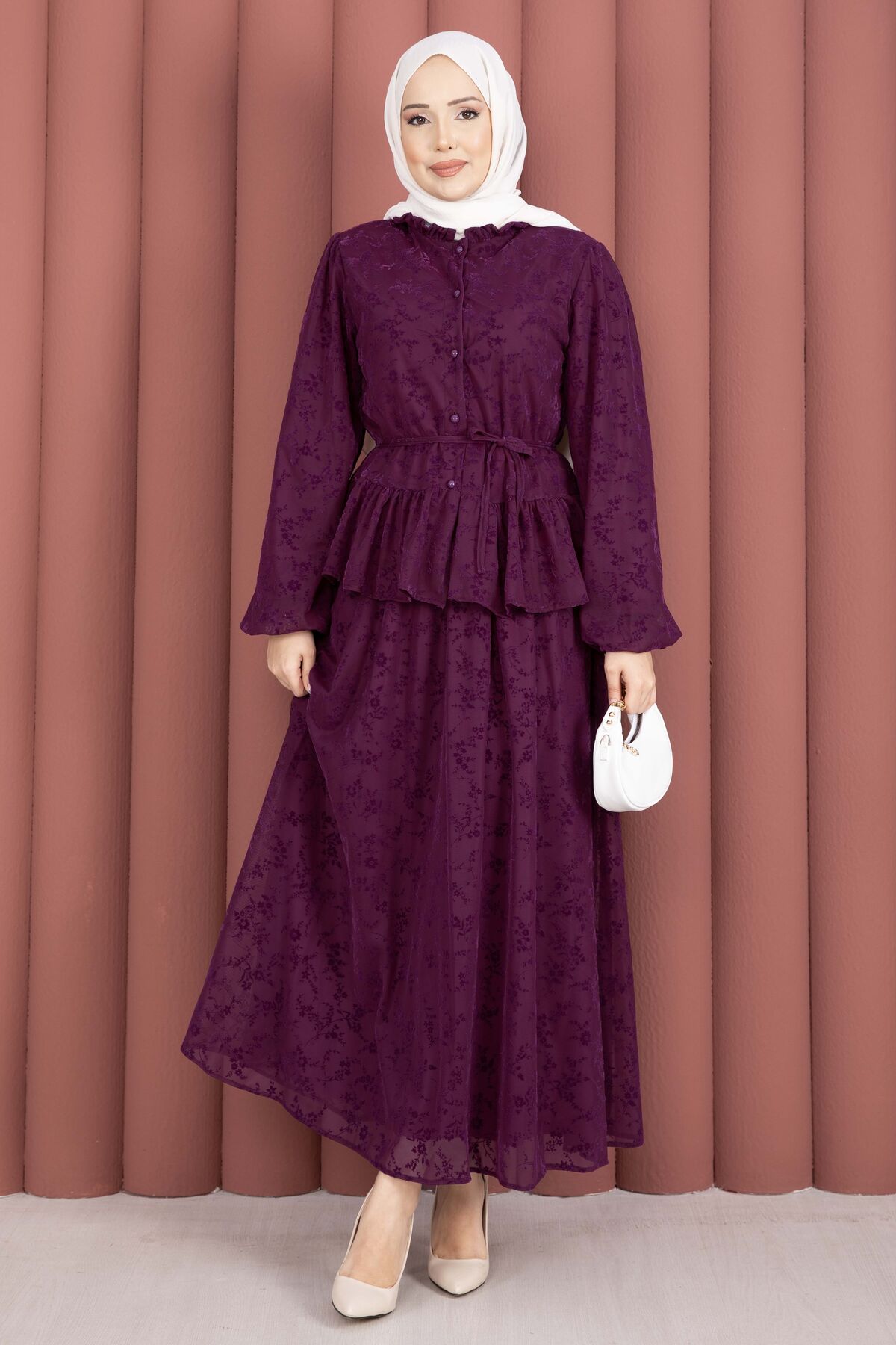 Flok Baskılı Yaka Fırfır Detaylı İçi Astarlı Etek Takım Mürdüm