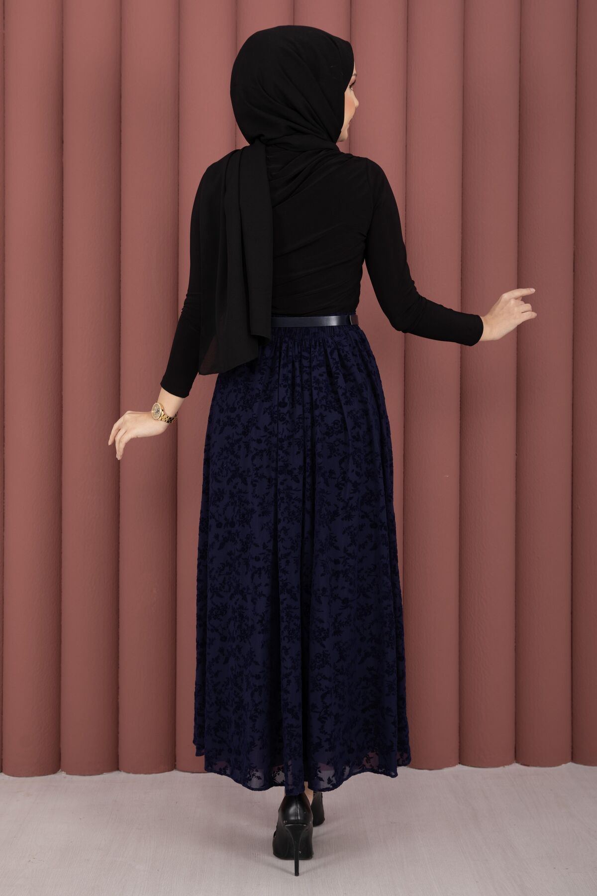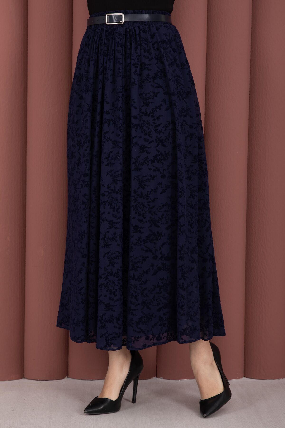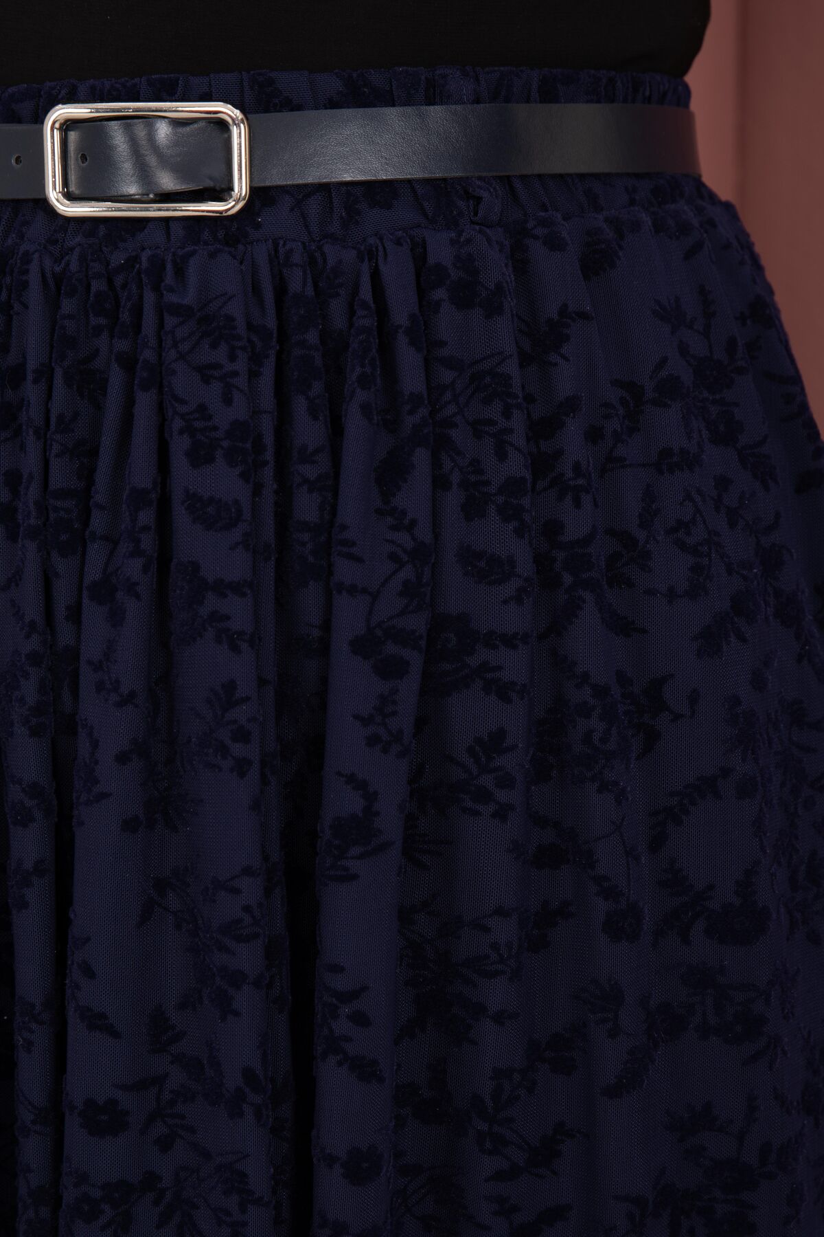 Flok Desen Kemerli Tül Etek Lacivert