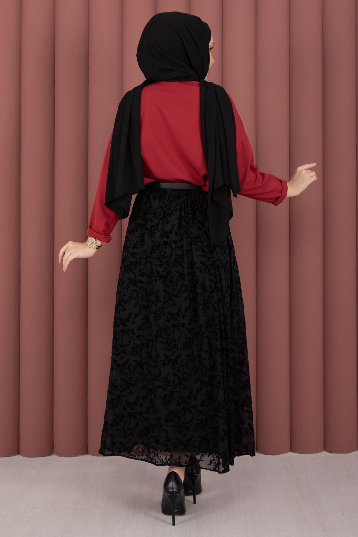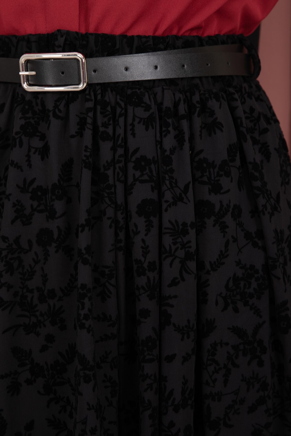 Flok Desen Kemerli Tül Etek Siyah