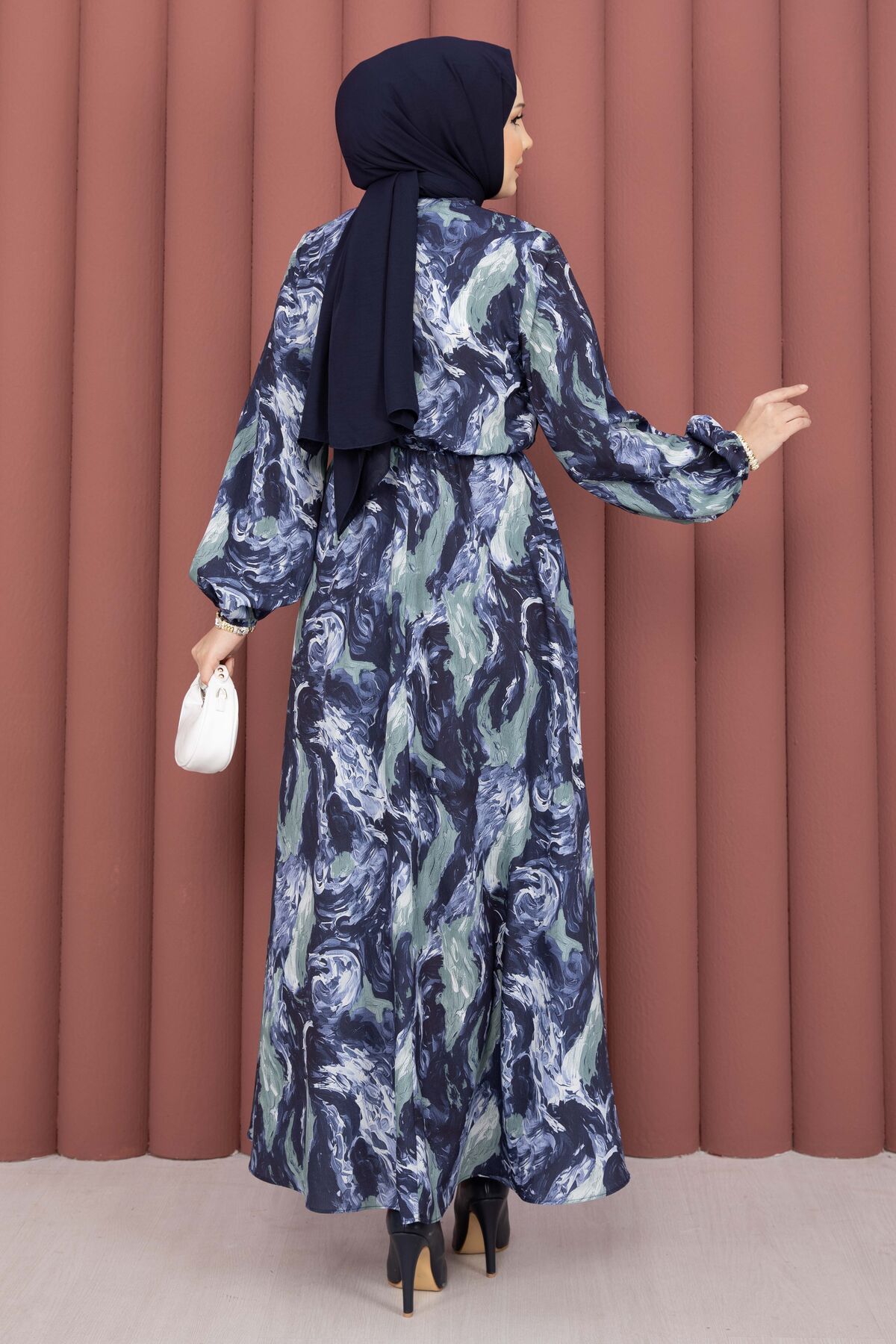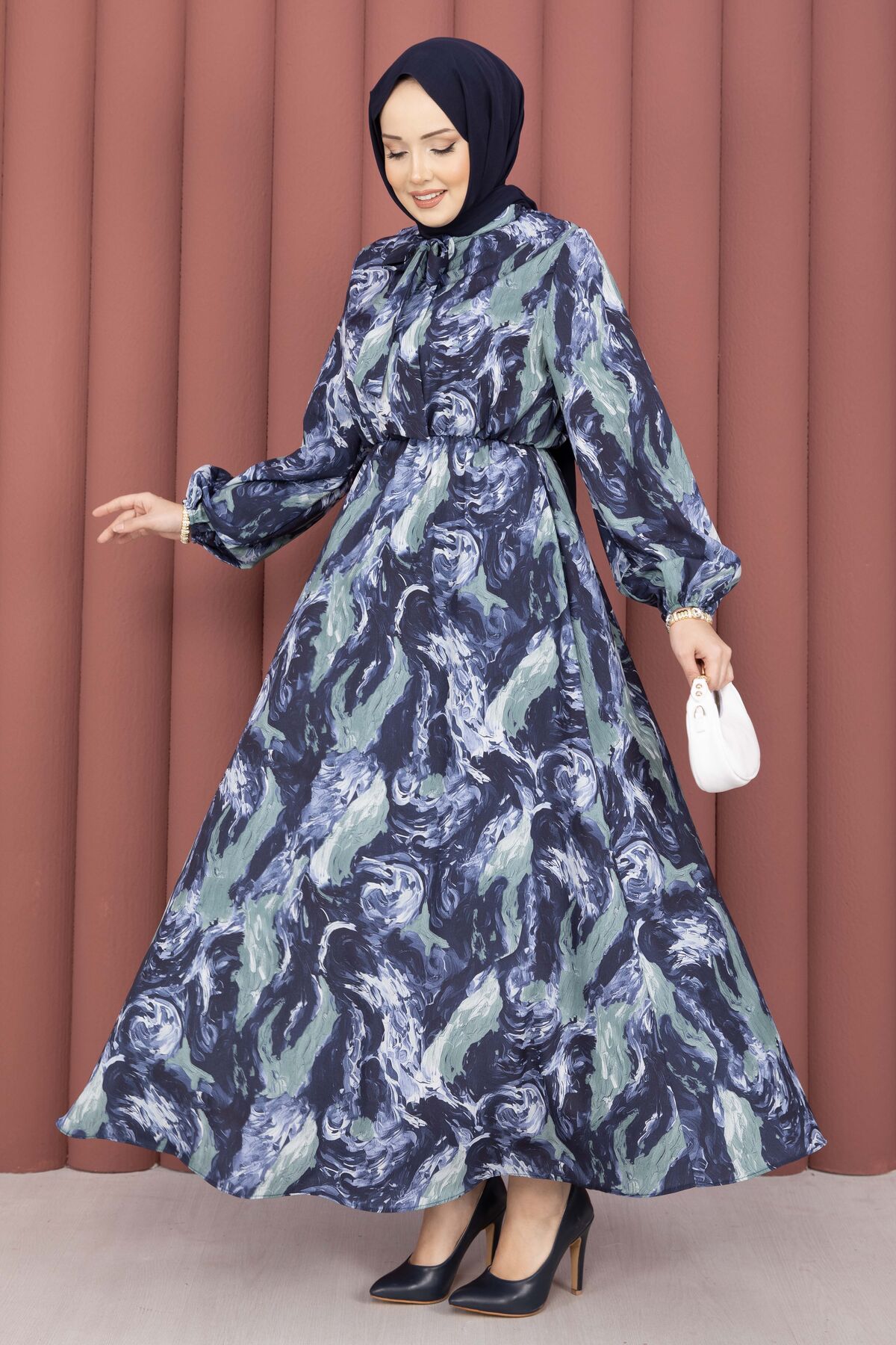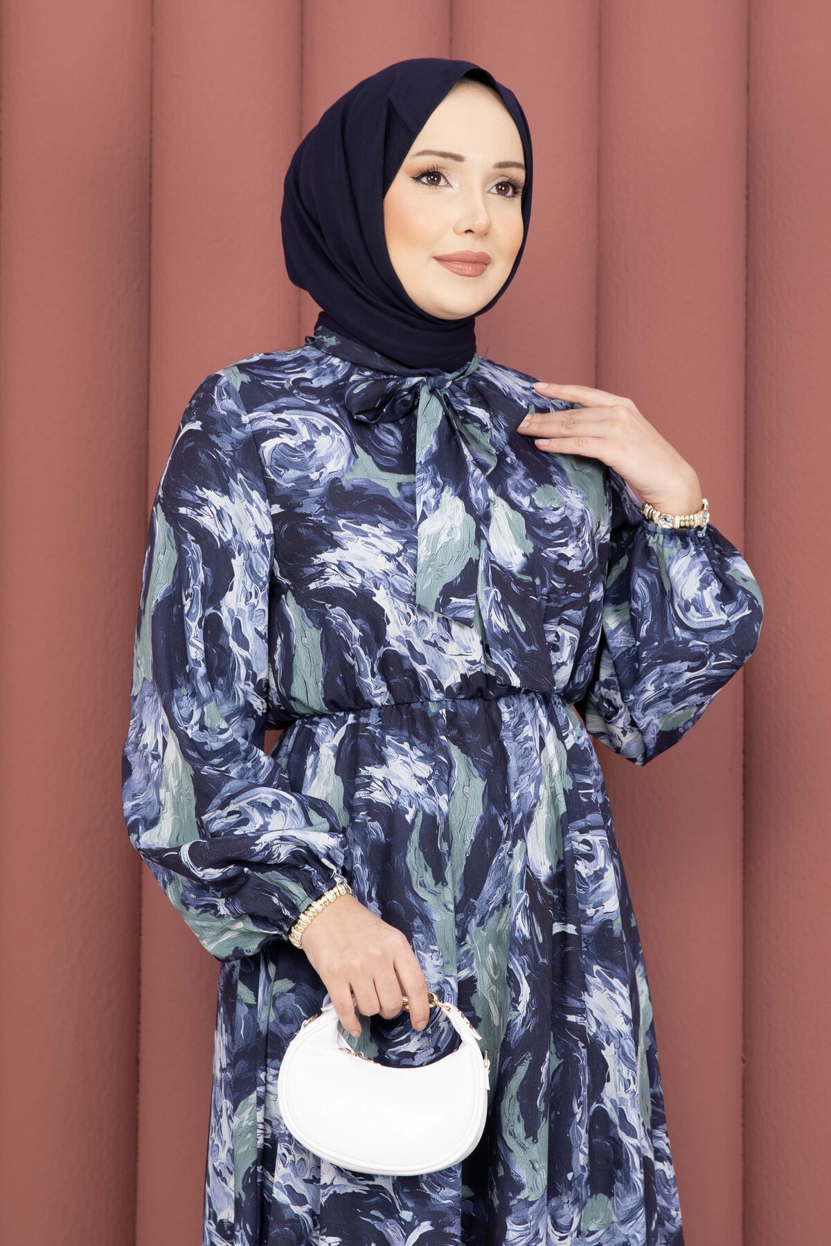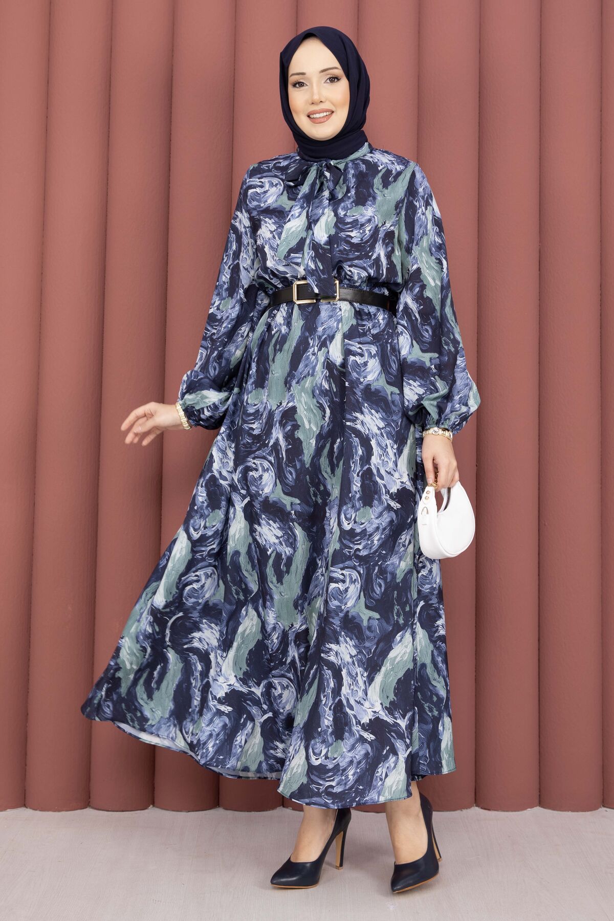 Fular Yakalı Desenli Tesettür Elbise Lacivert