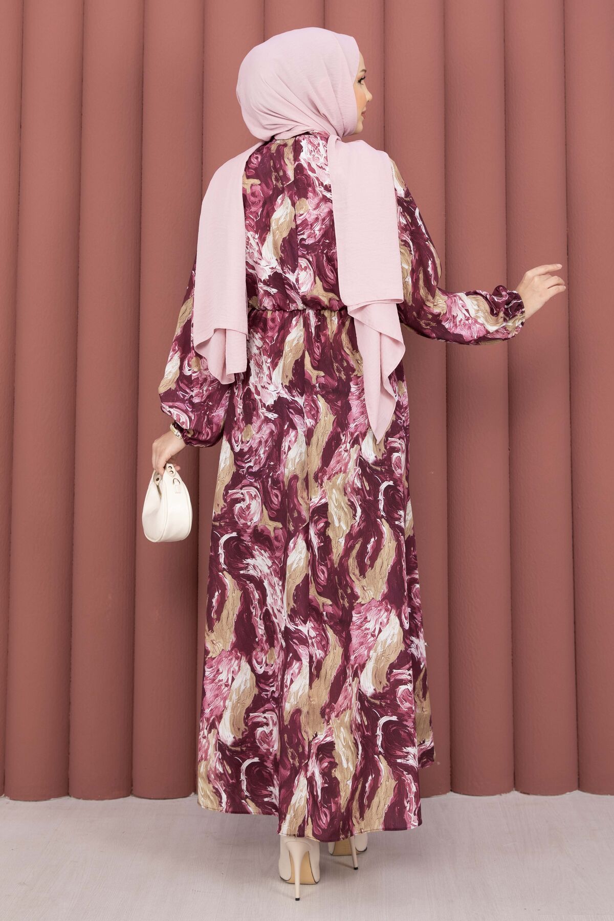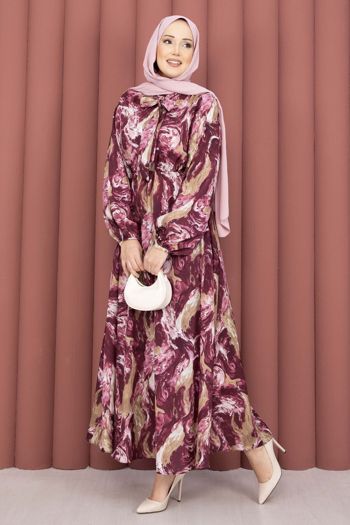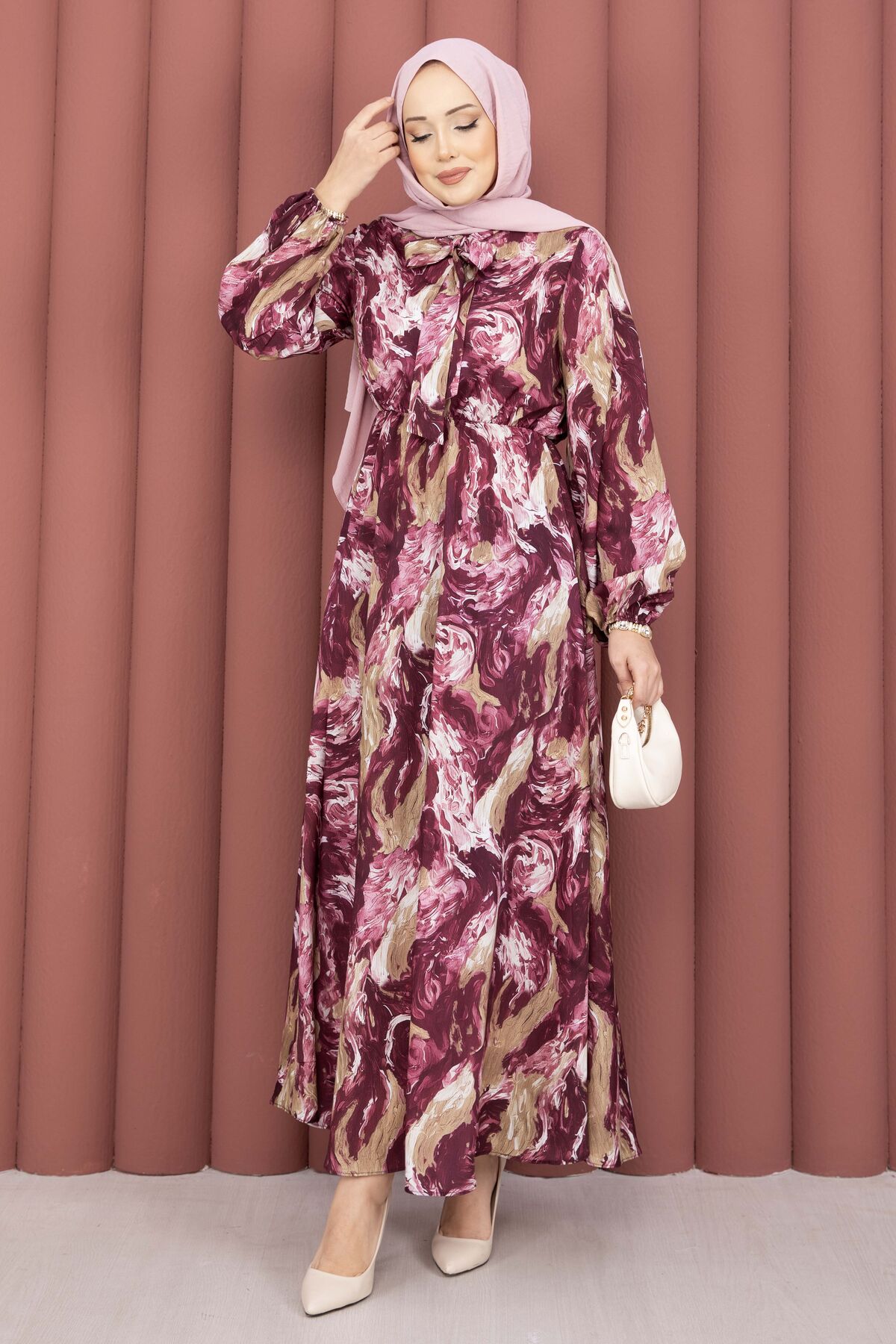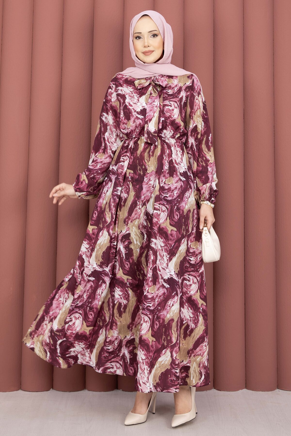 Zarif şal deseni ve akışkan yapısıyla öne çıkan bu model, hem günlük hem de özel kombinlerde şık bir görünüm sunar. Fular yaka detayı elbiseye modern bir hava katarken, bel kısmındaki lastik ve büzgü formu vücuda uyum sağlar. Dökümlü yapısı sayesinde gün boyu konfor sağlar.