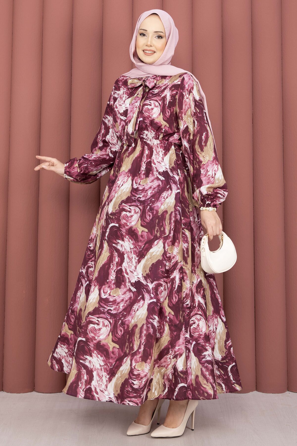 Fular Yakalı Desenli Tesettür Elbise Siyah