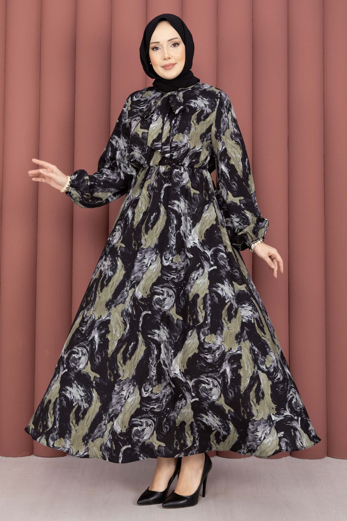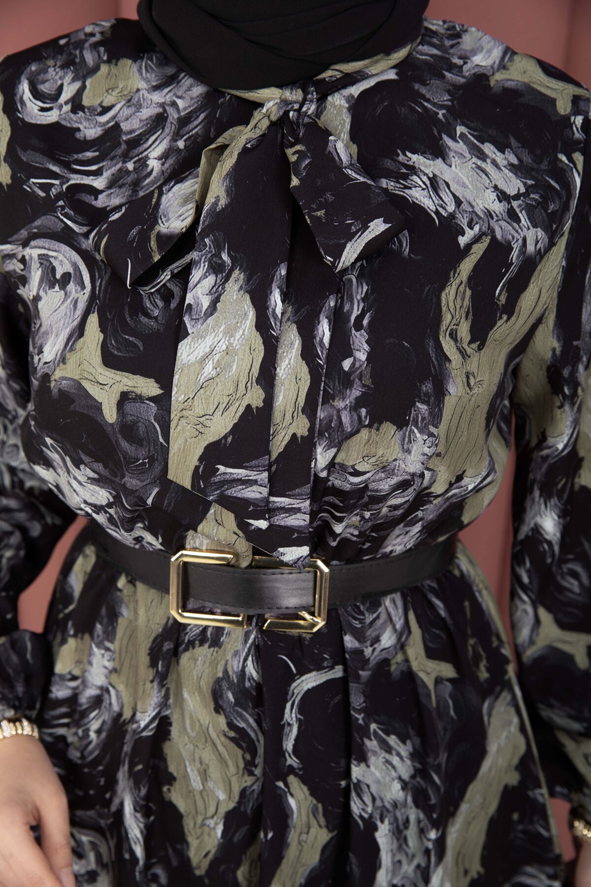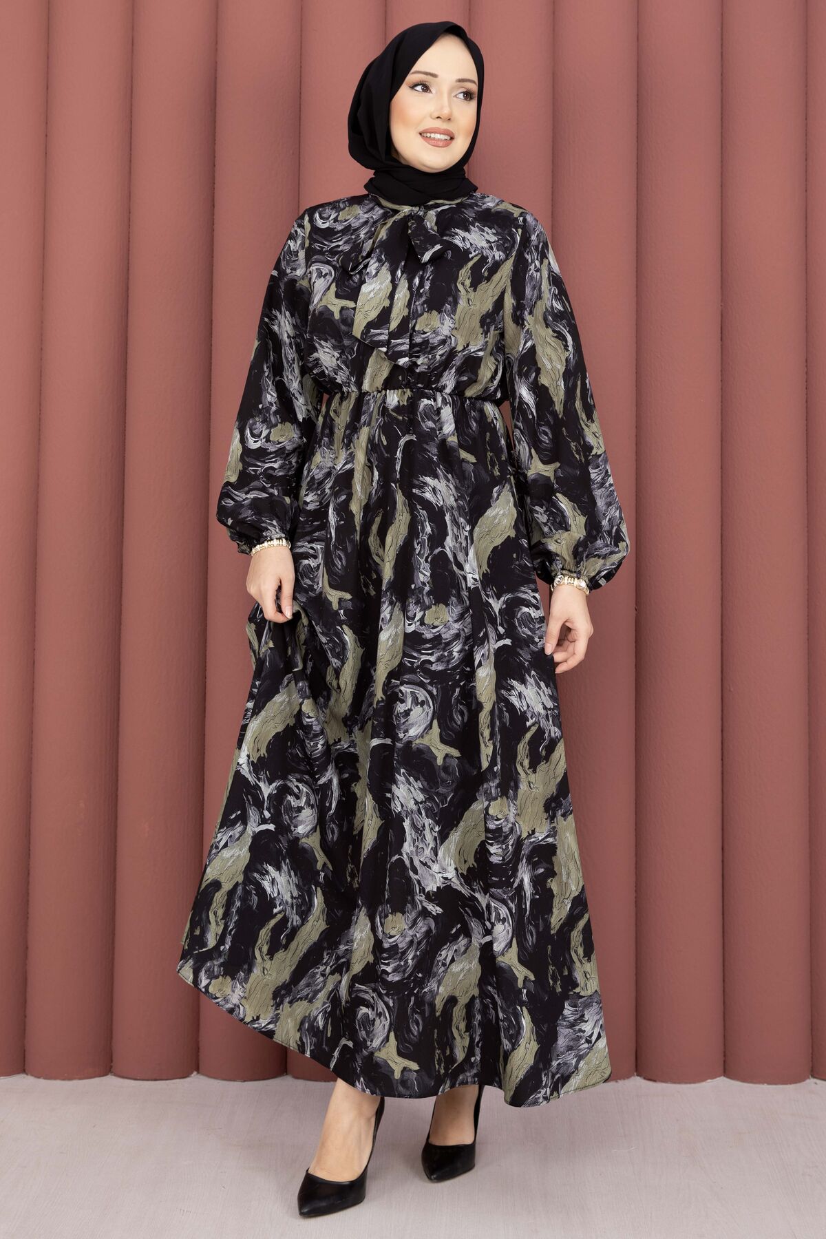 Fular Yakalı Desenli Tesettür Elbise Siyah