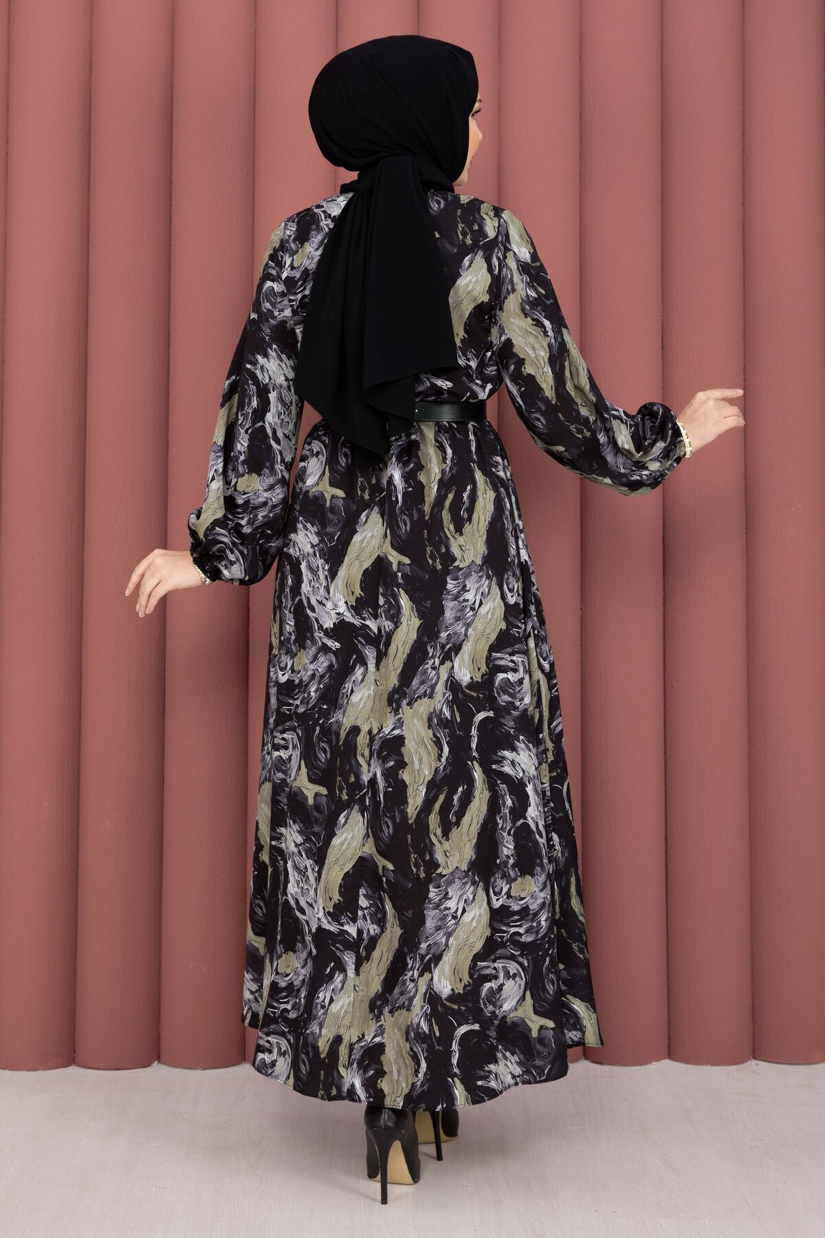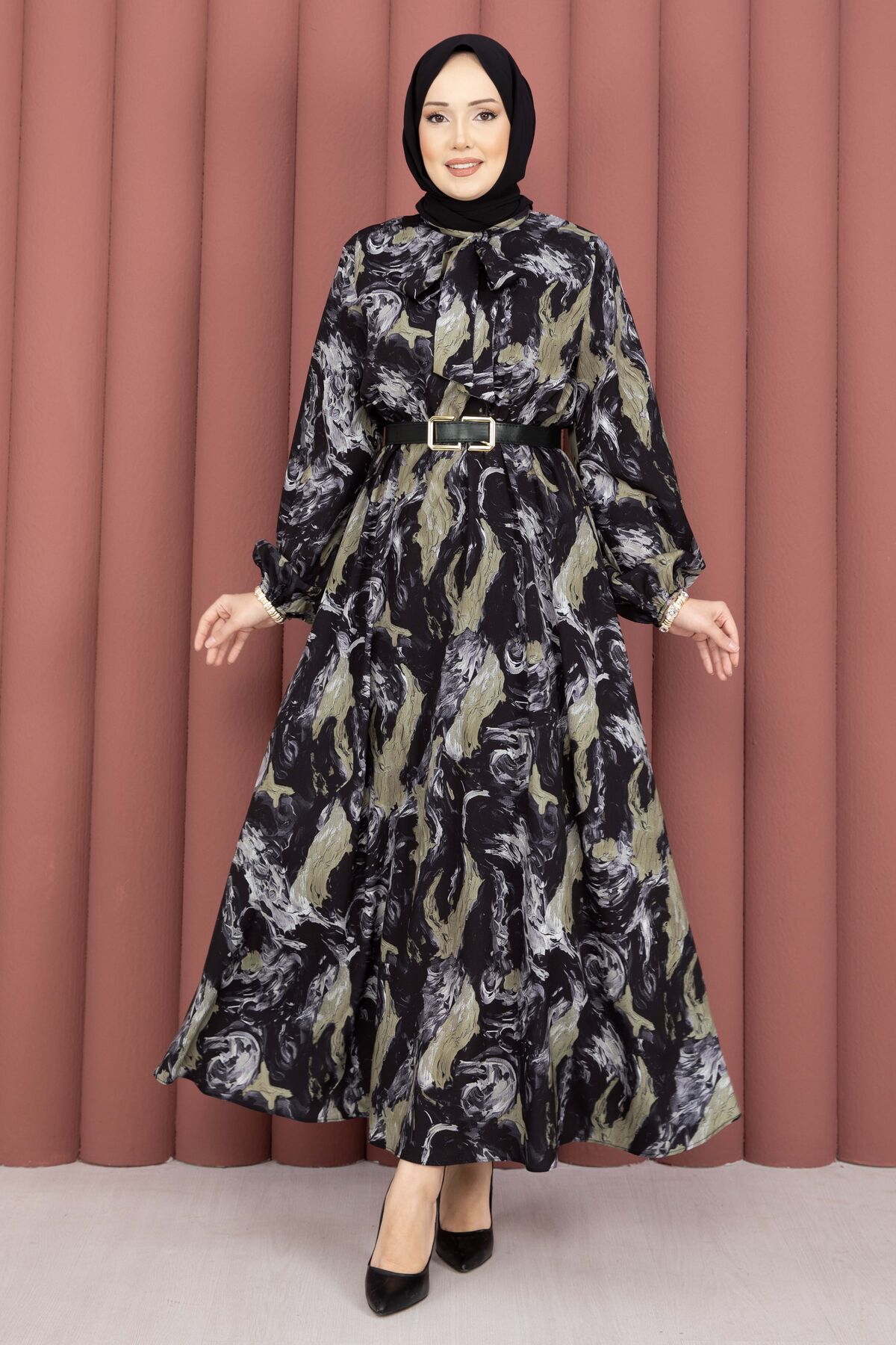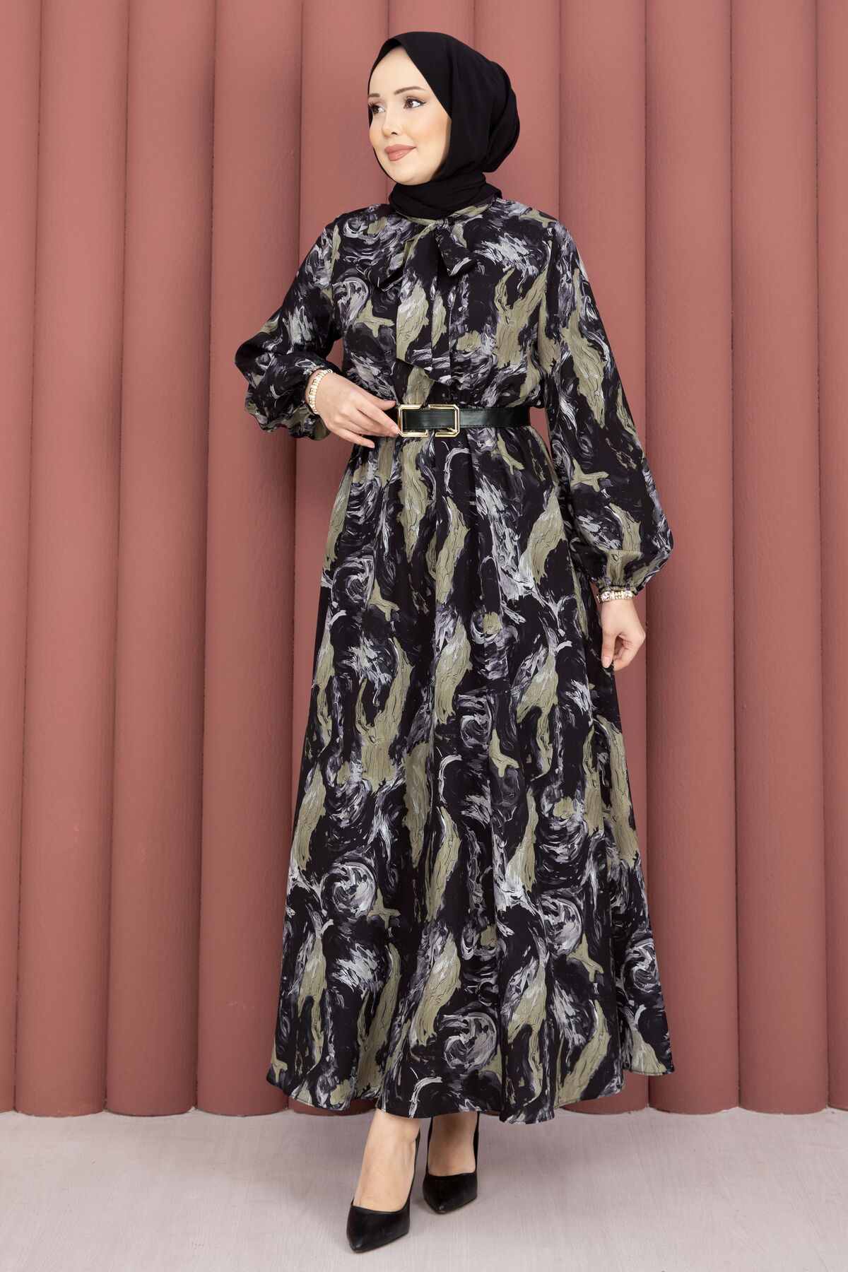 Fular Yakalı Desenli Tesettür Elbise Siyah