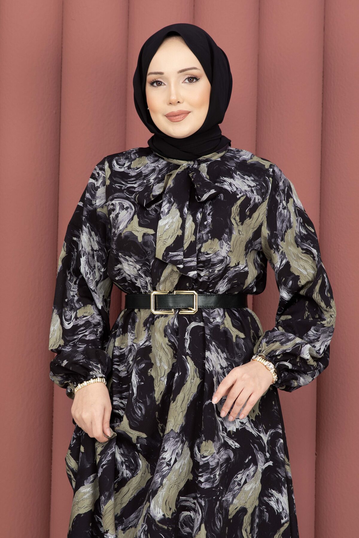 Fular Yakalı Desenli Tesettür Elbise Siyah Yorumları